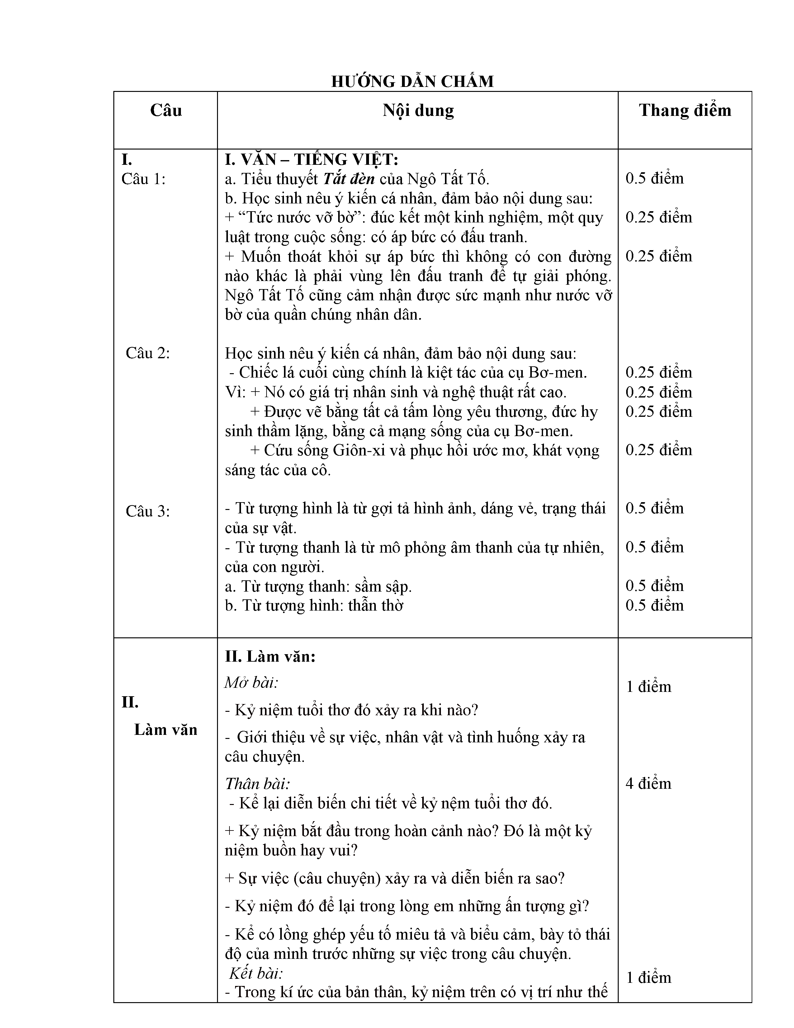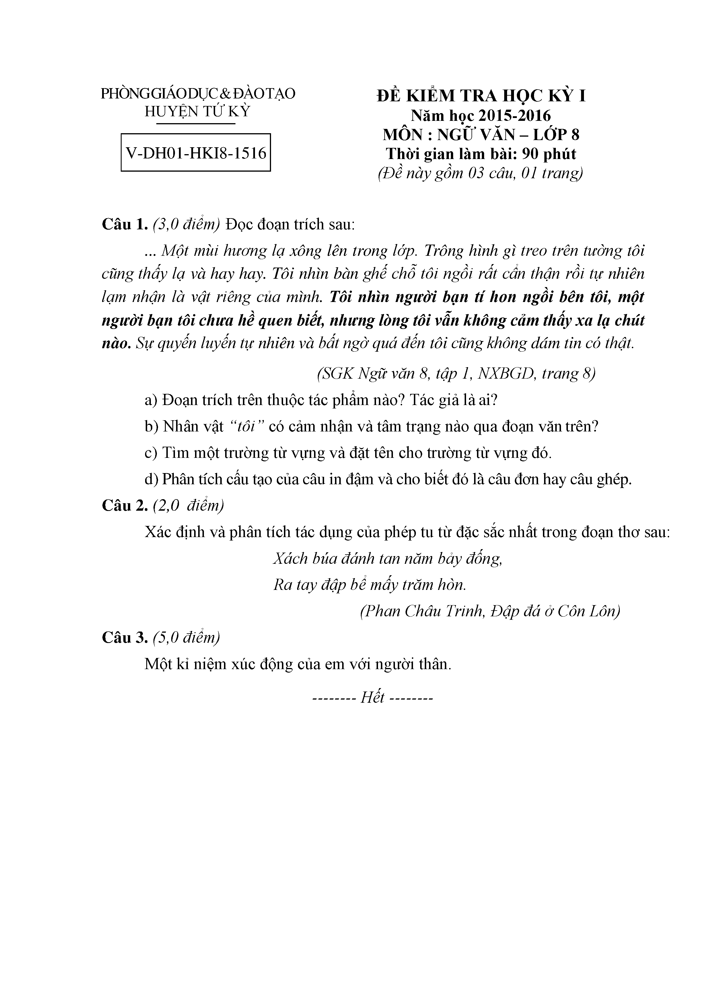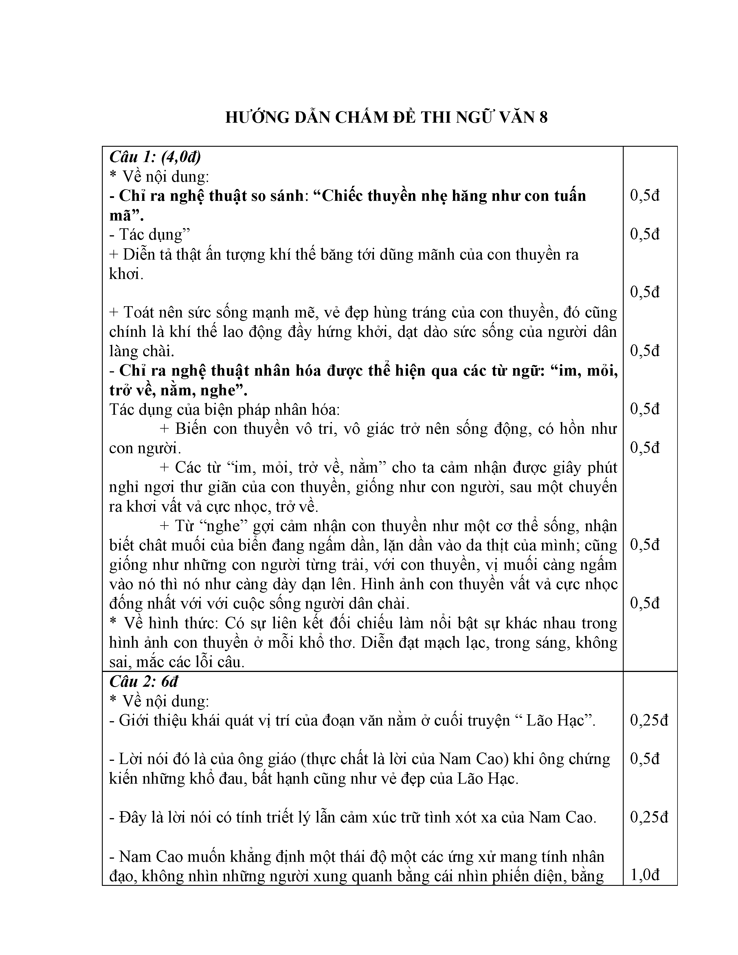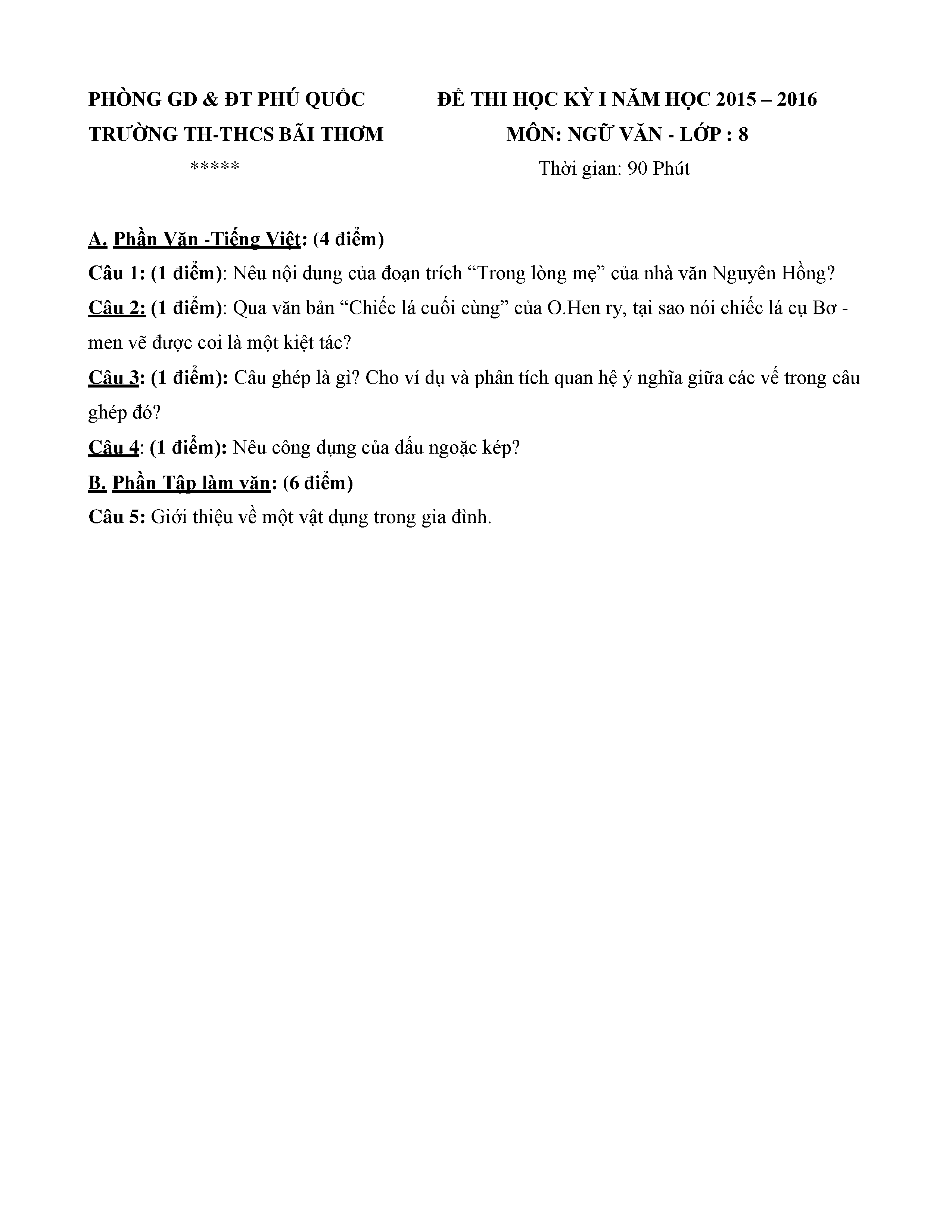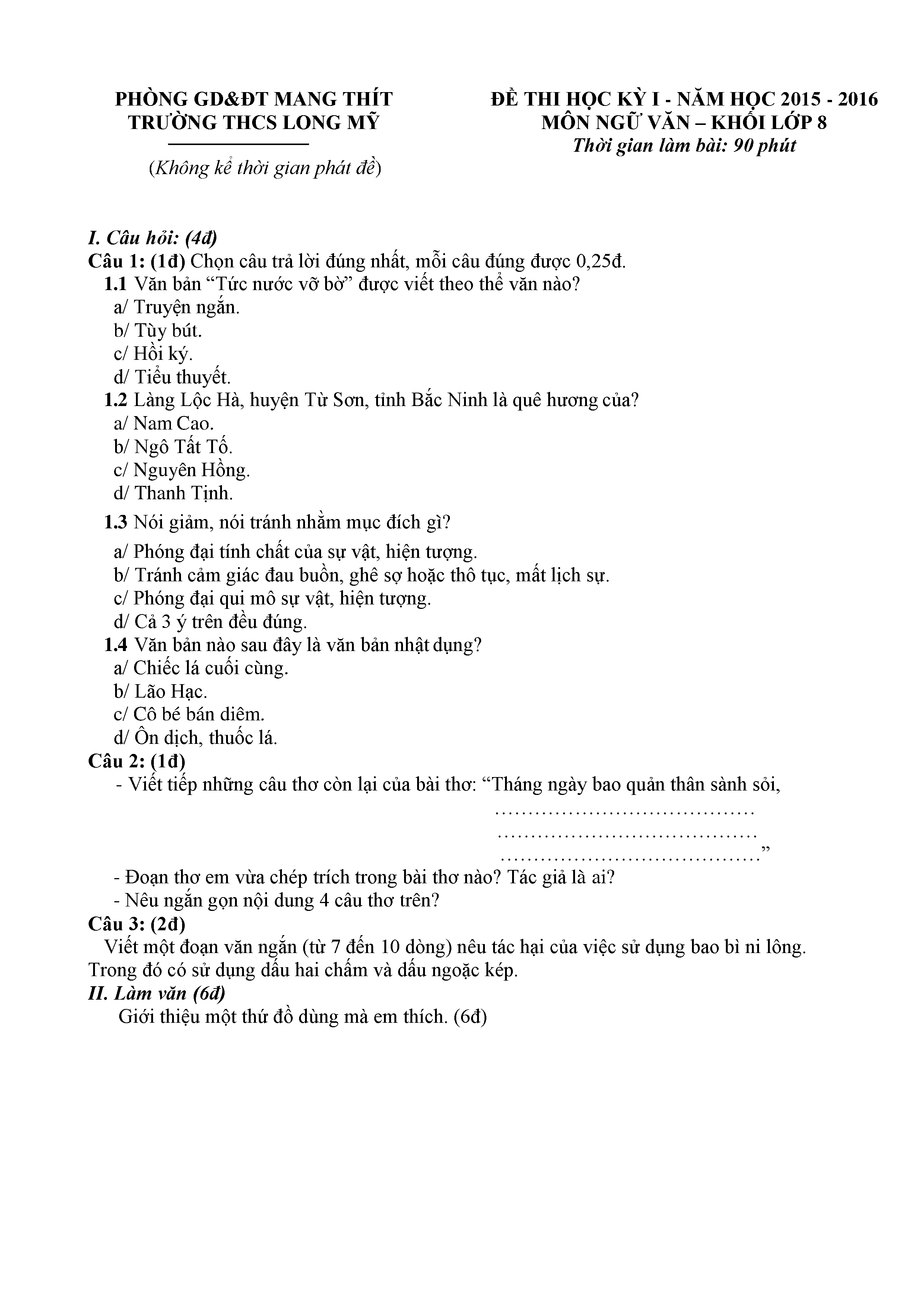 Đề thi học kì 1 lớp 8 môn Ngữ Văn (có đáp án)