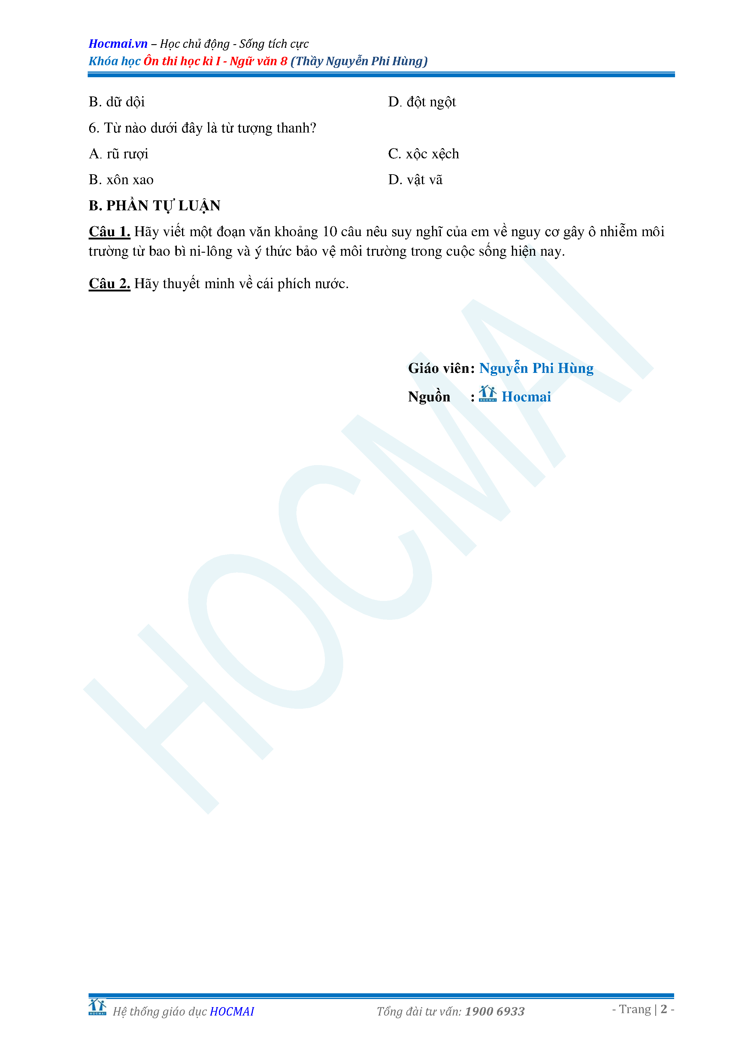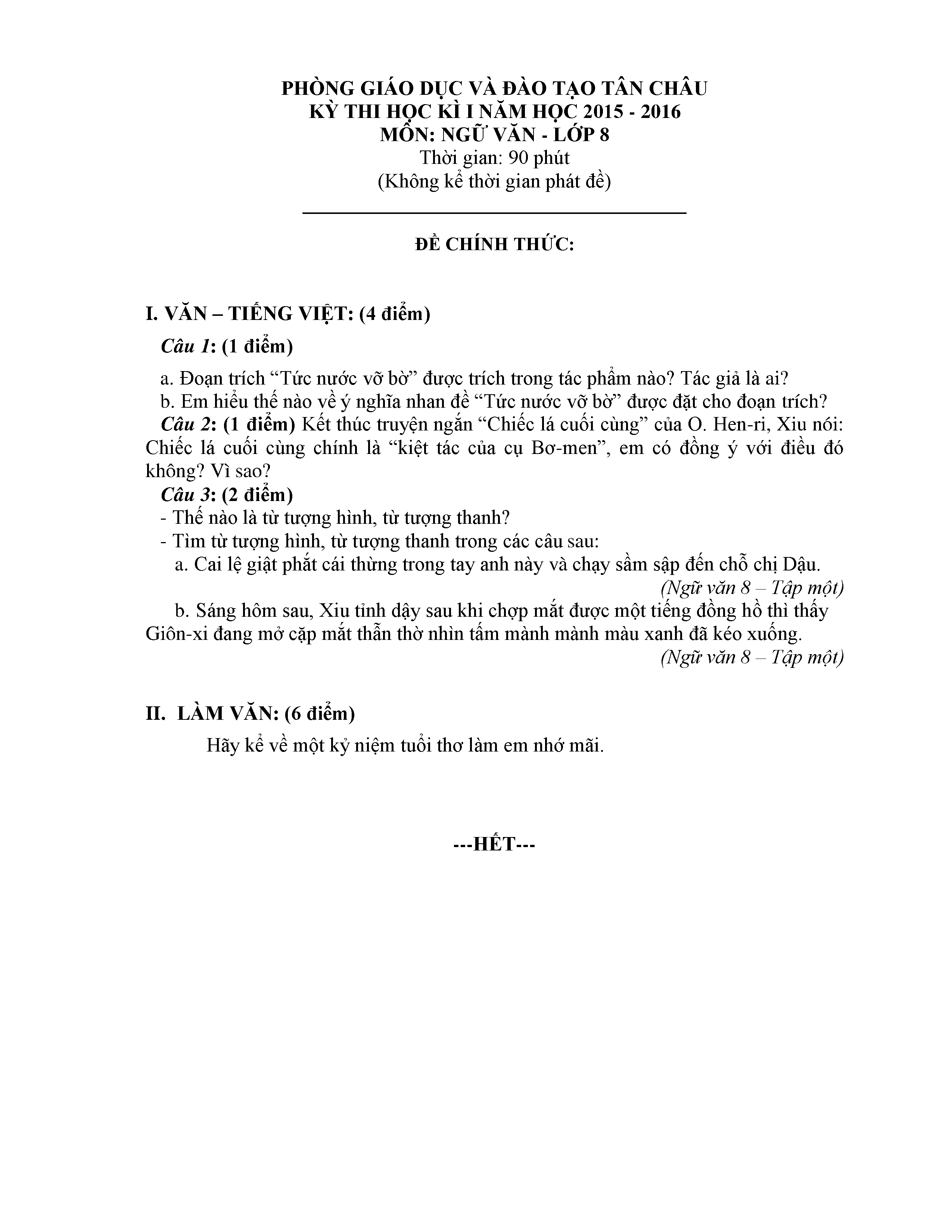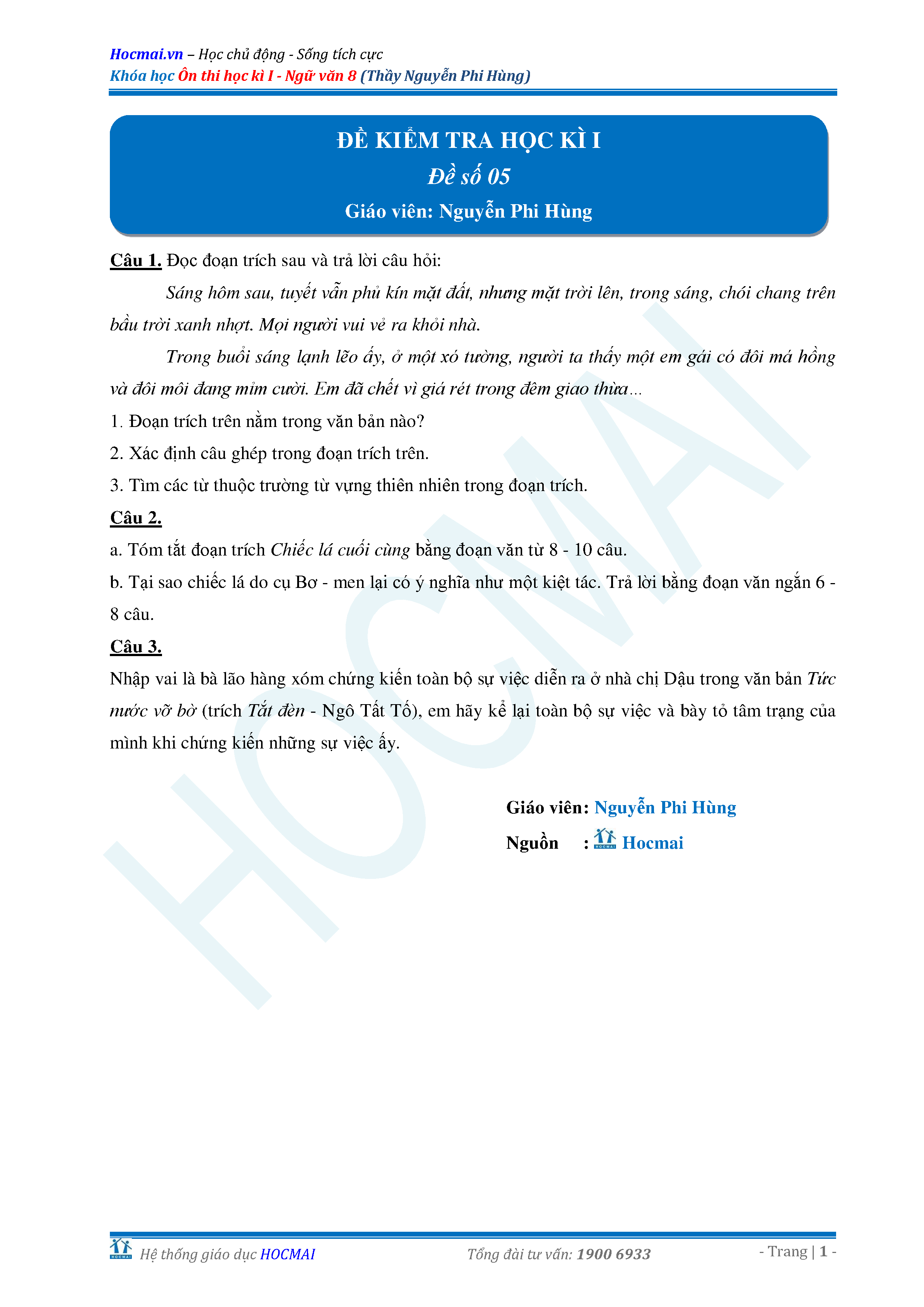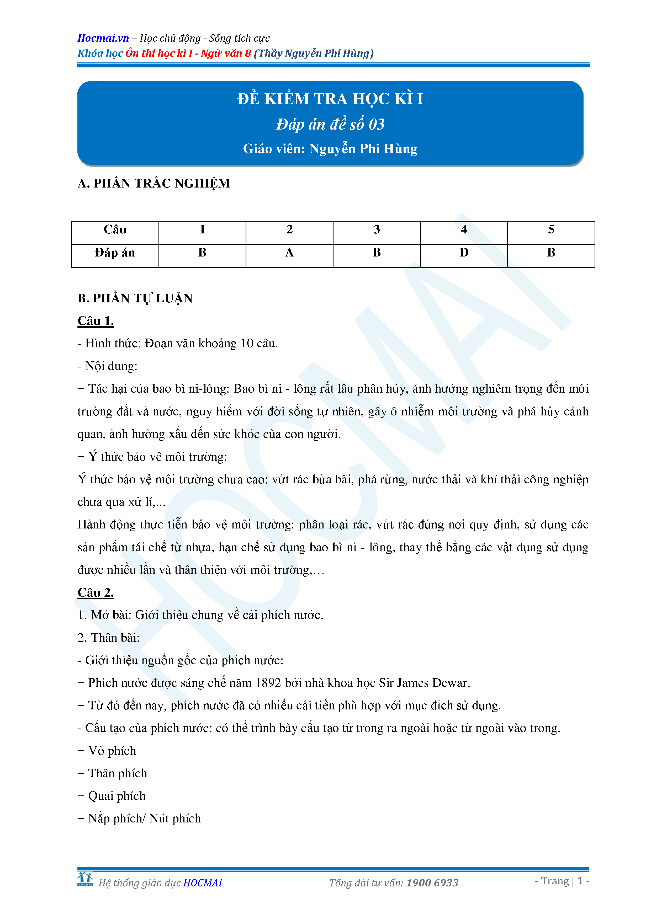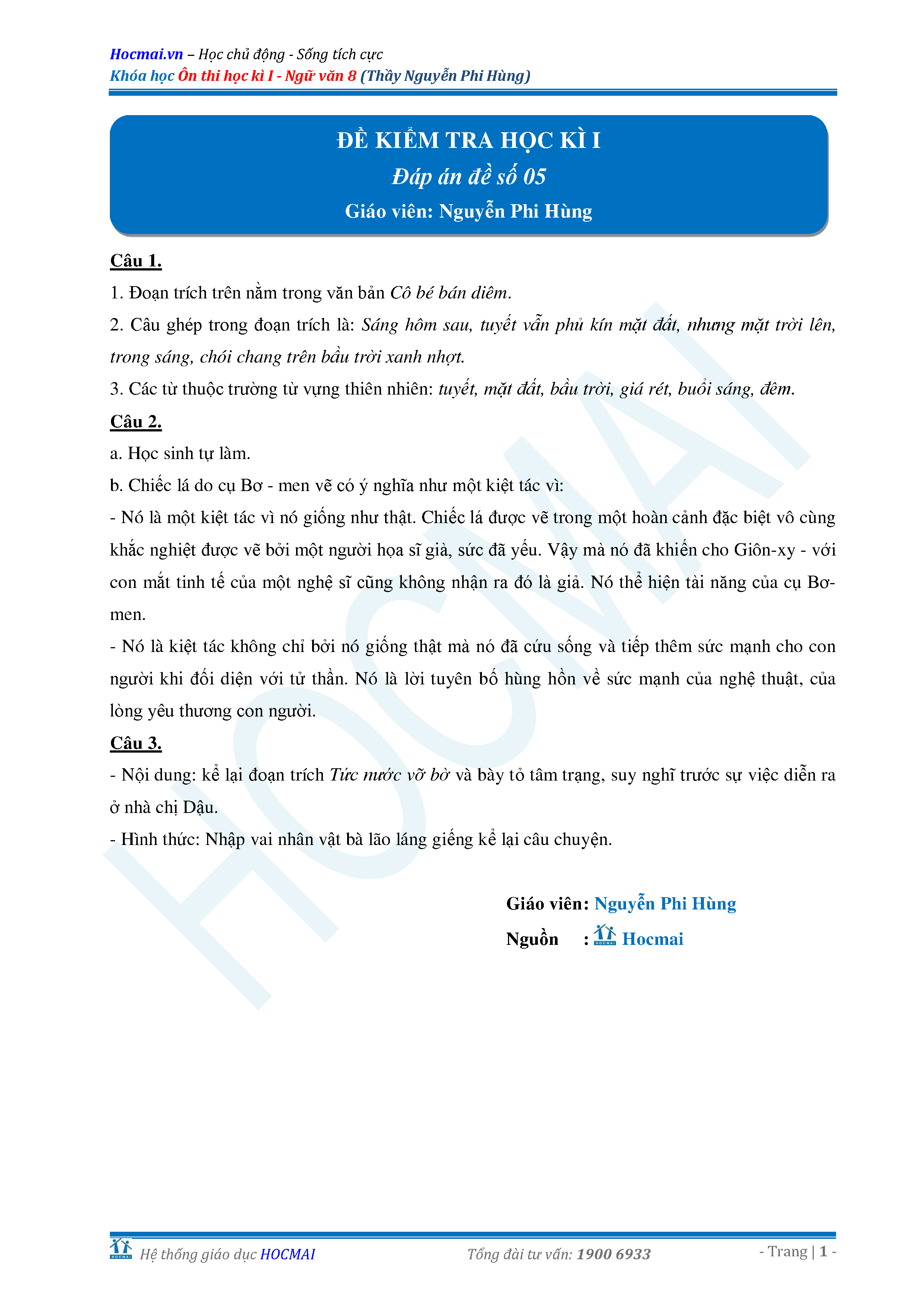 Đề thi học kì 1 lớp 8 môn Ngữ Văn (có đáp án)