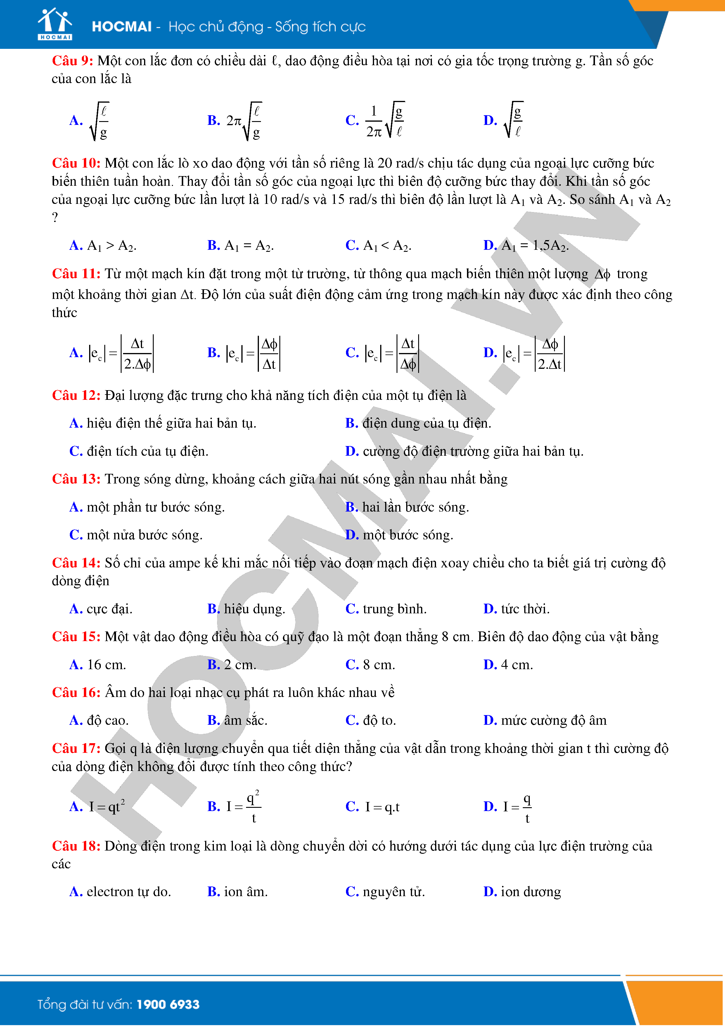 Đề thi thử THPTQG năm 2018 - Môn Vật Lý - Đề KSCL Học kì 1 - Nam Định