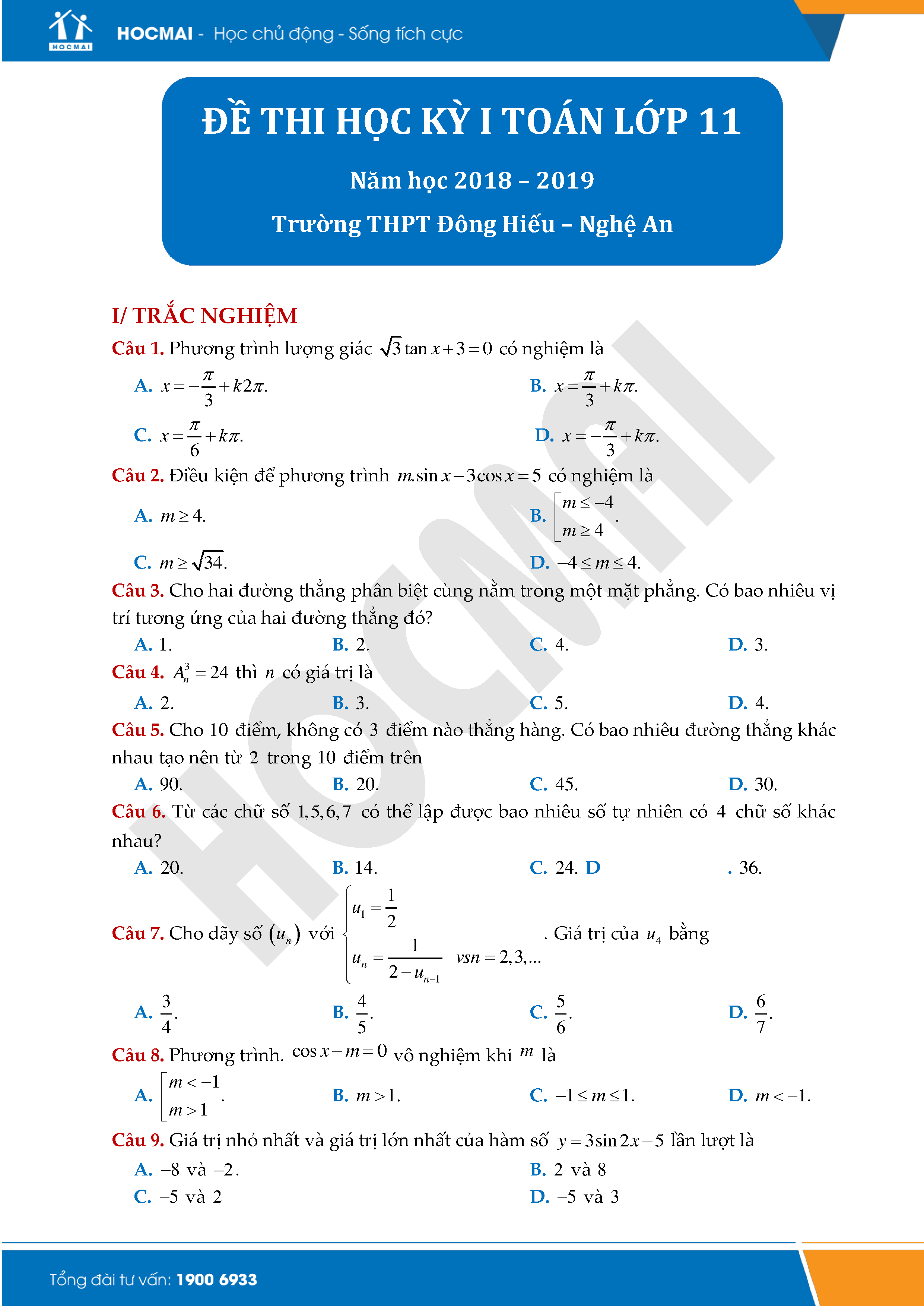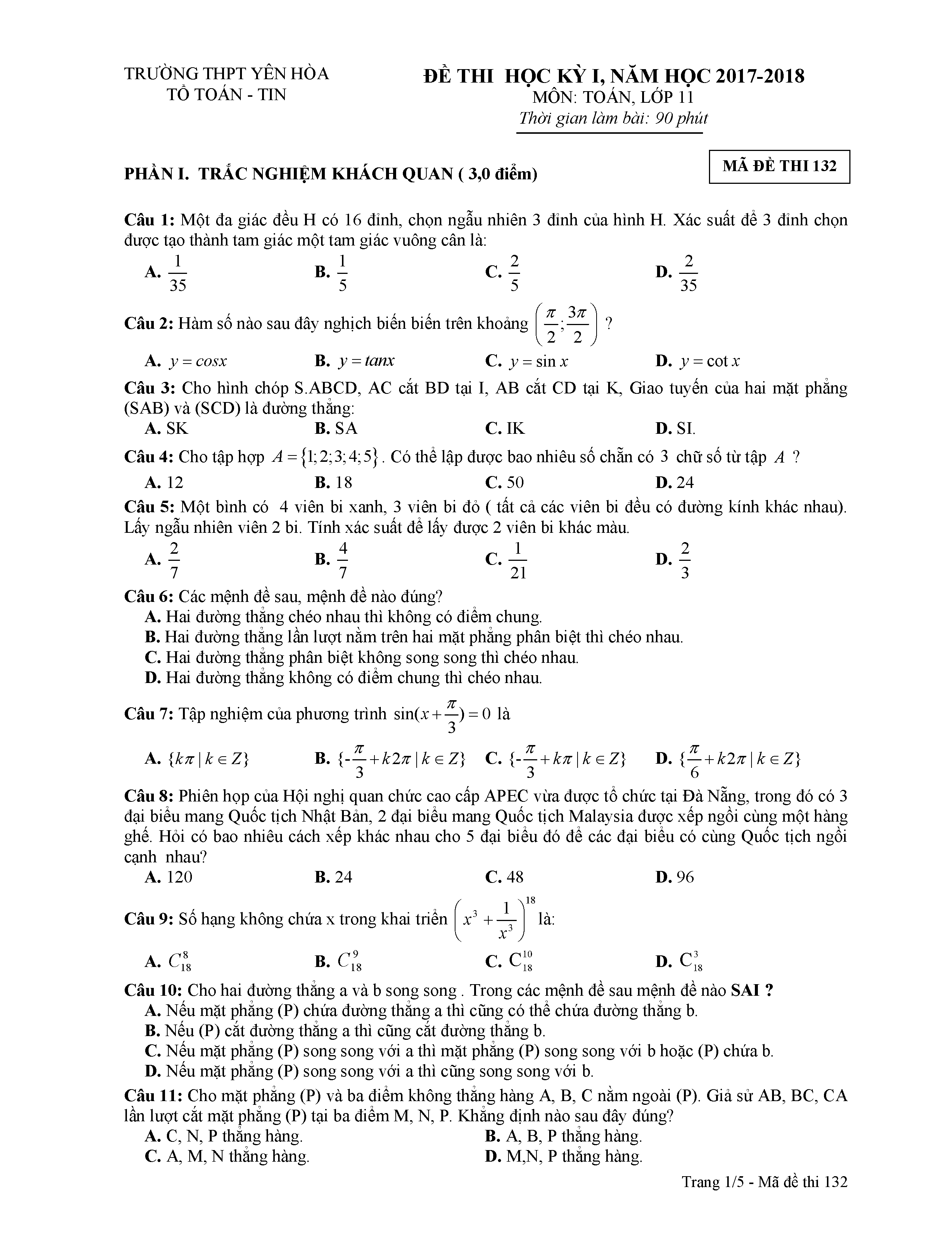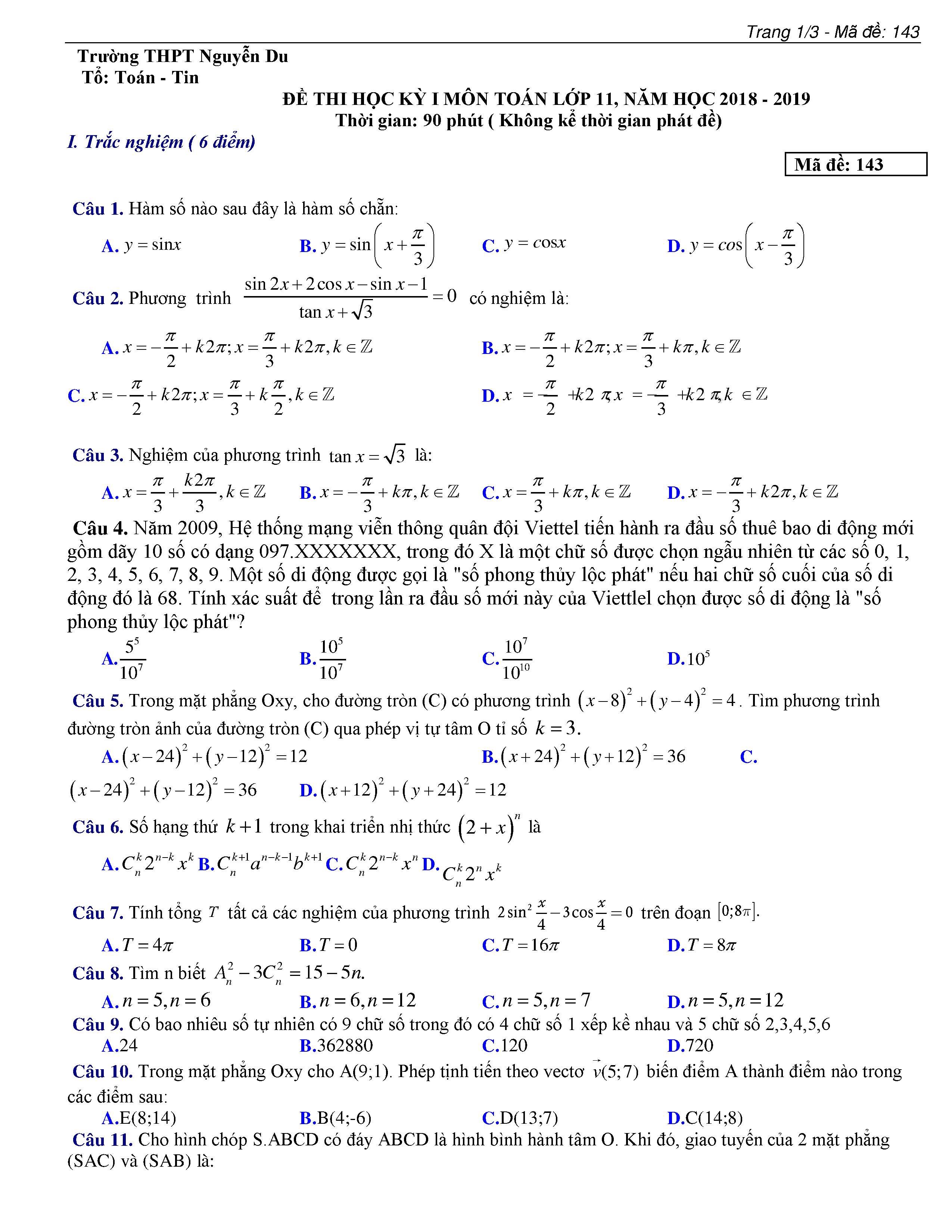 TỔNG HỢP ĐỀ THI HỌC KÌ I MÔN TOÁN NĂM HỌC 2018 - 2019 TỪ CÁC TRƯỜNG THPT TRÊN CẢ NƯỚC