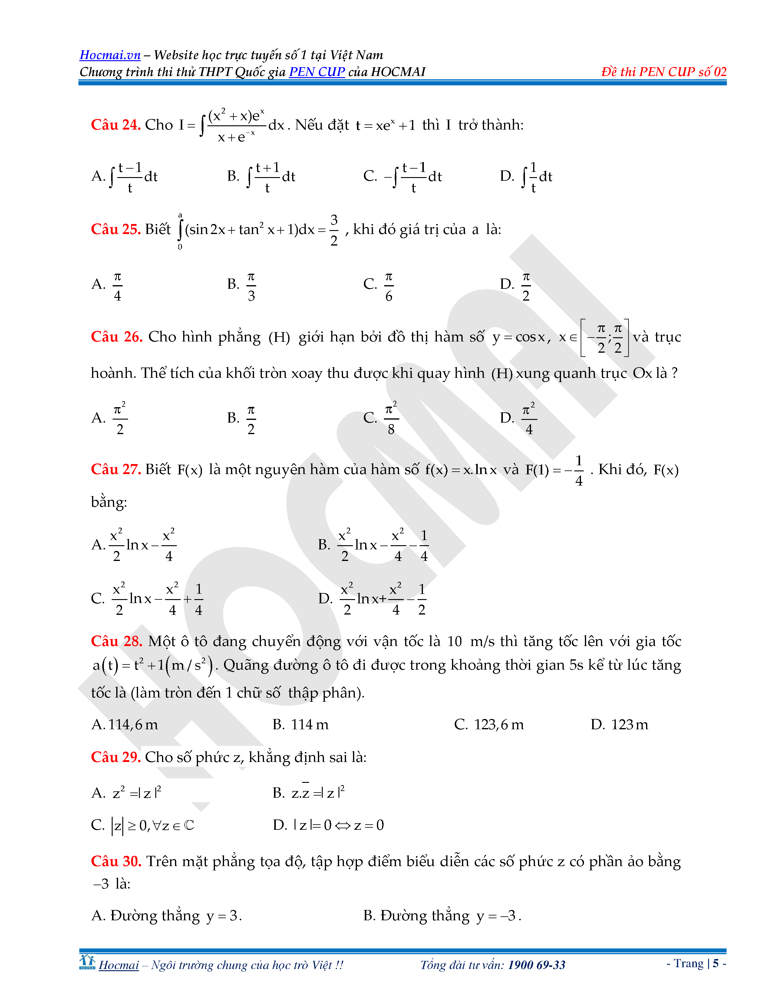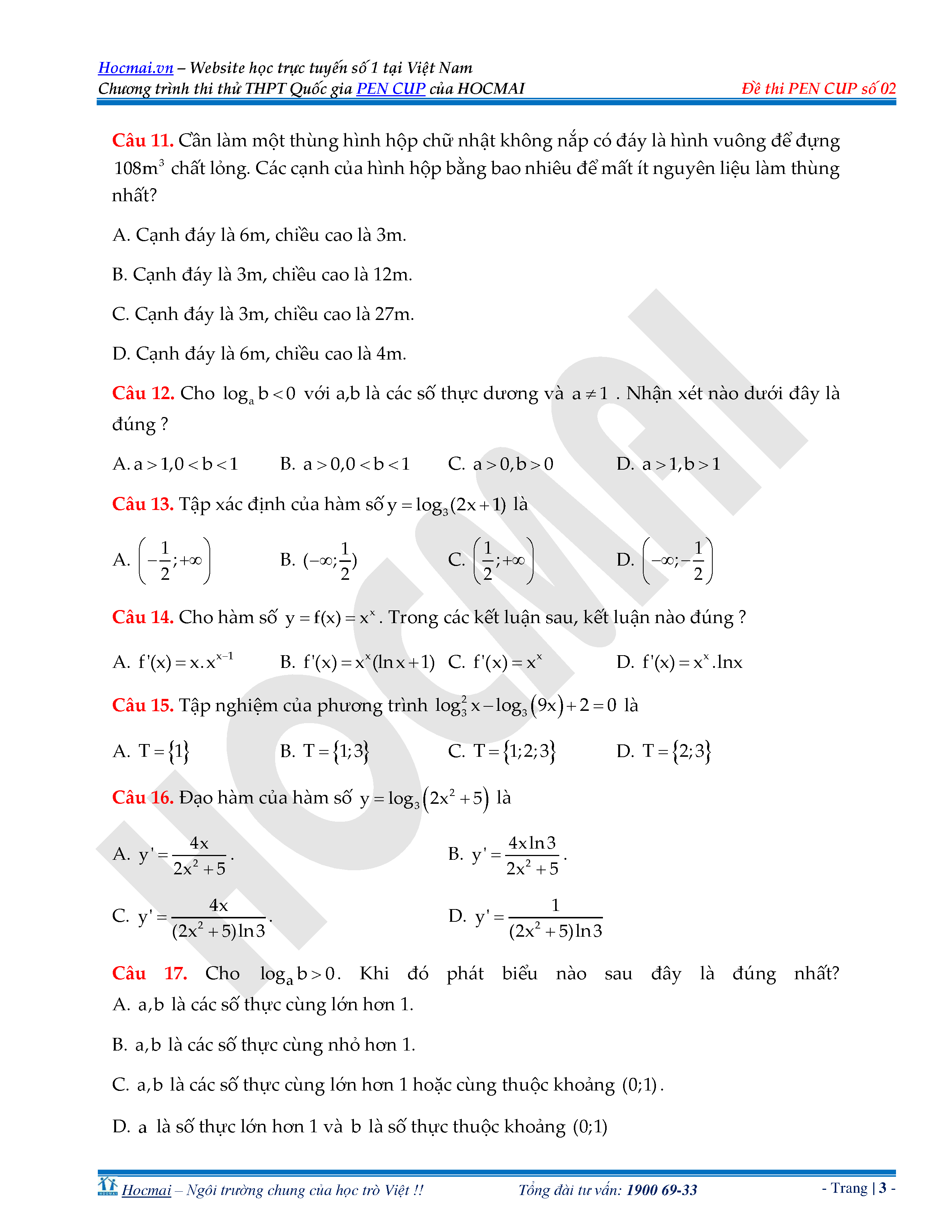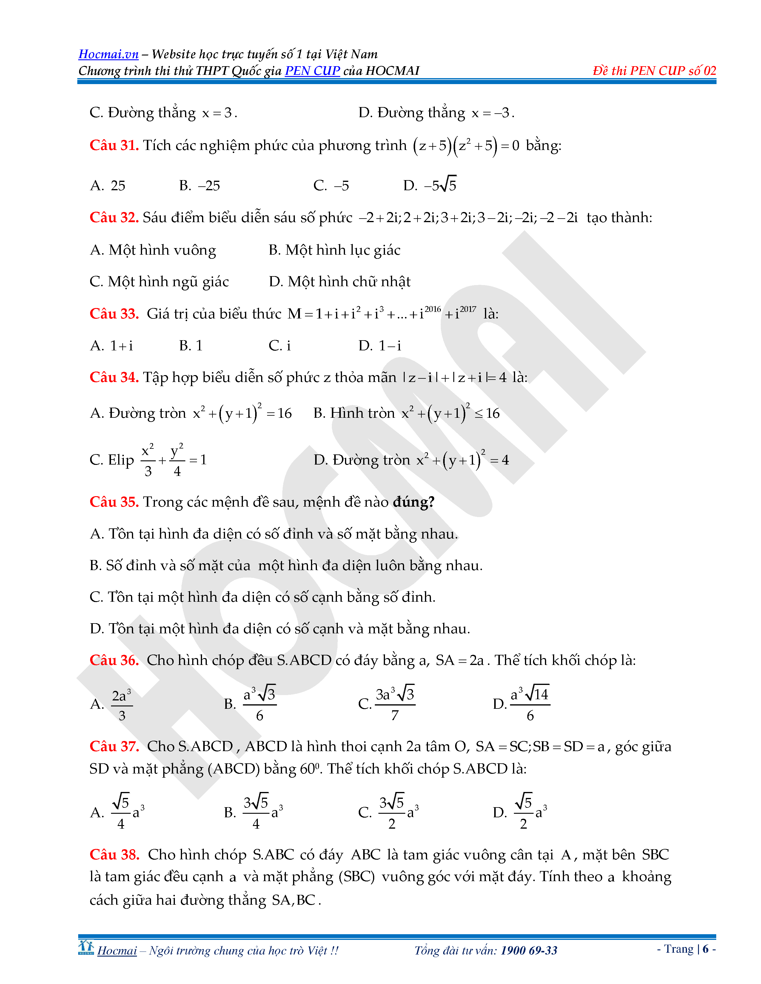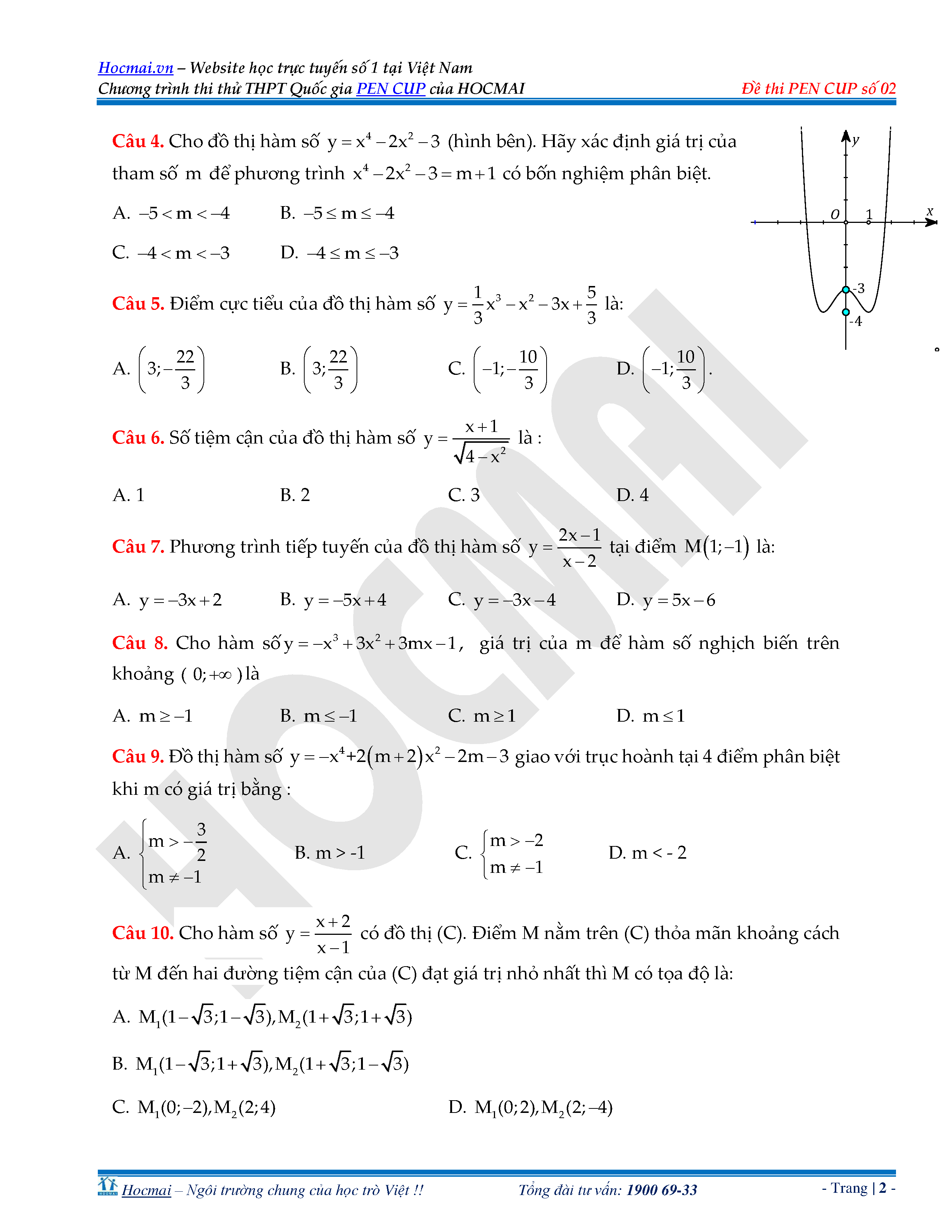 Đề thi số 2 môn Toán trắc nghiệm PEN CUP 2016