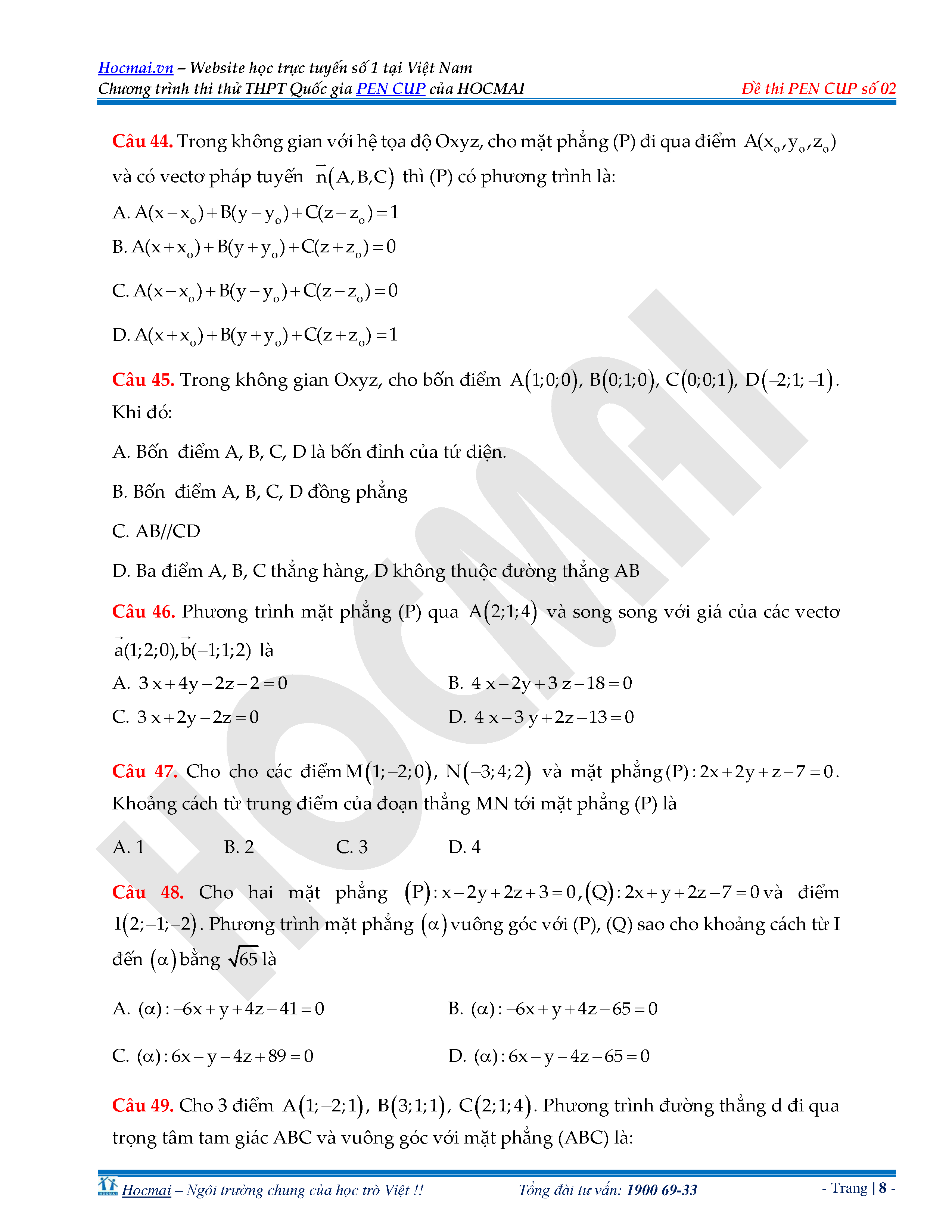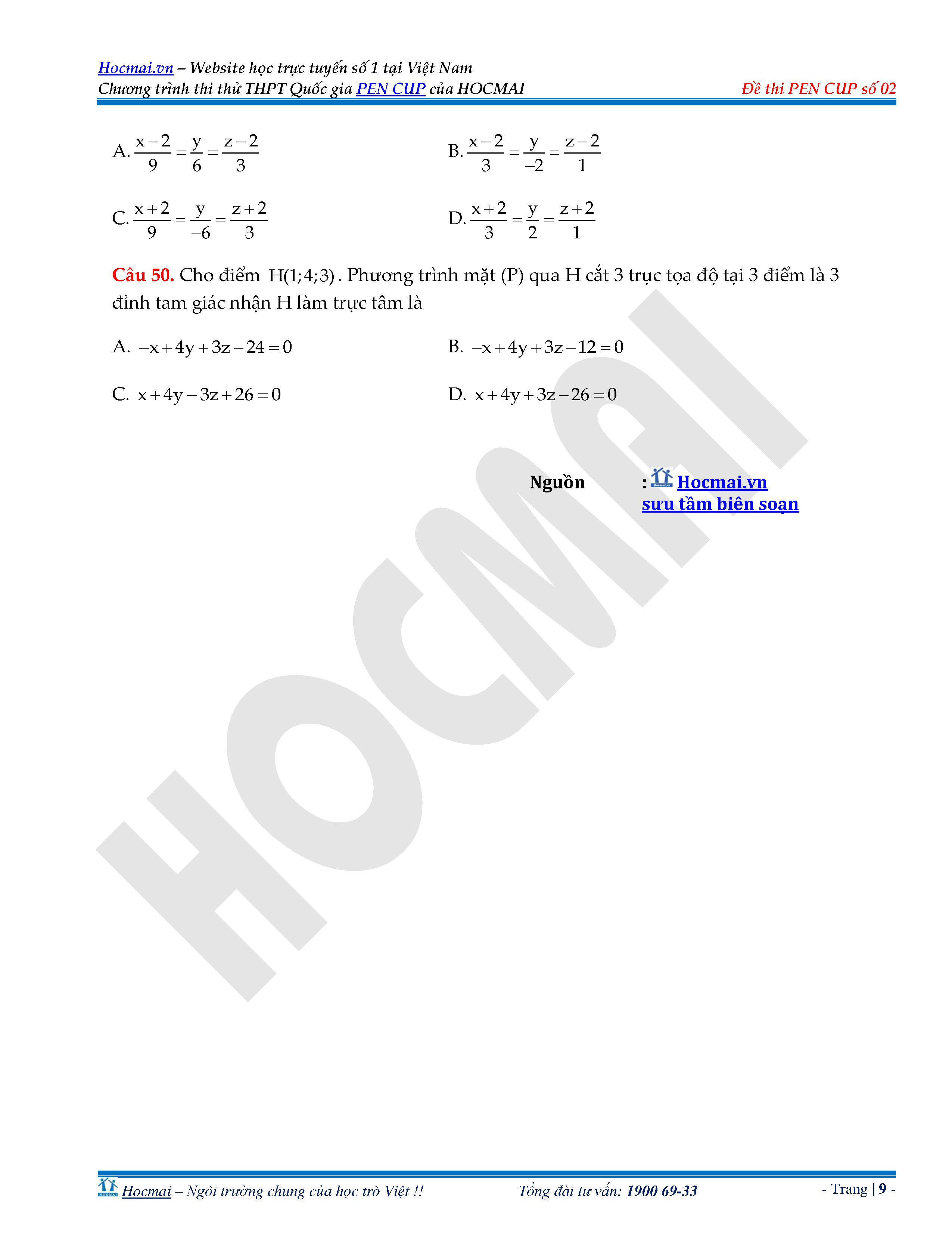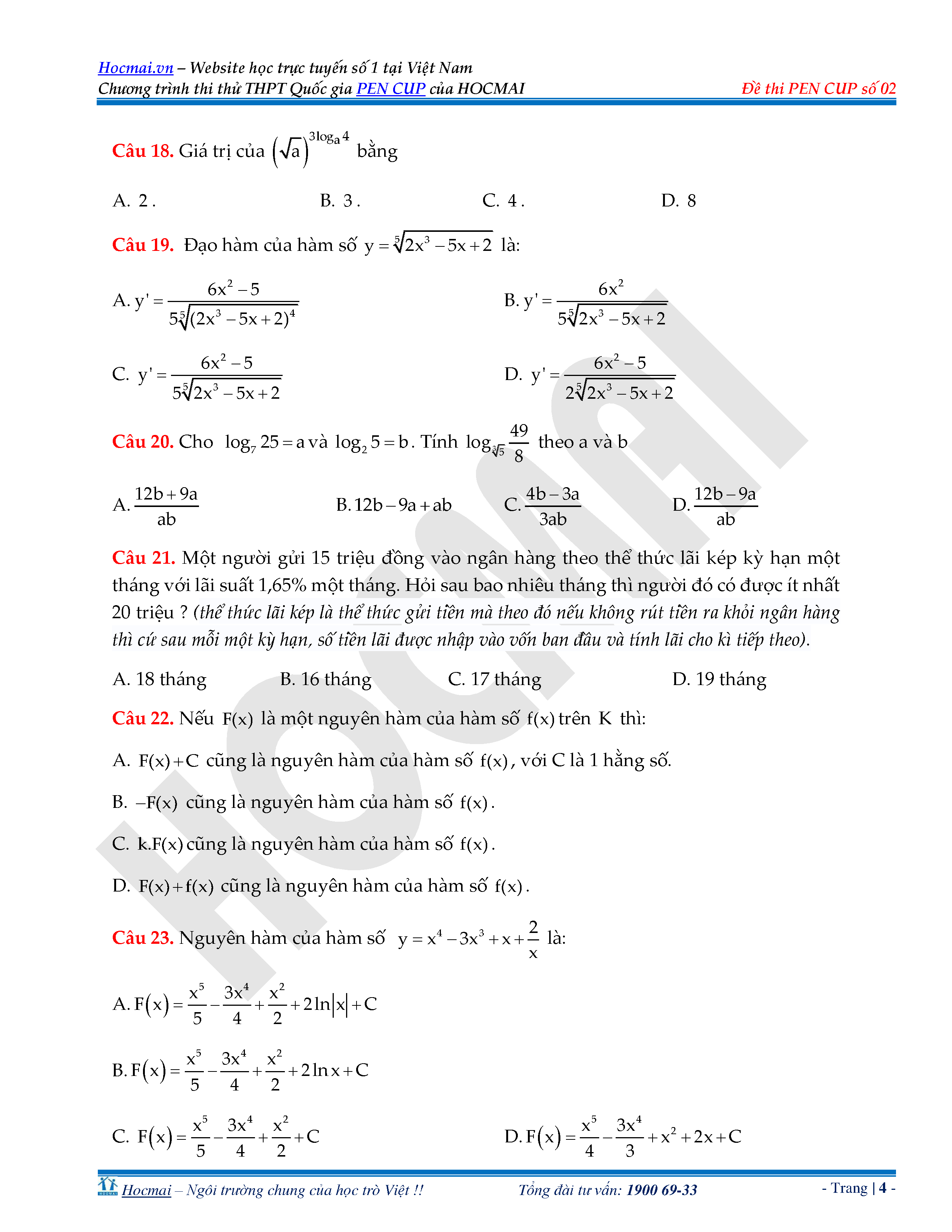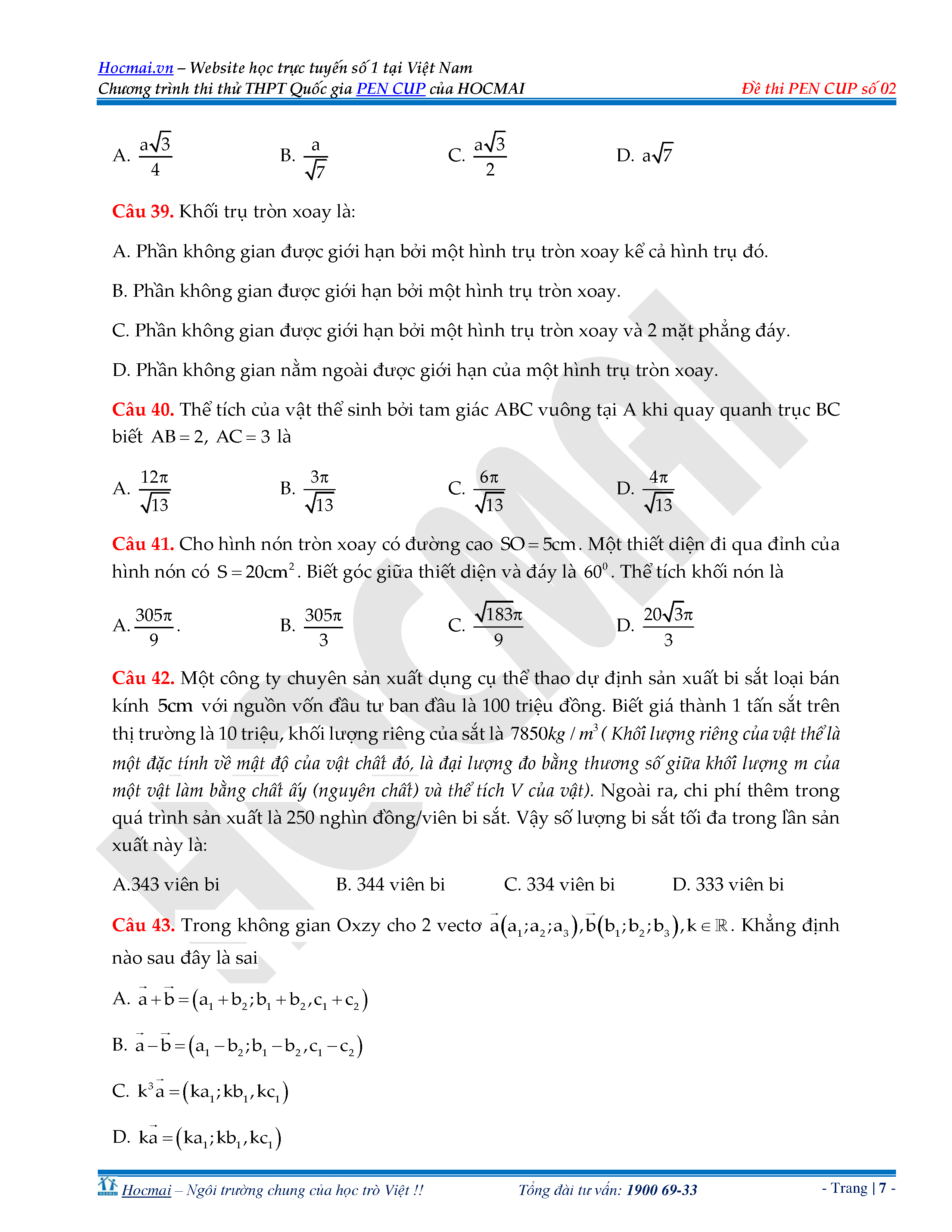 Đề thi số 2 môn Toán trắc nghiệm PEN CUP 2016