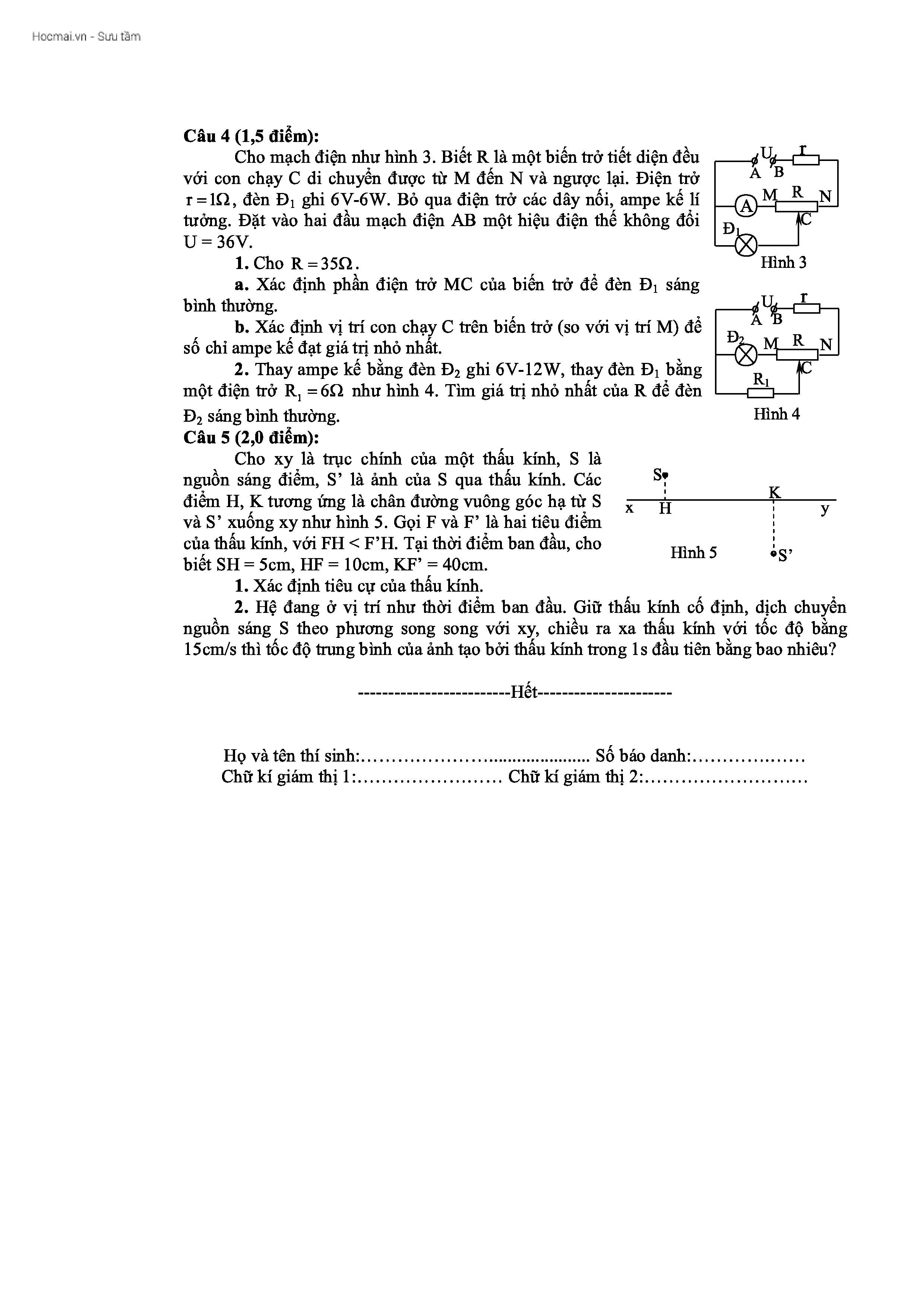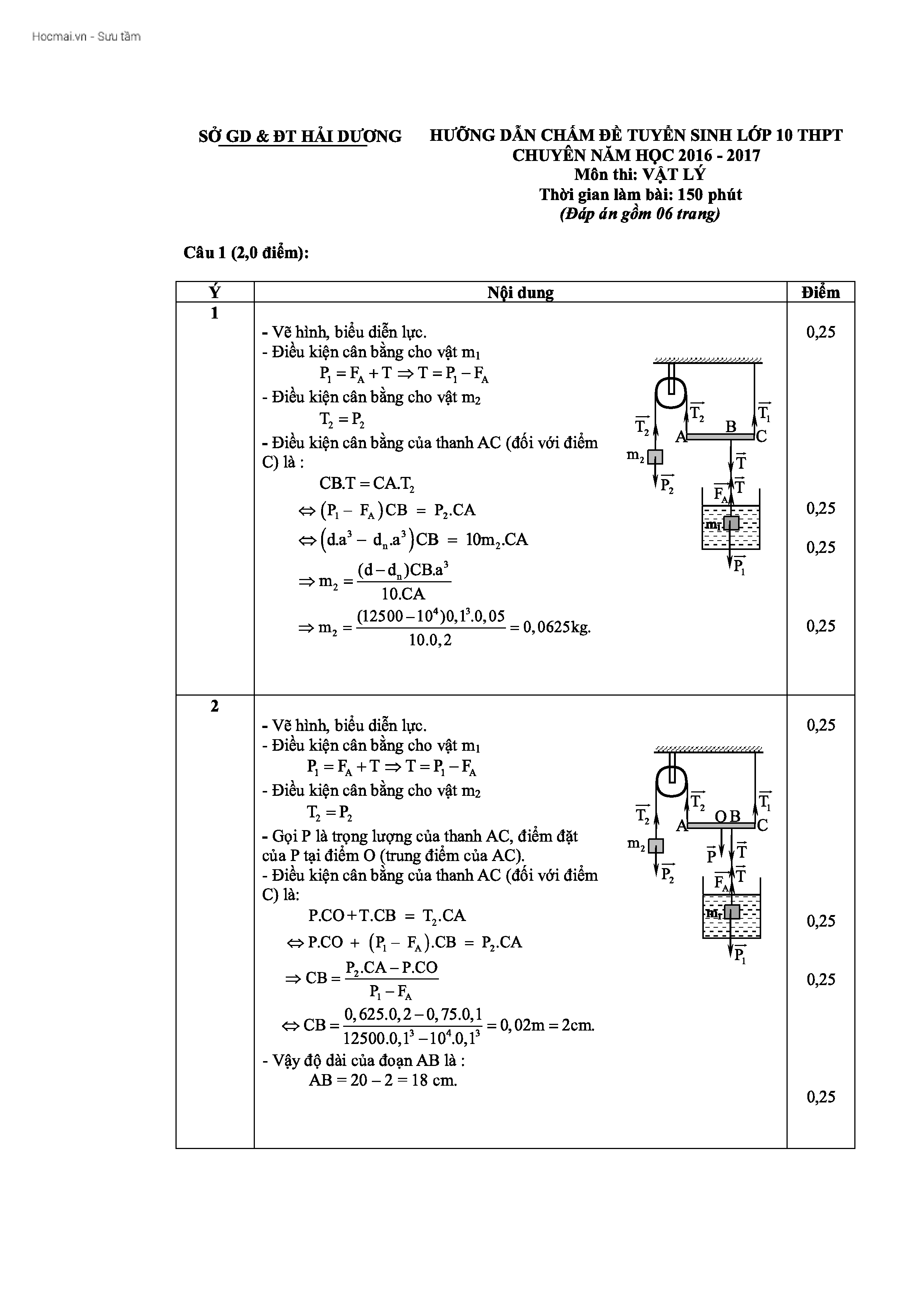 Đề thi tuyển sinh lớp 10 năm học 2016-2017 môn Vật lí - Trường THPT chuyên Nguyễn Trãi - Hải Dương