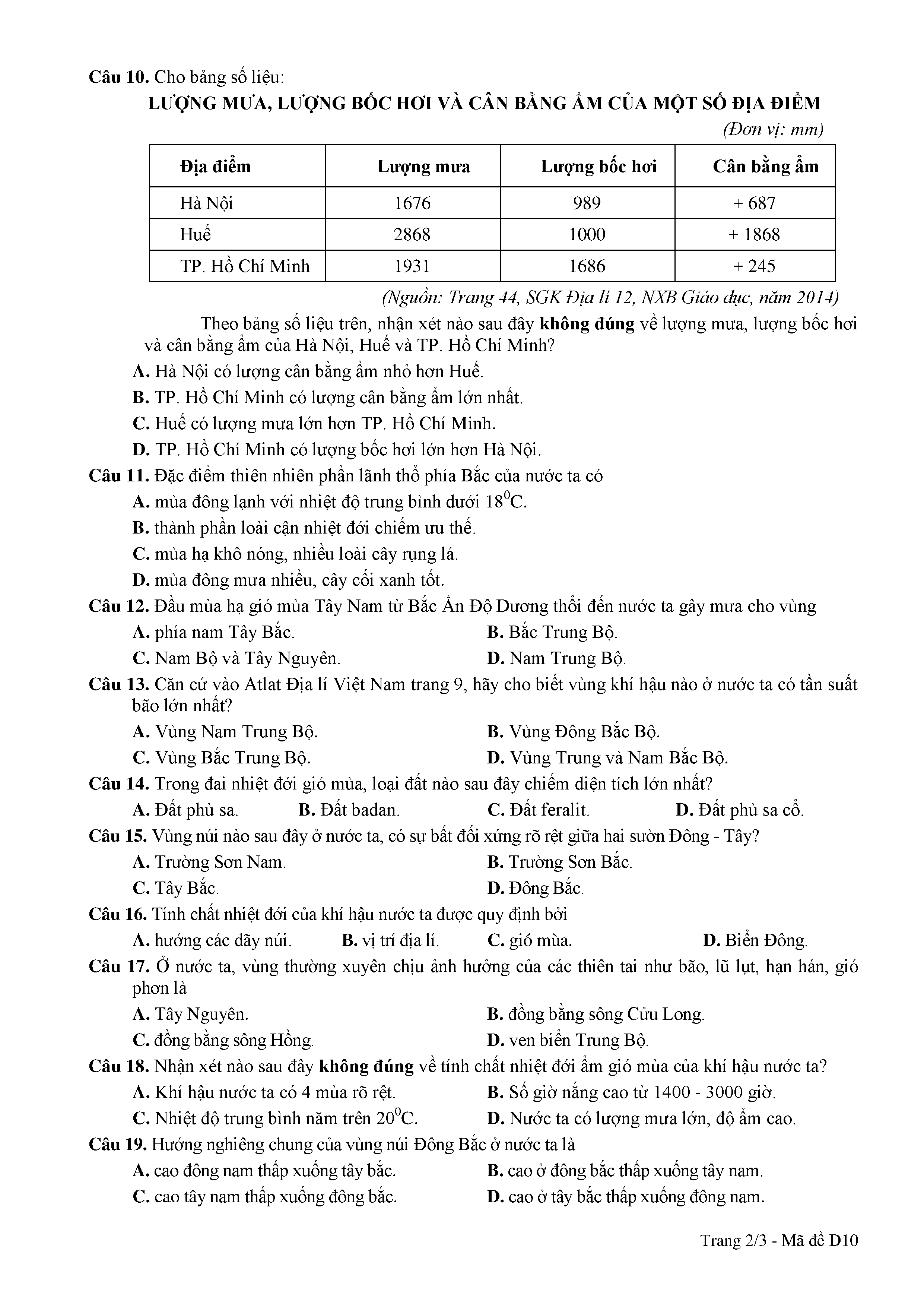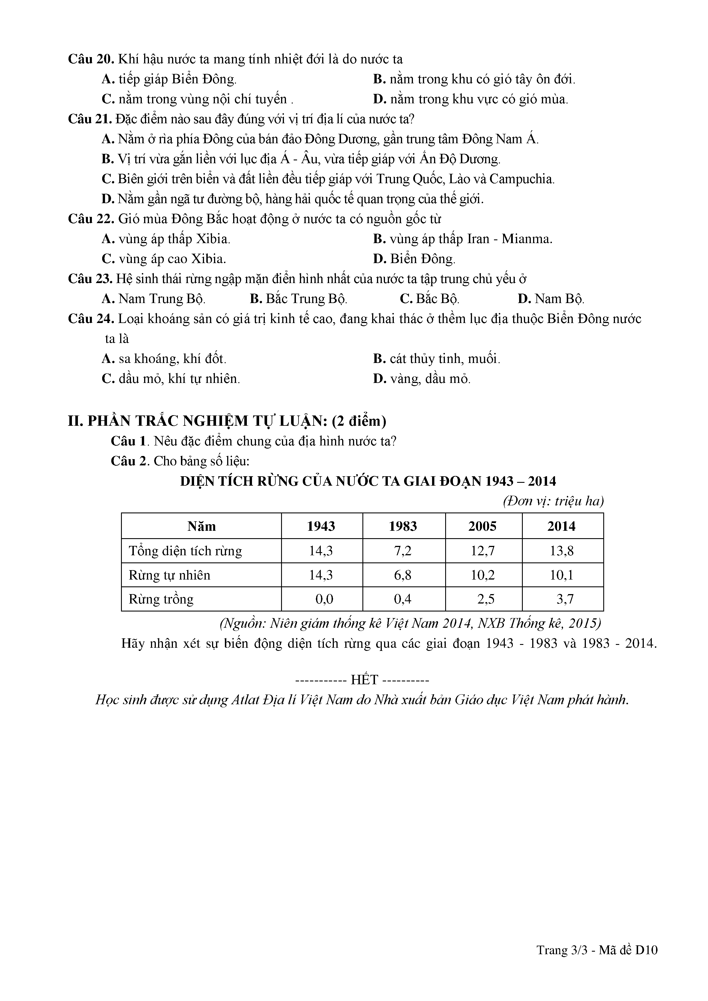 ĐỀ KIỂM TRA HỌC KÌ I - SỐ 3 - ĐỊA LÍ - LỚP 12