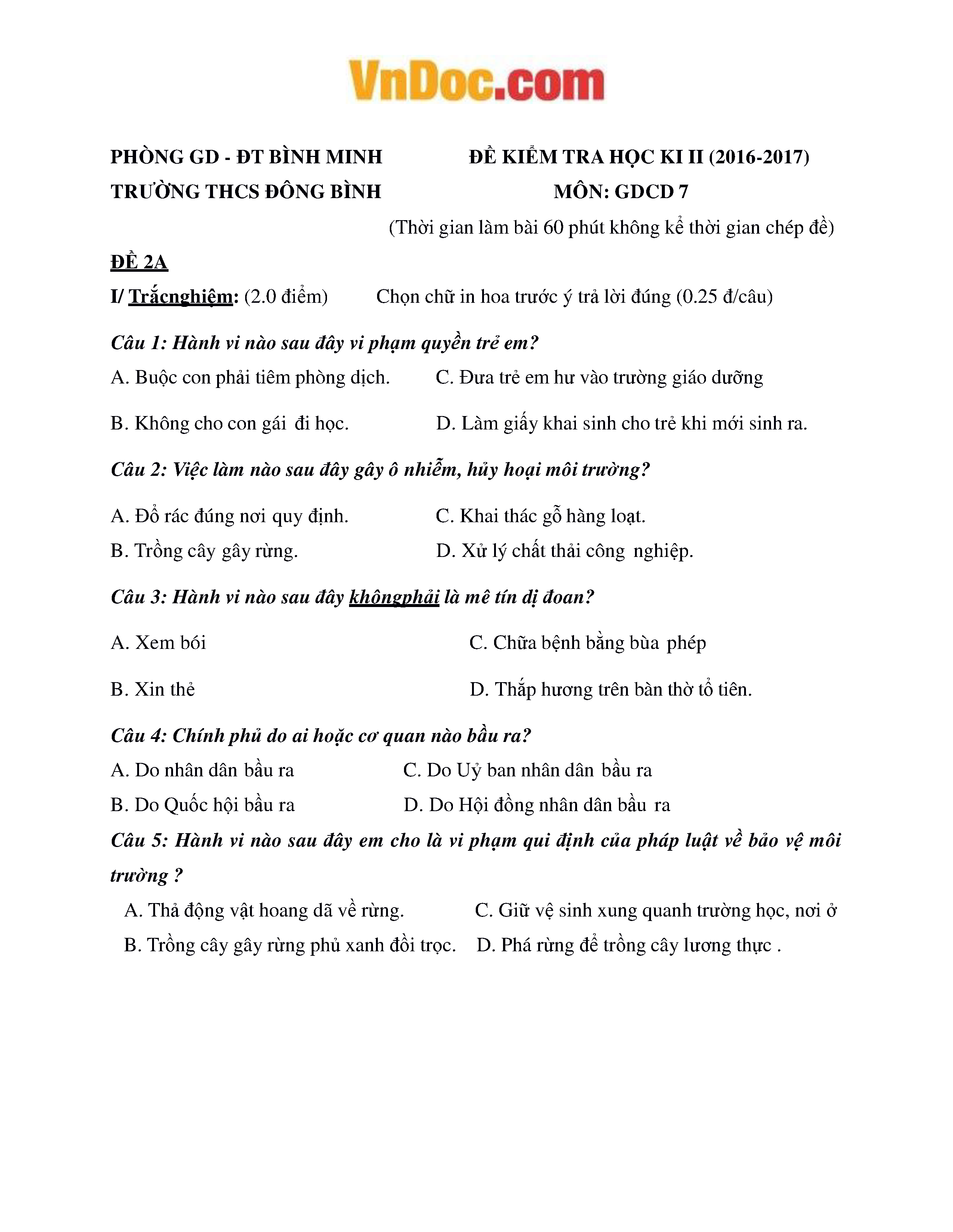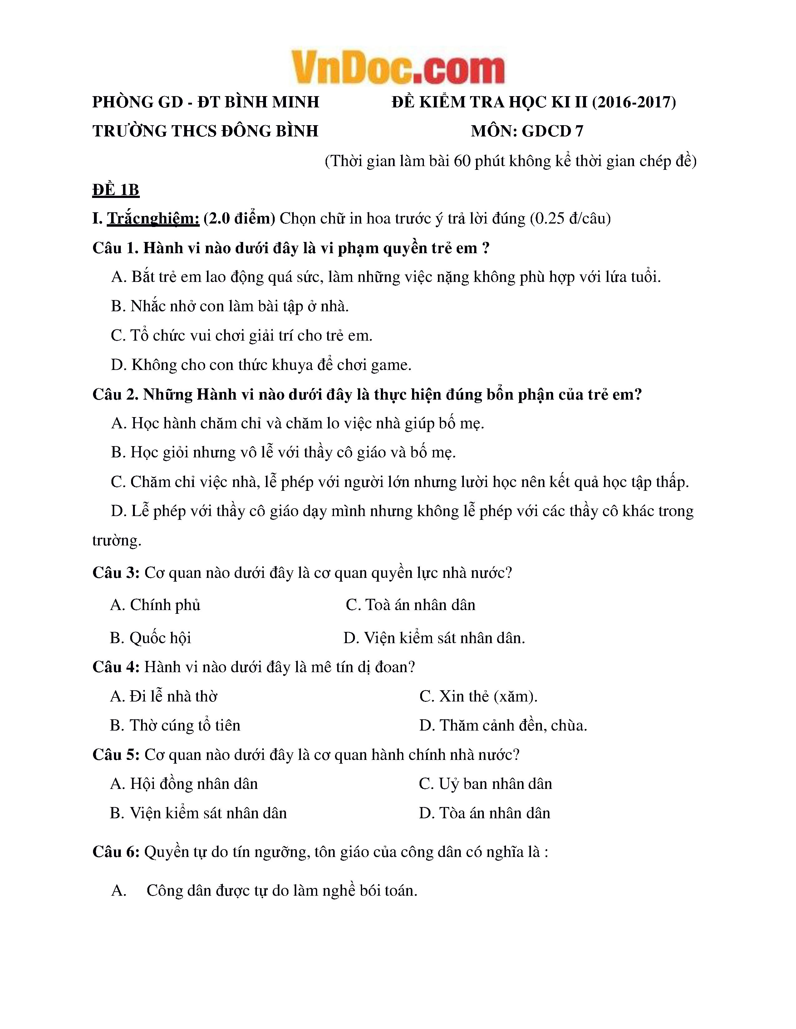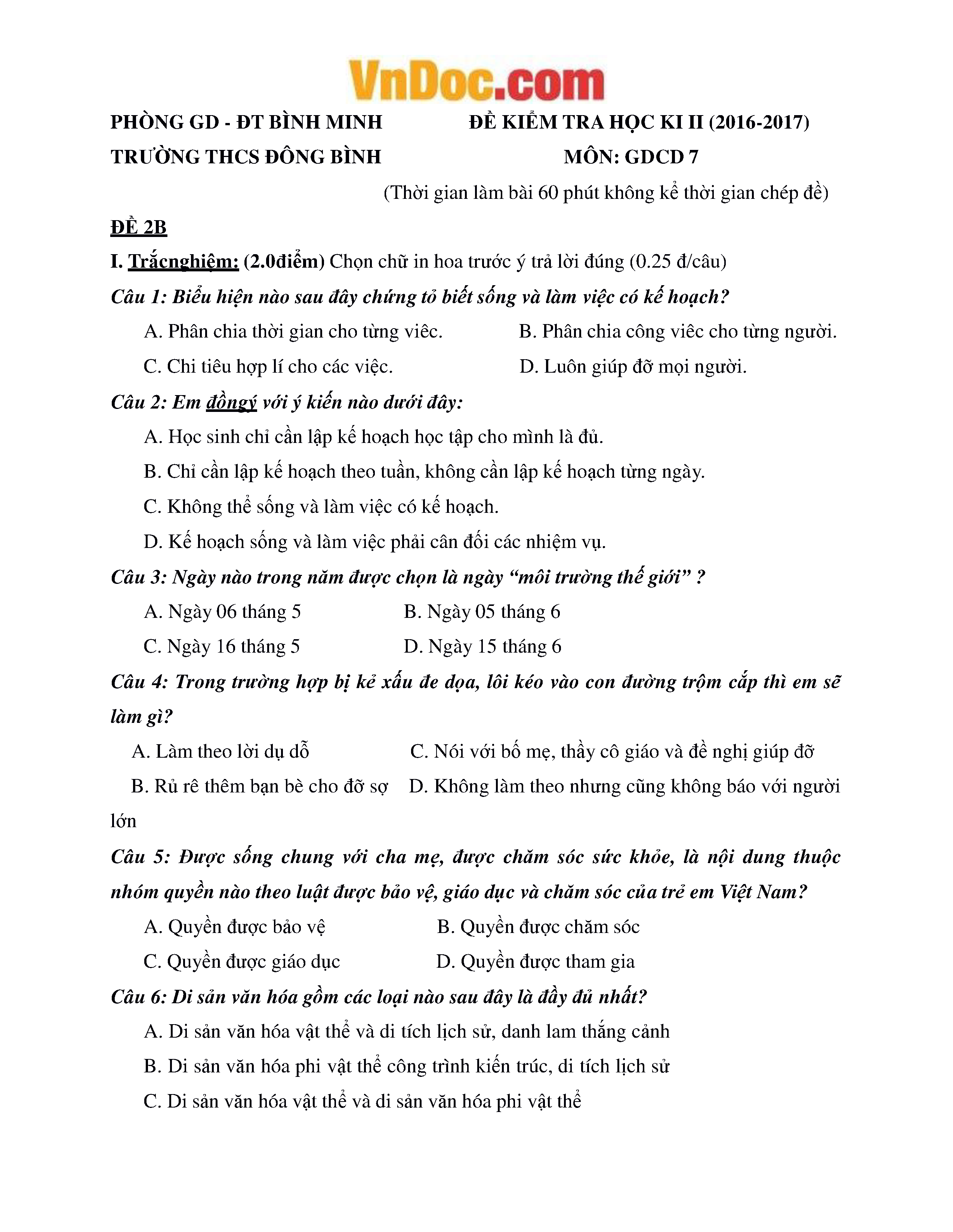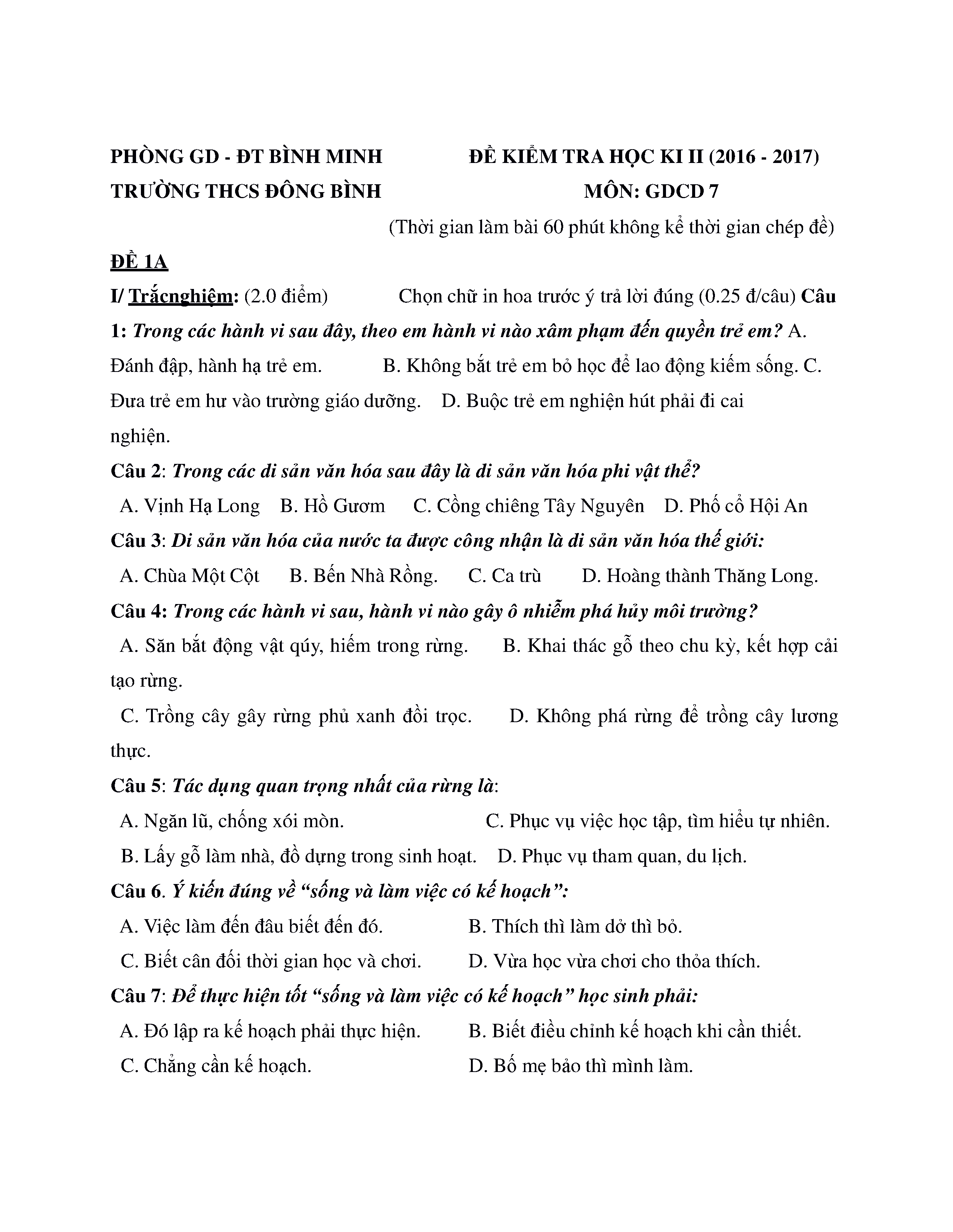 BỘ ĐỀ KIỂM TRA HK II - GDCD - LỚP 7