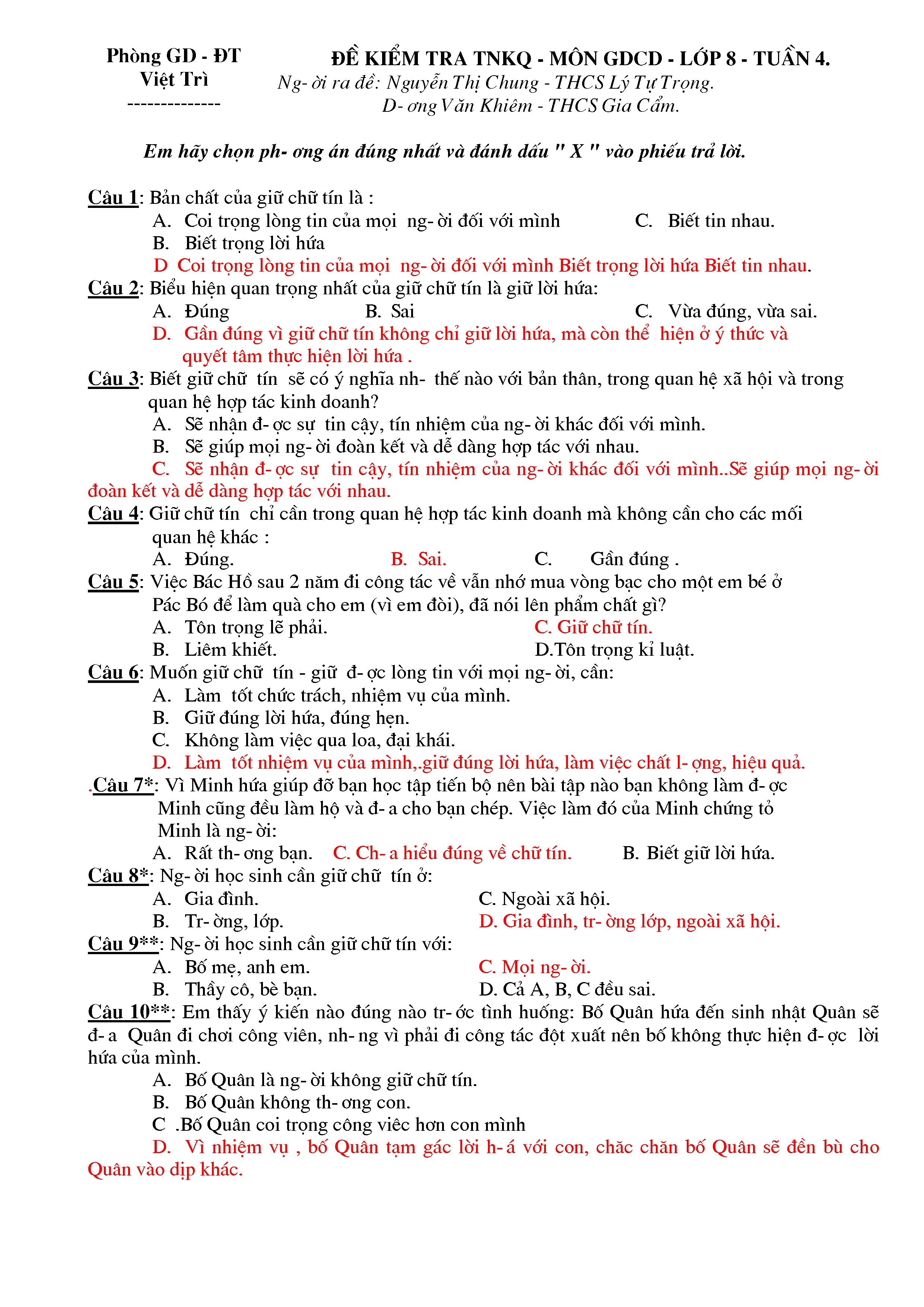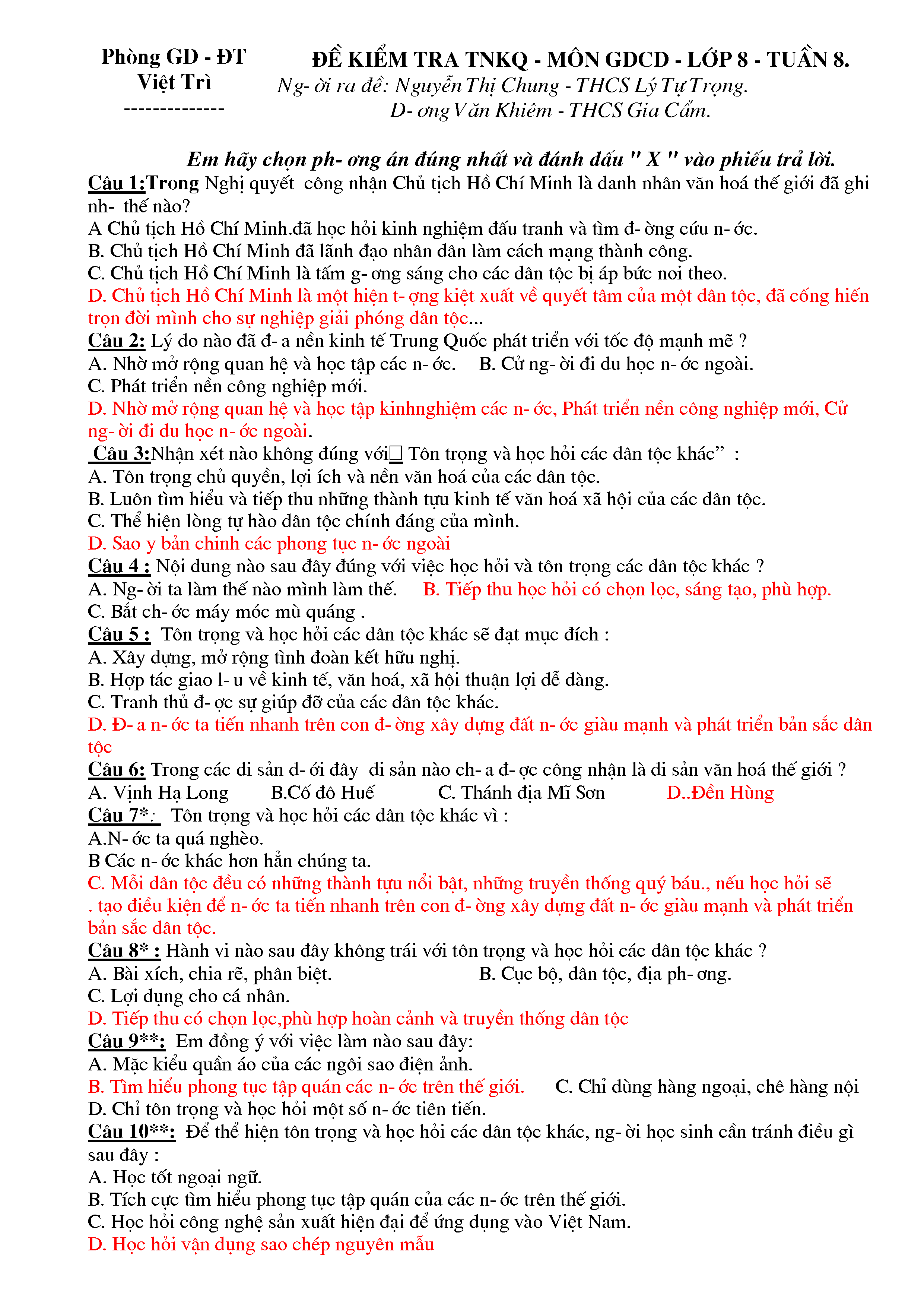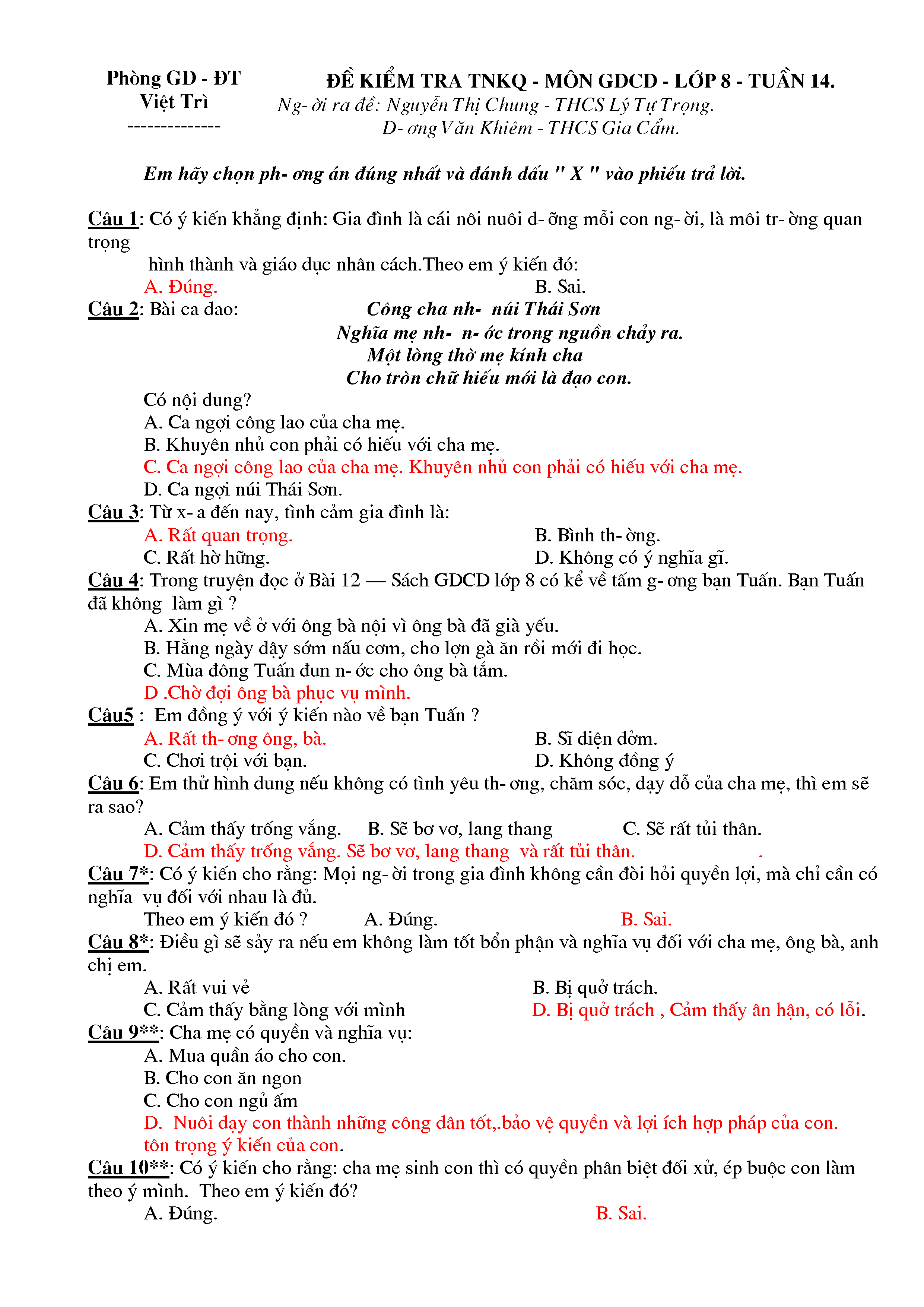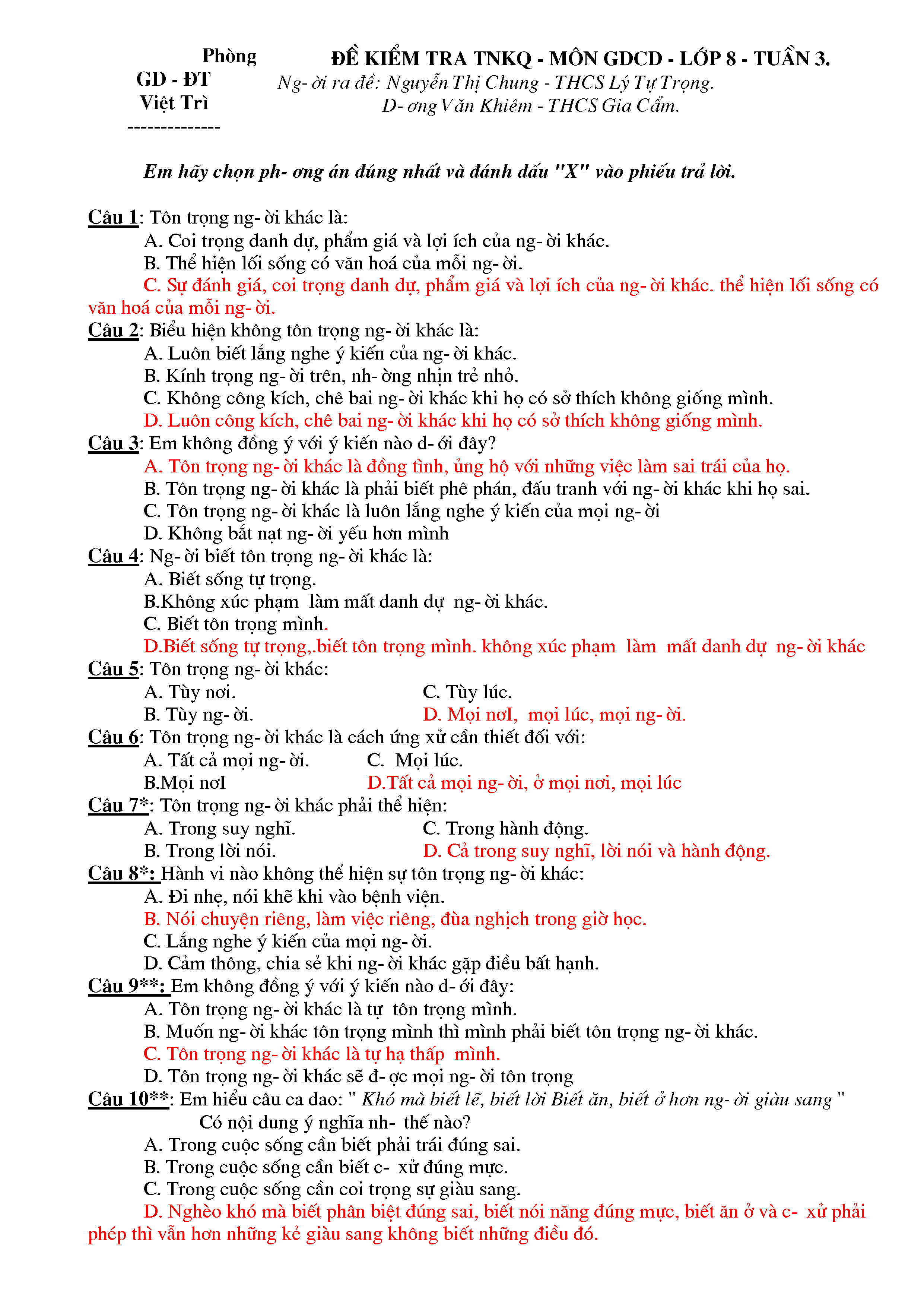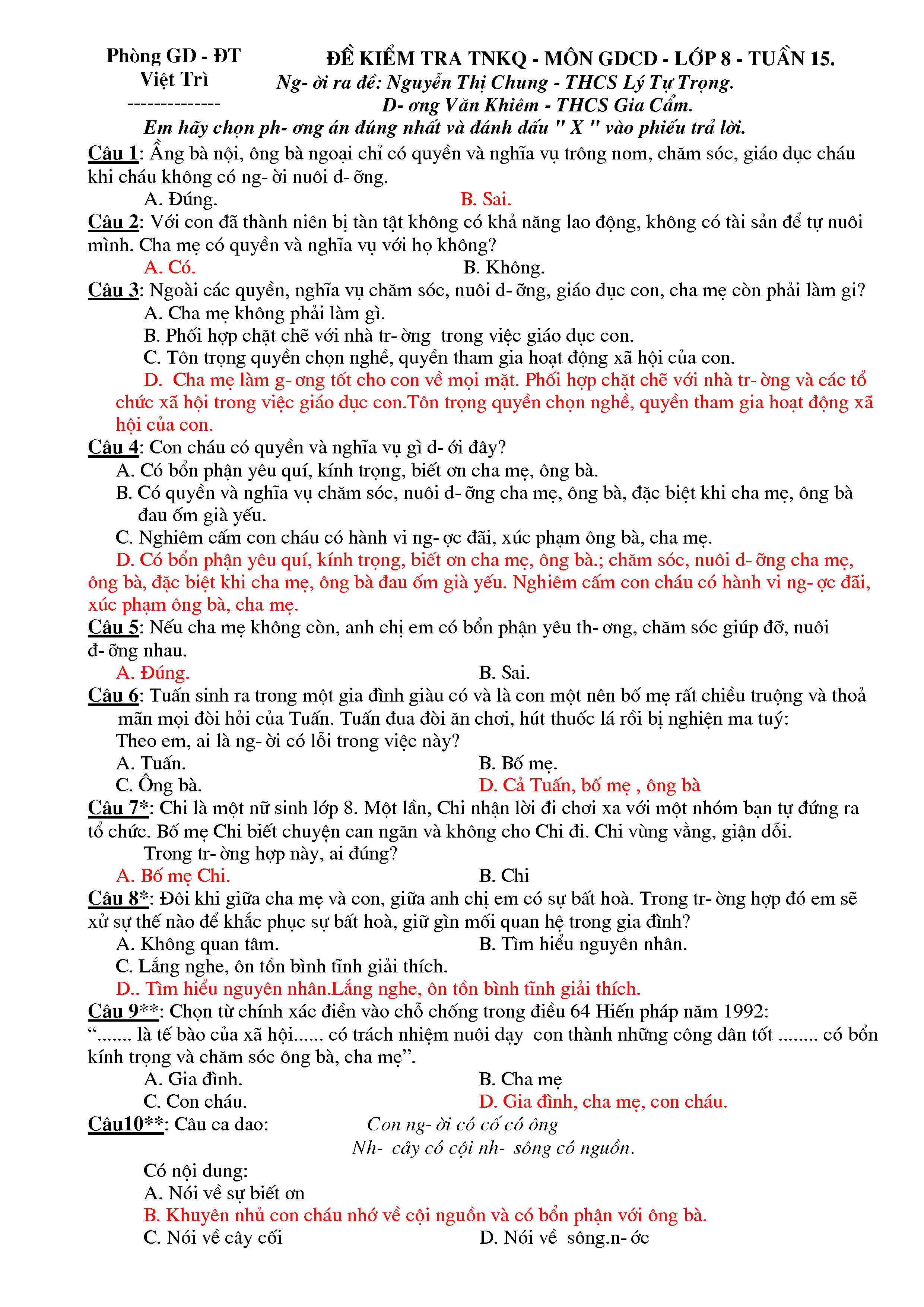 ĐỀ TRẮC NGHIỆM THEO TUẦN - PHẦN 1 - GDCD - LỚP 8