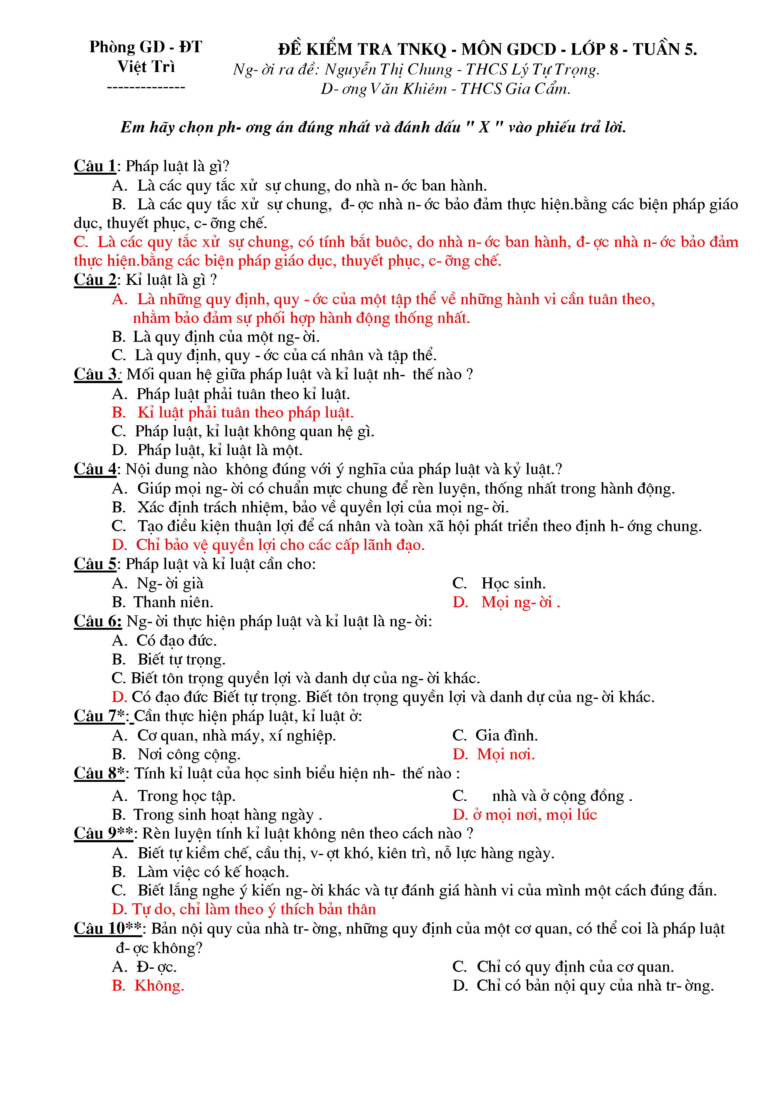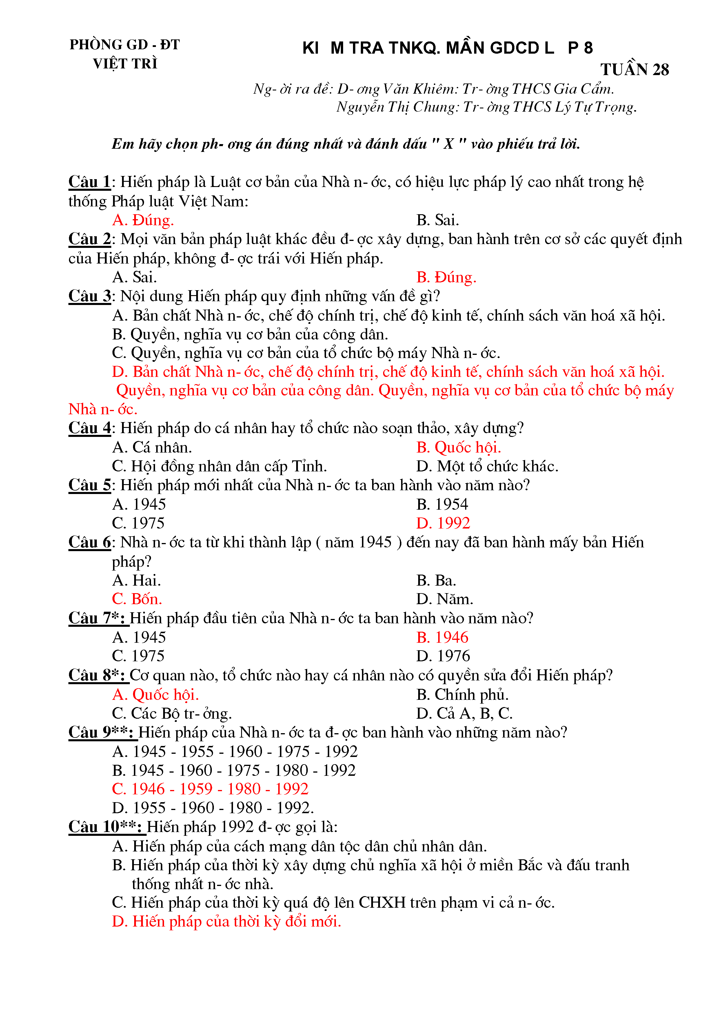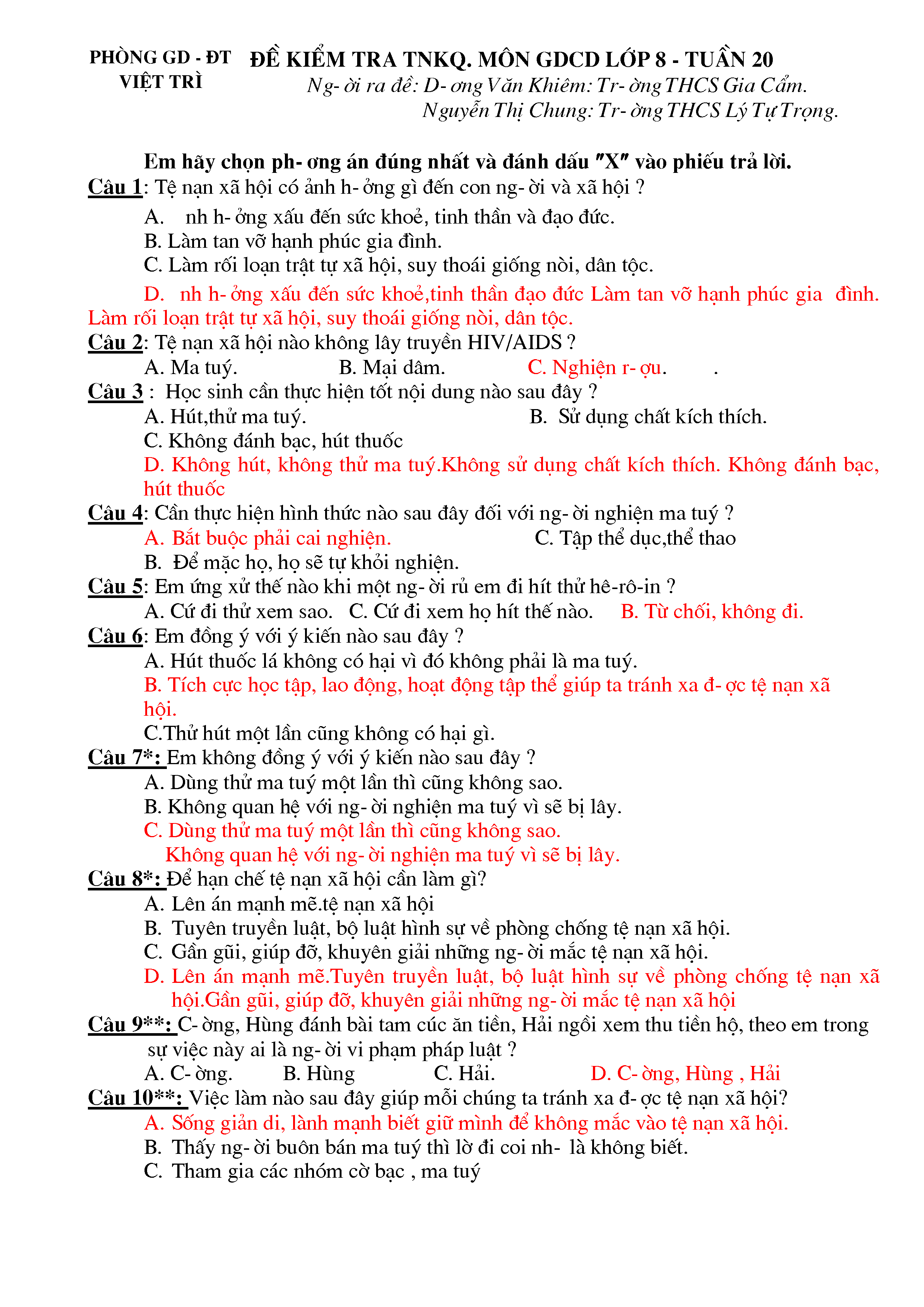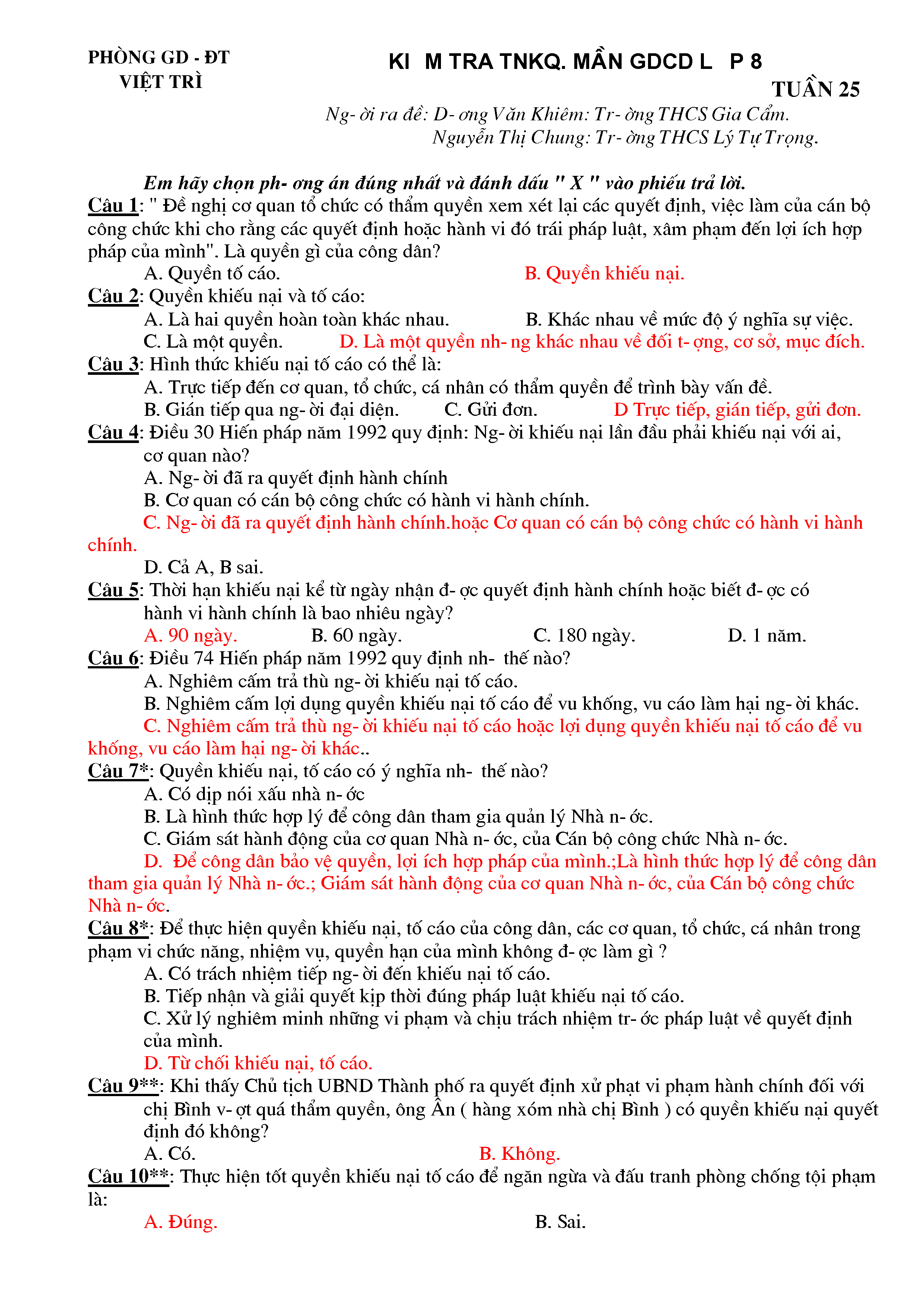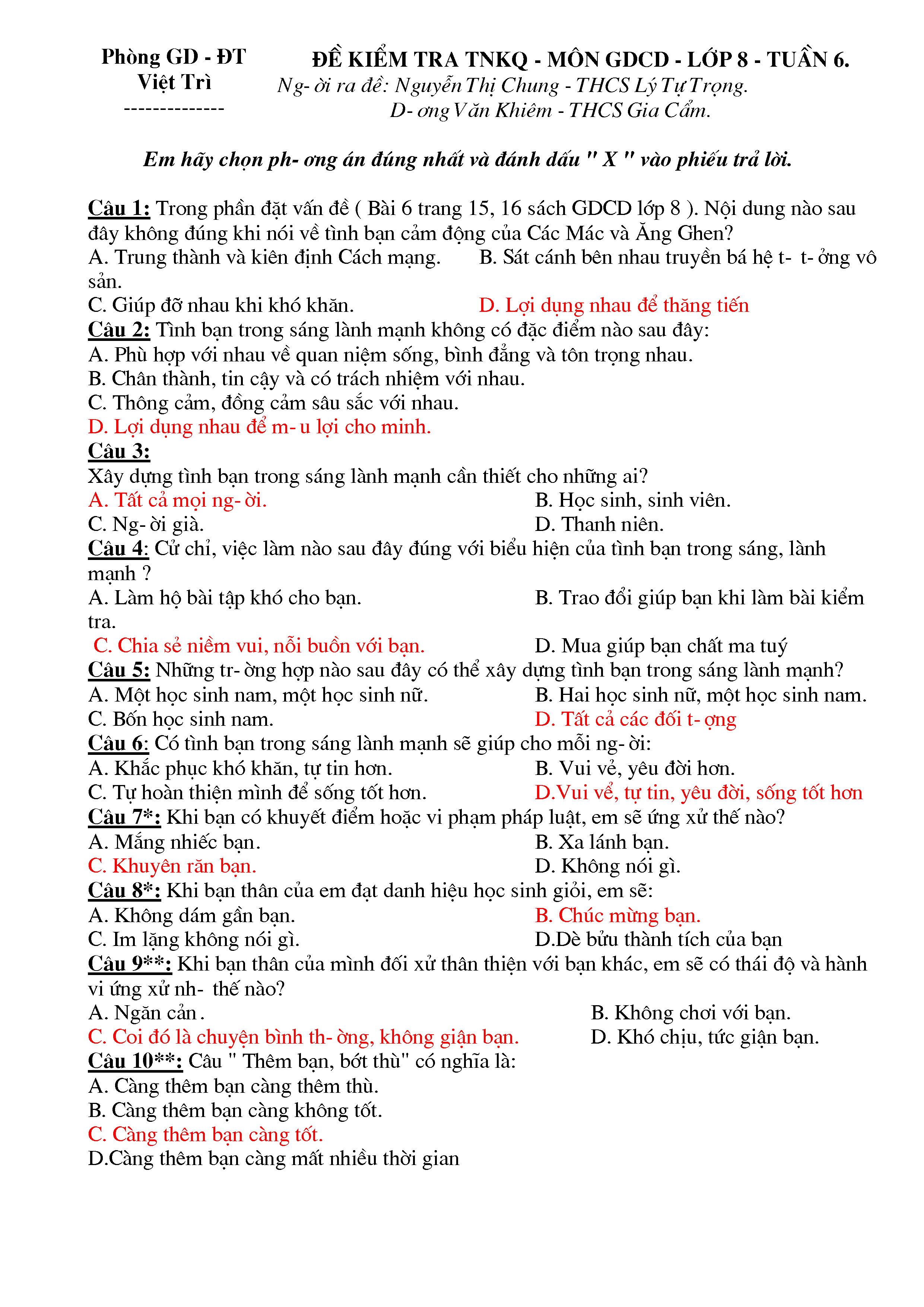 ĐỀ TRẮC NGHIỆM THEO TUẦN - PHẦN 1 - GDCD - LỚP 8
