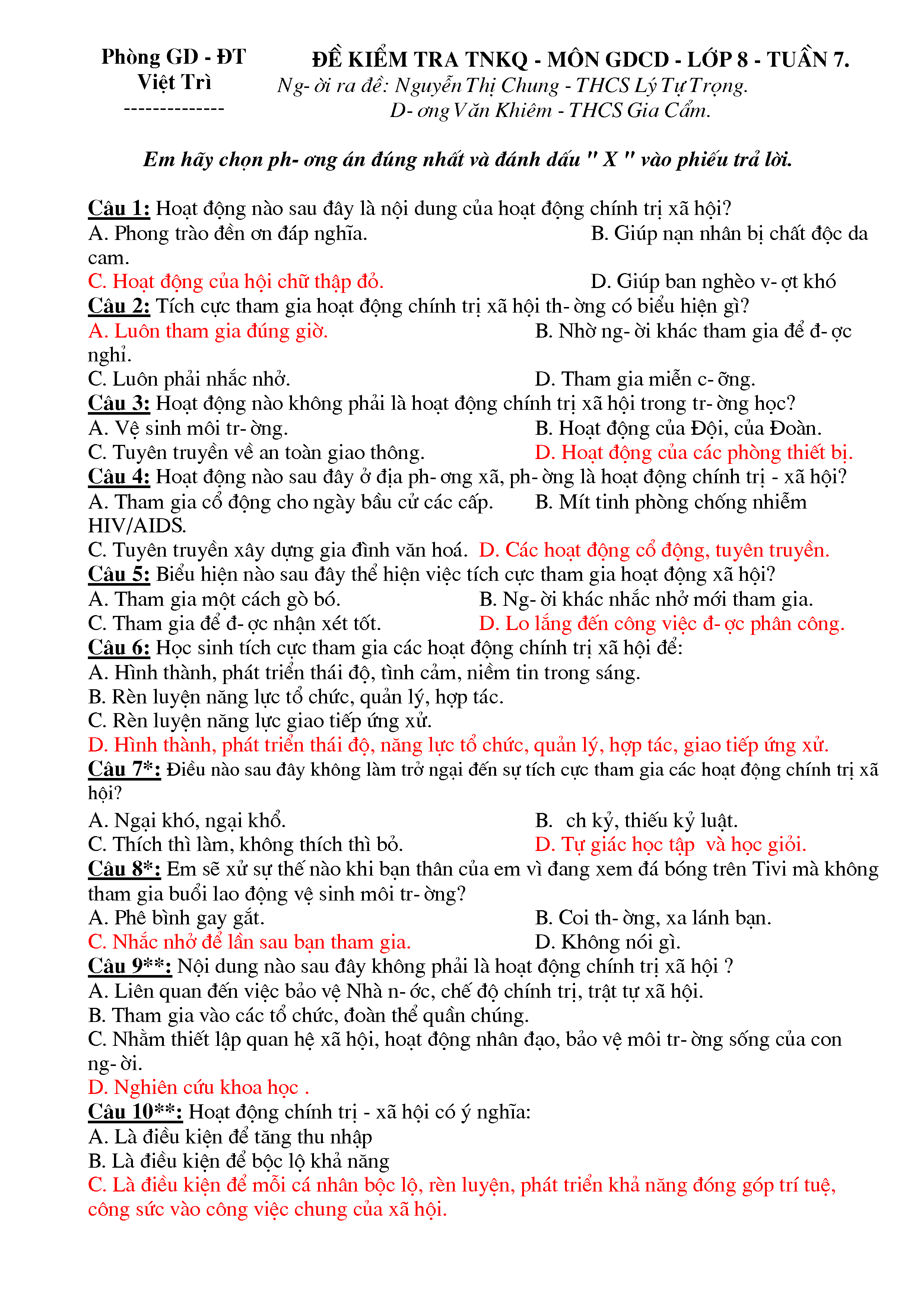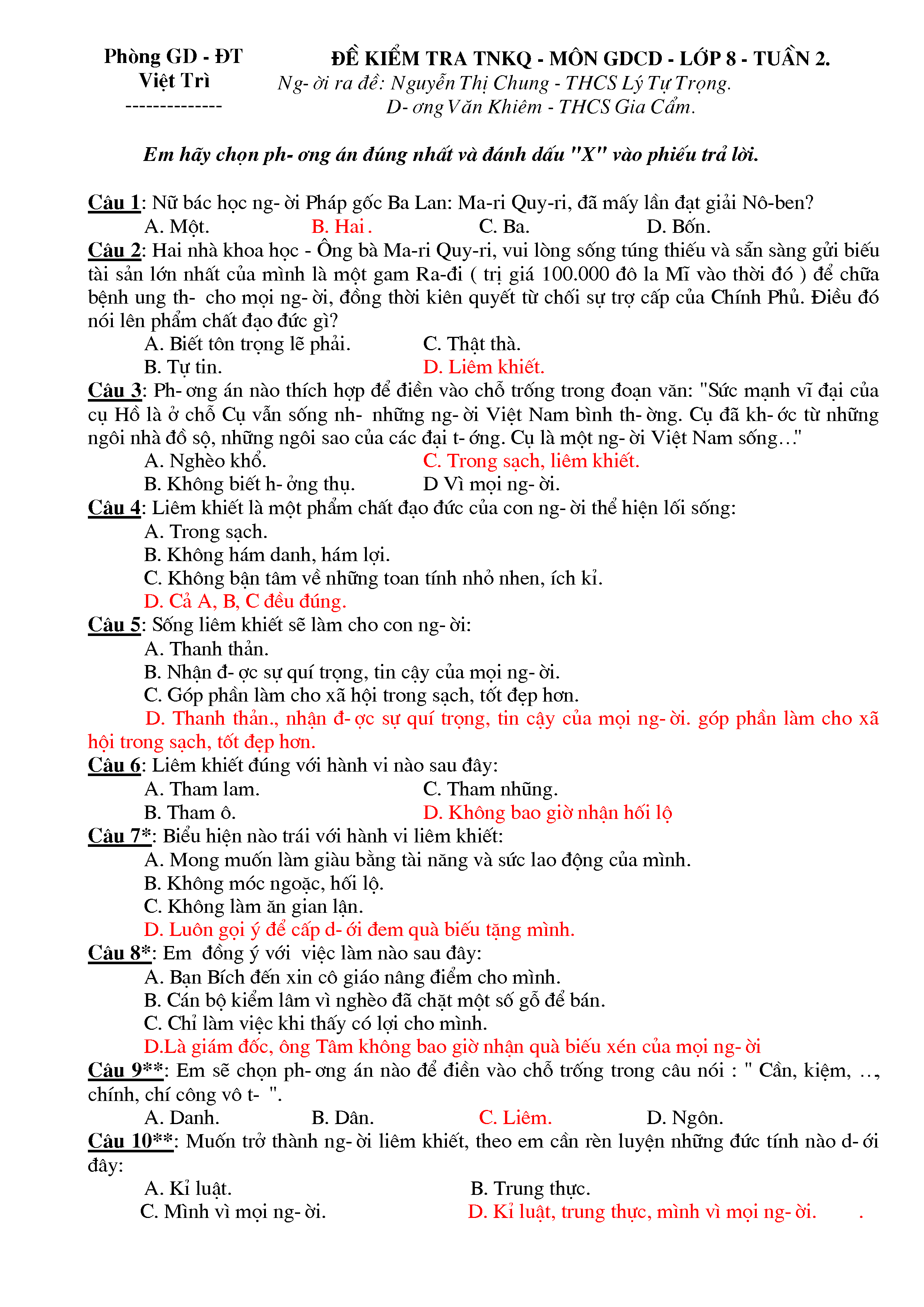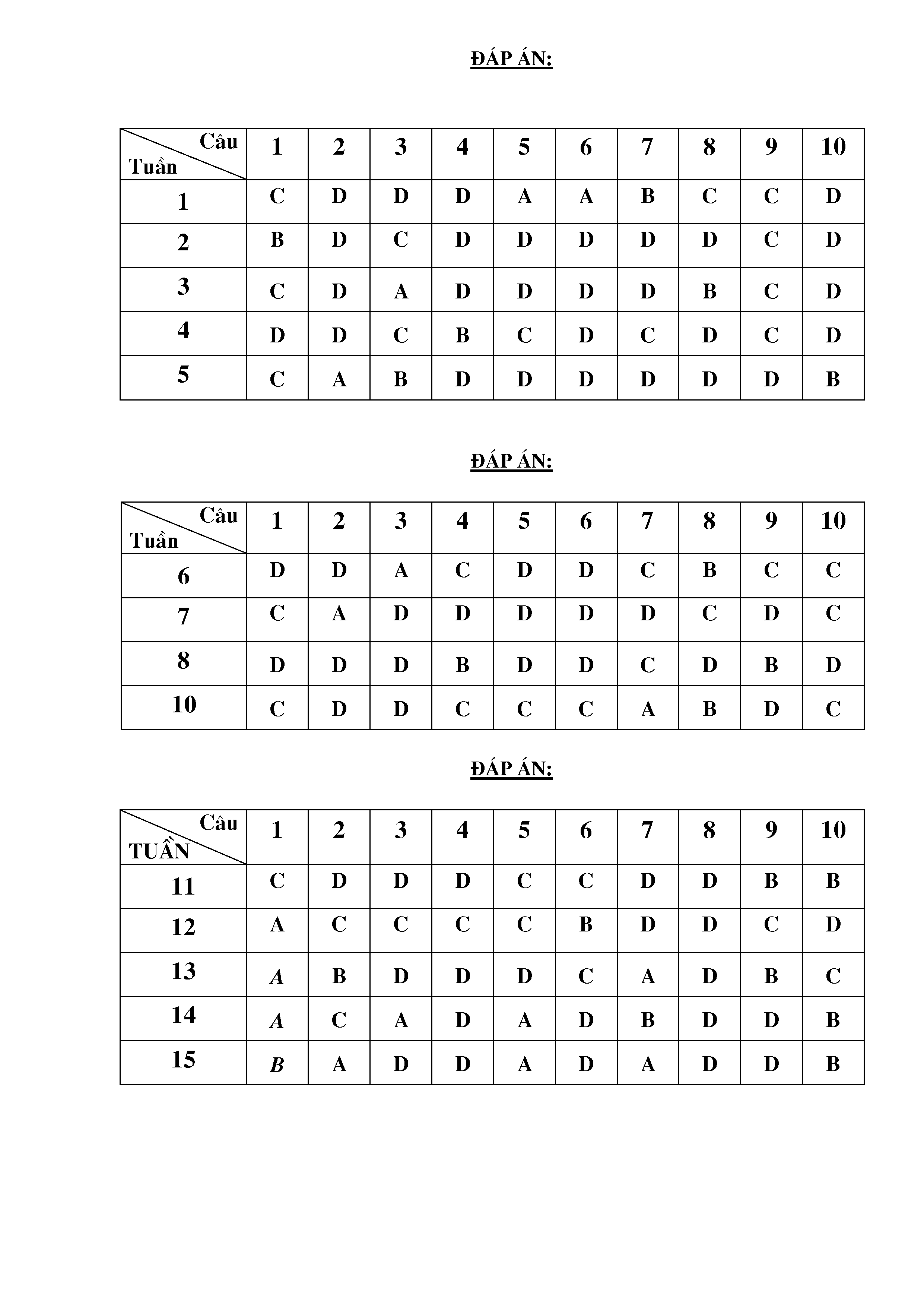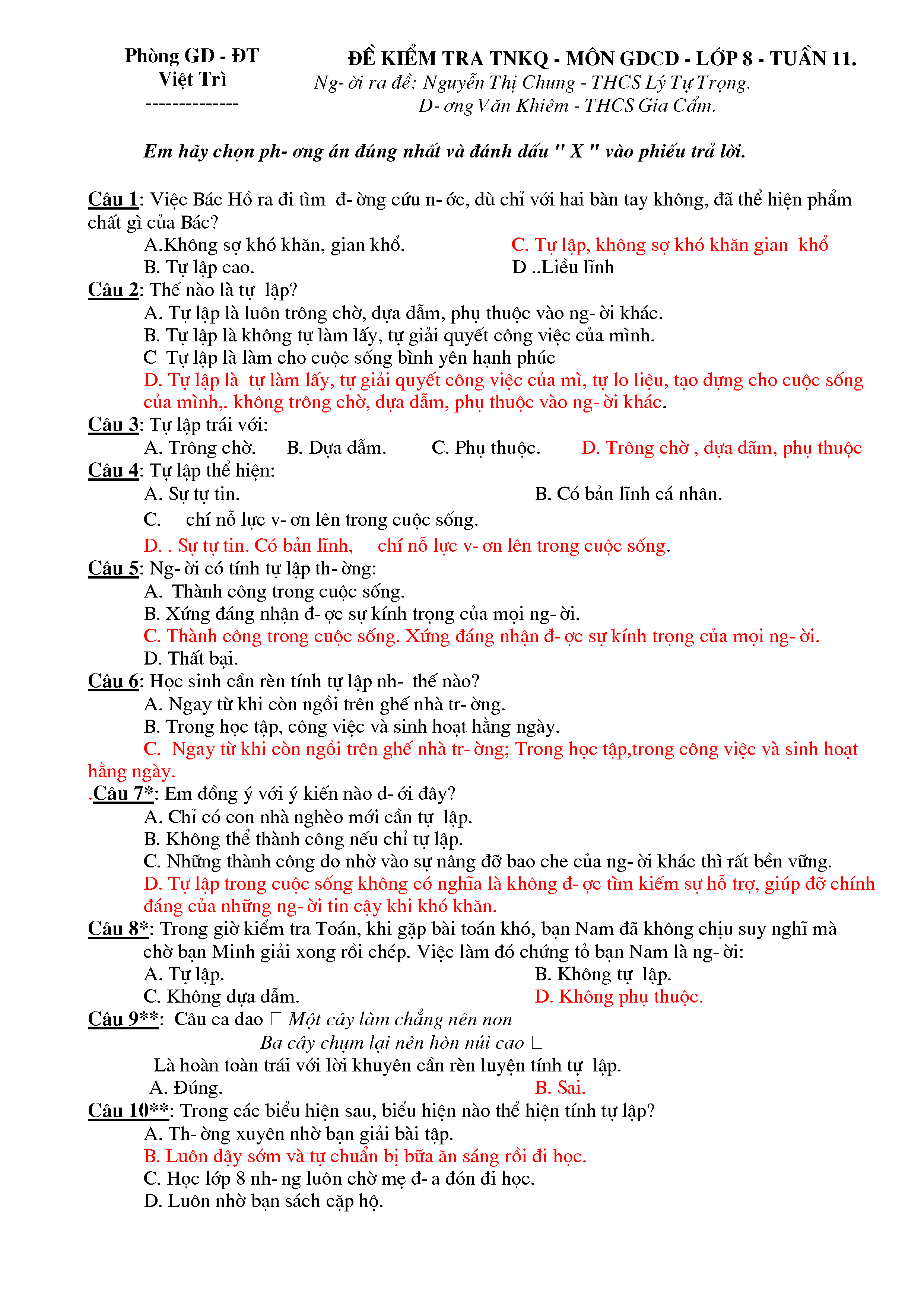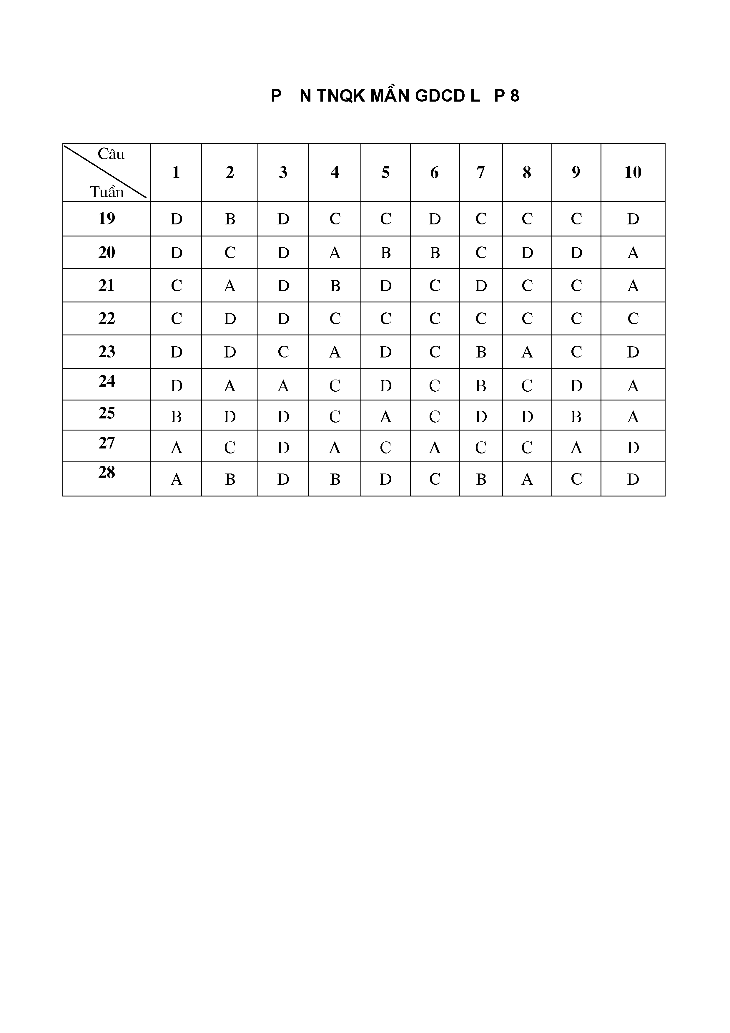 ĐỀ TRẮC NGHIỆM THEO TUẦN - PHẦN 1 - GDCD - LỚP 8