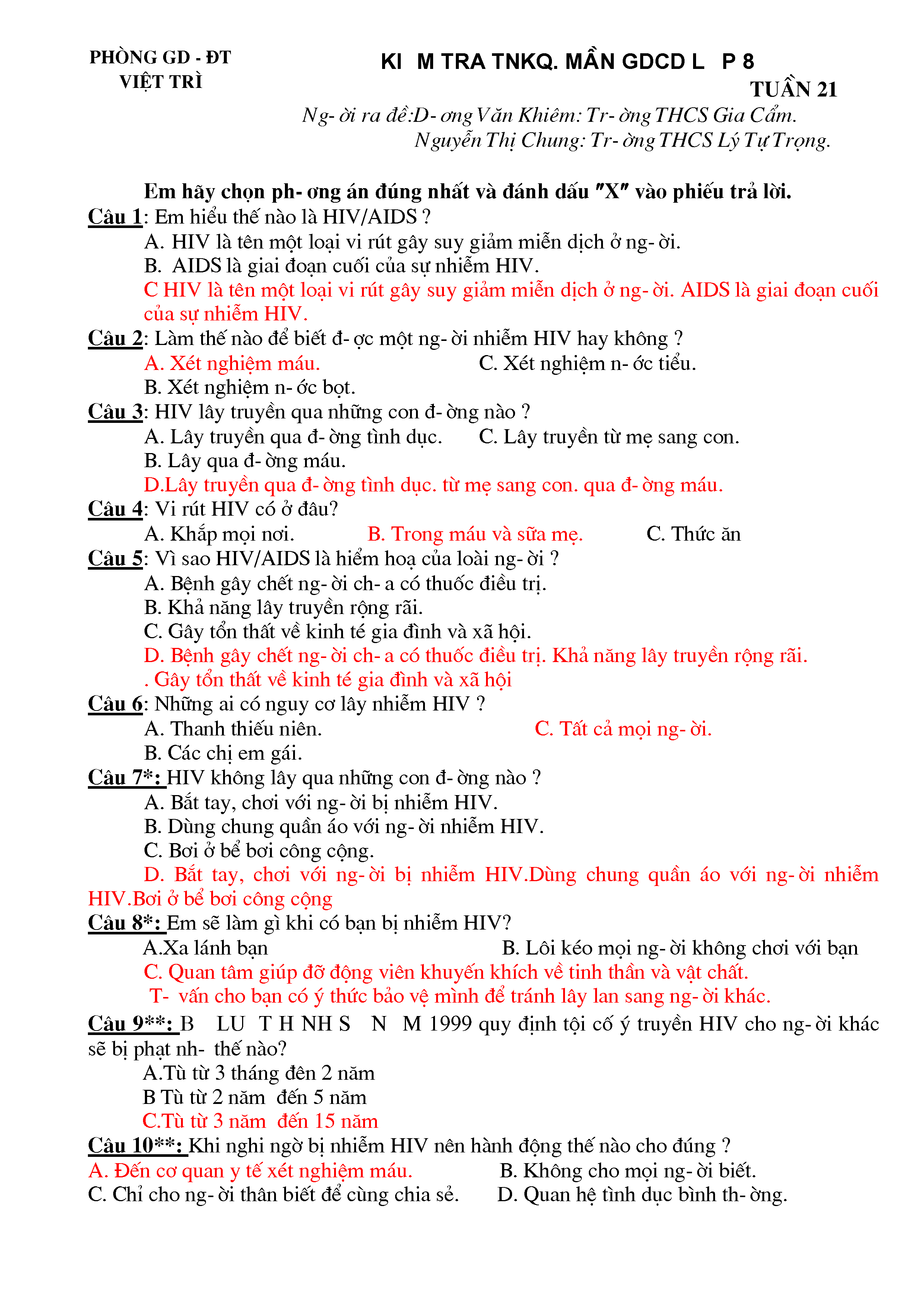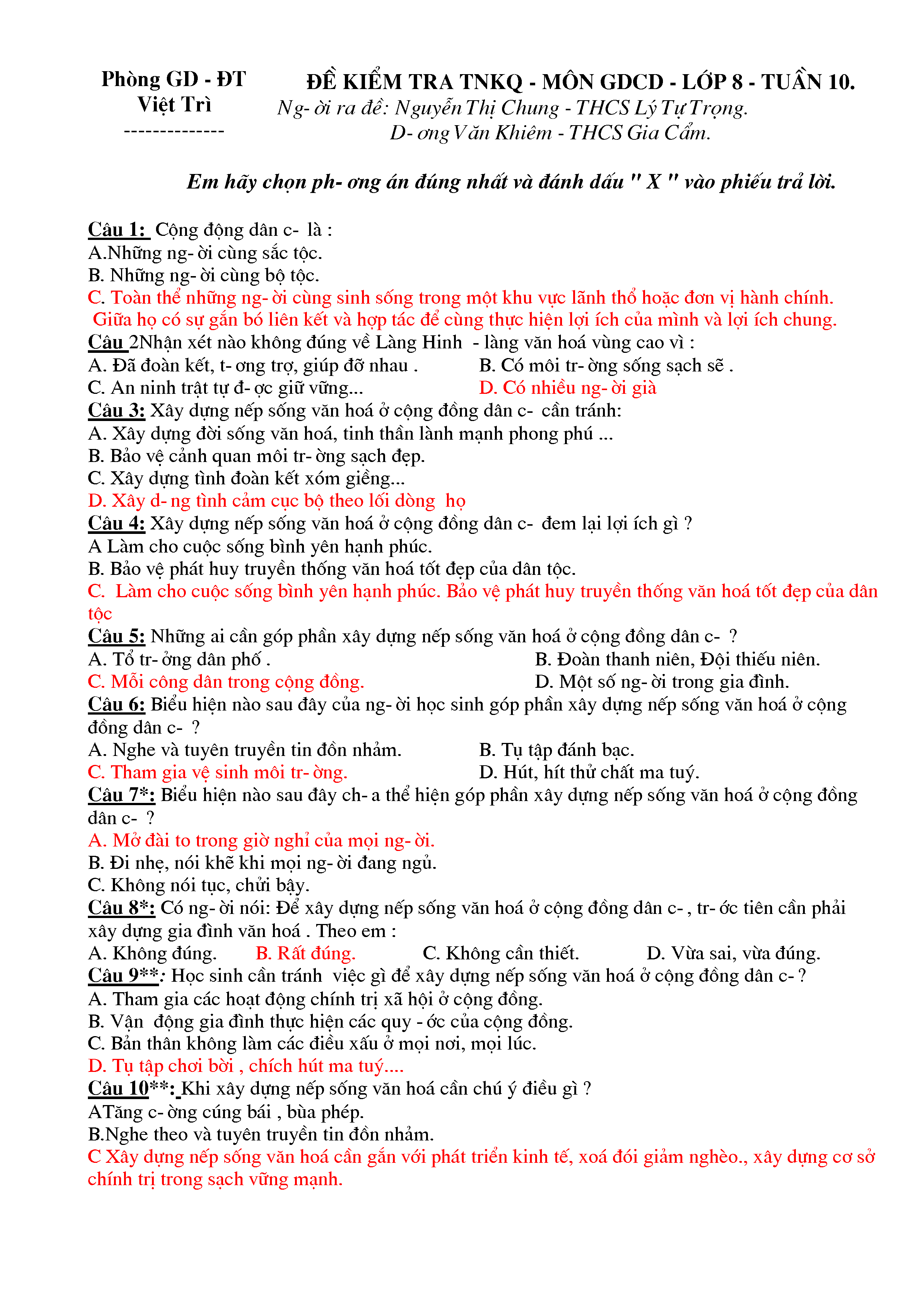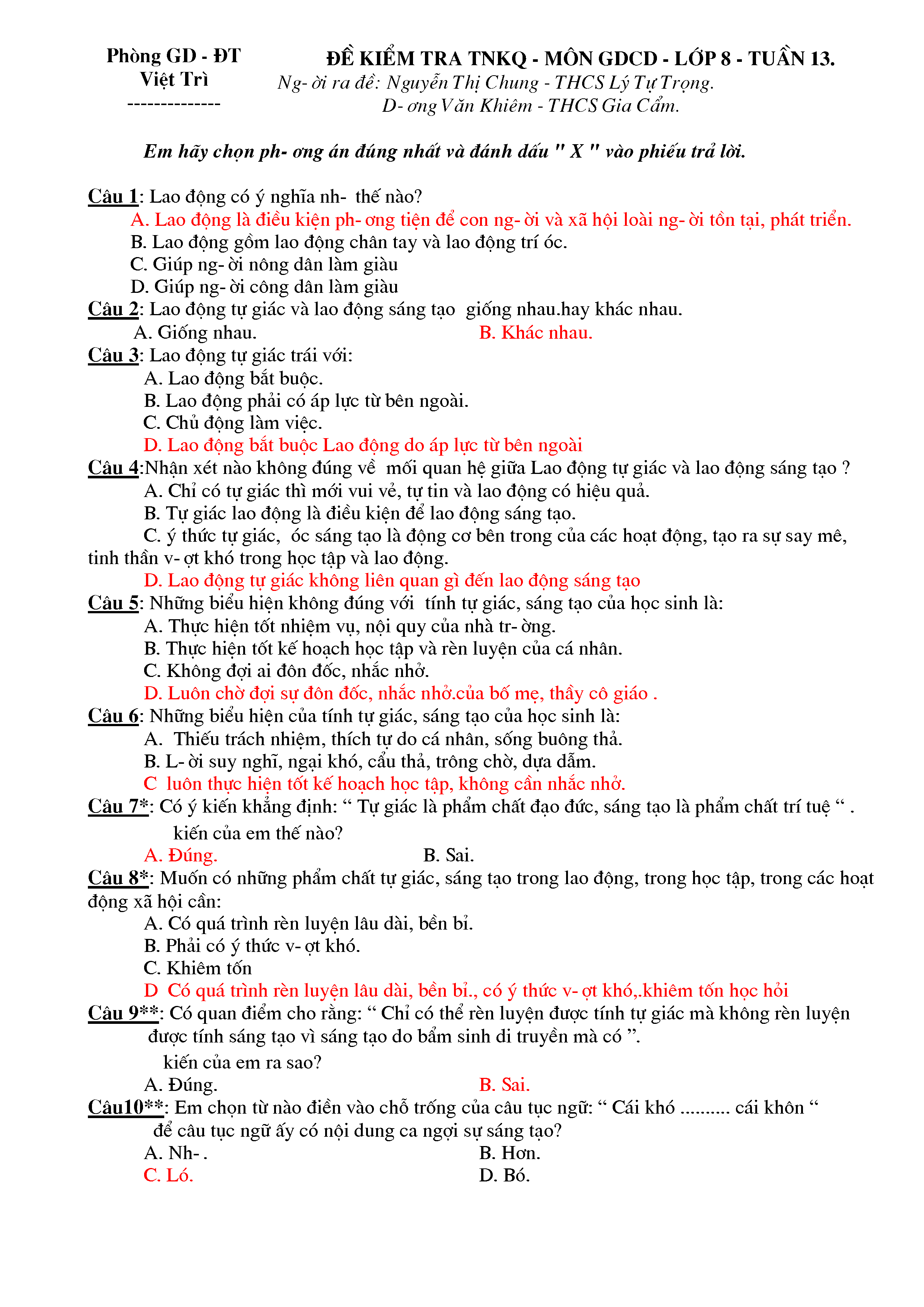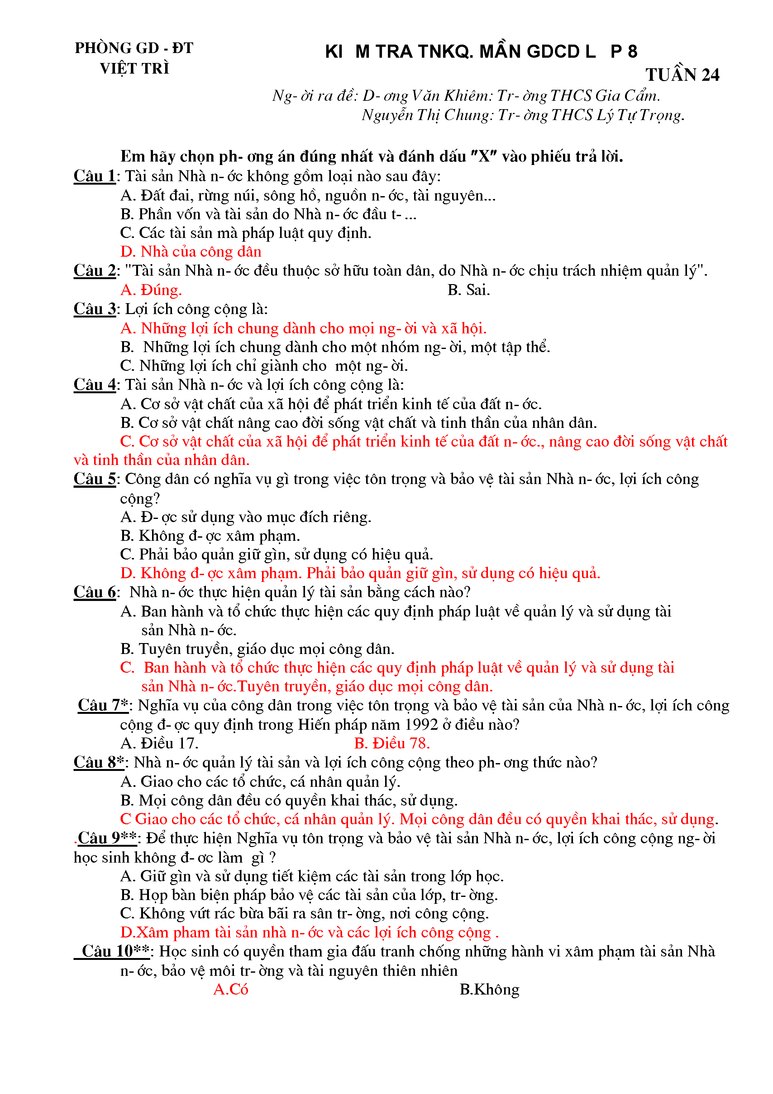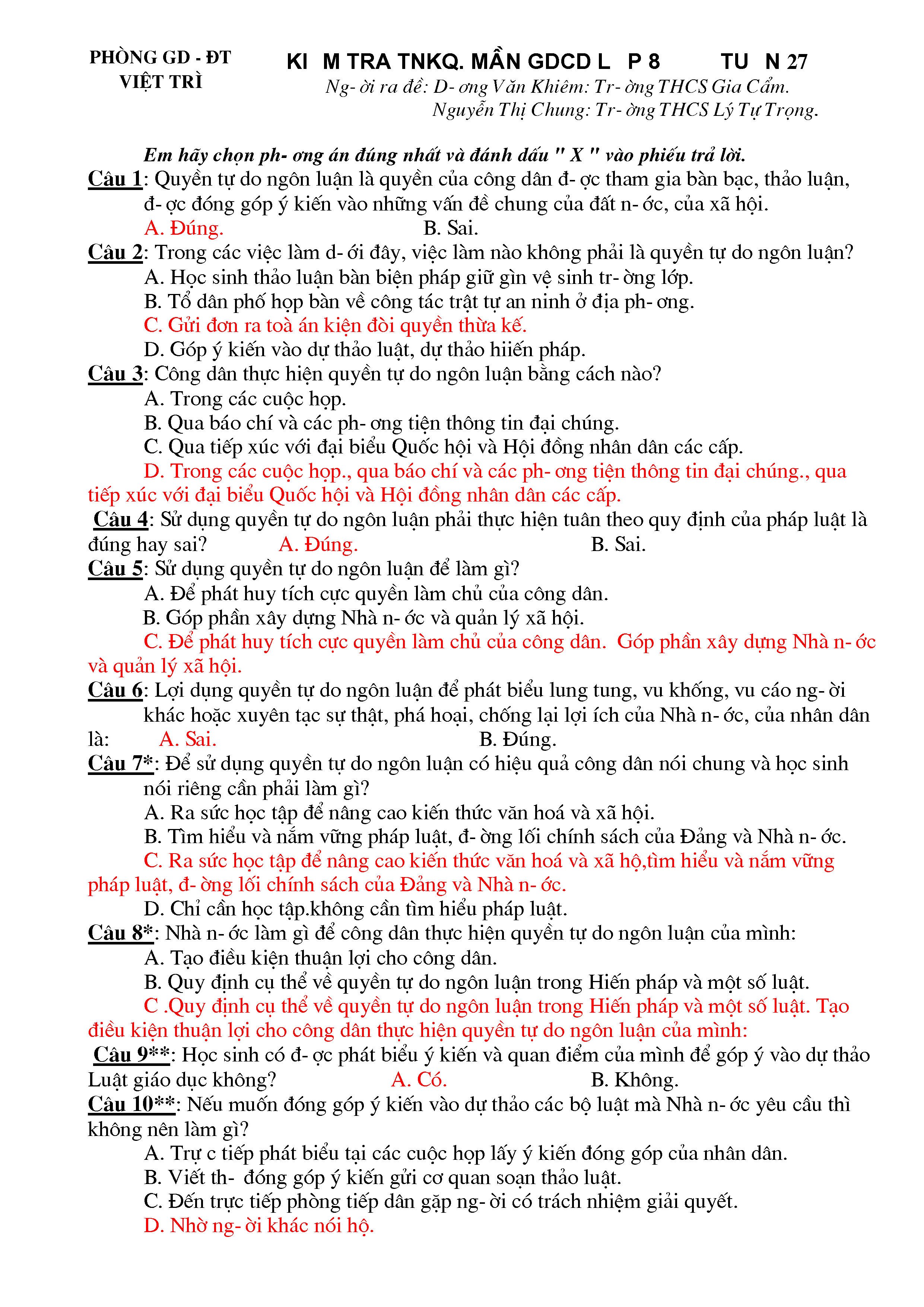 ĐỀ TRẮC NGHIỆM THEO TUẦN - PHẦN 1 - GDCD - LỚP 8