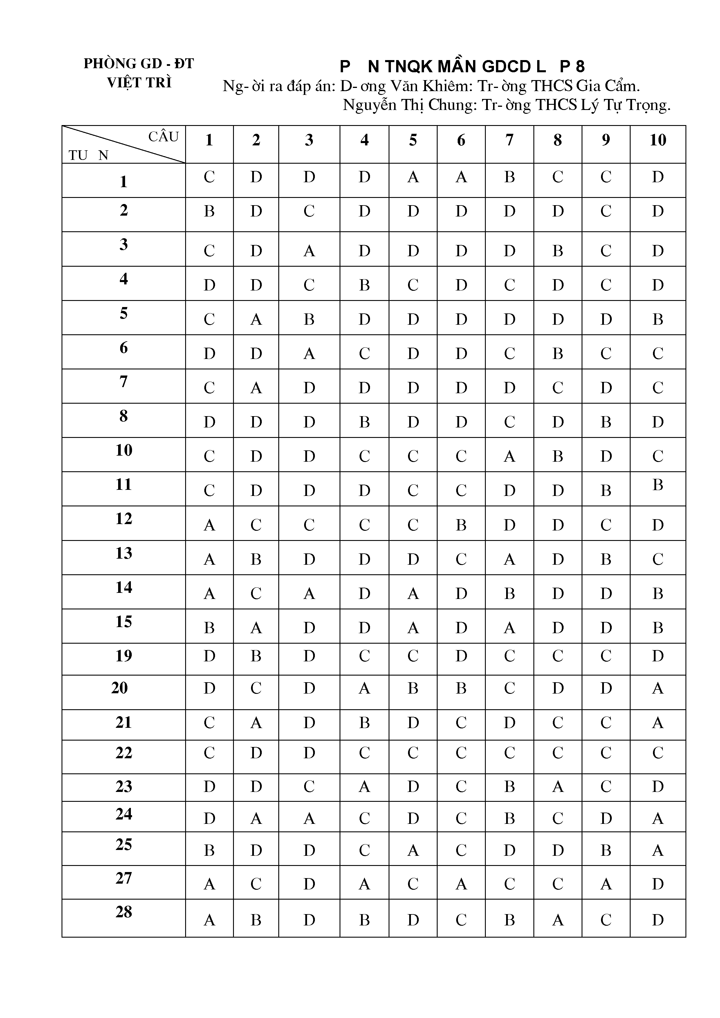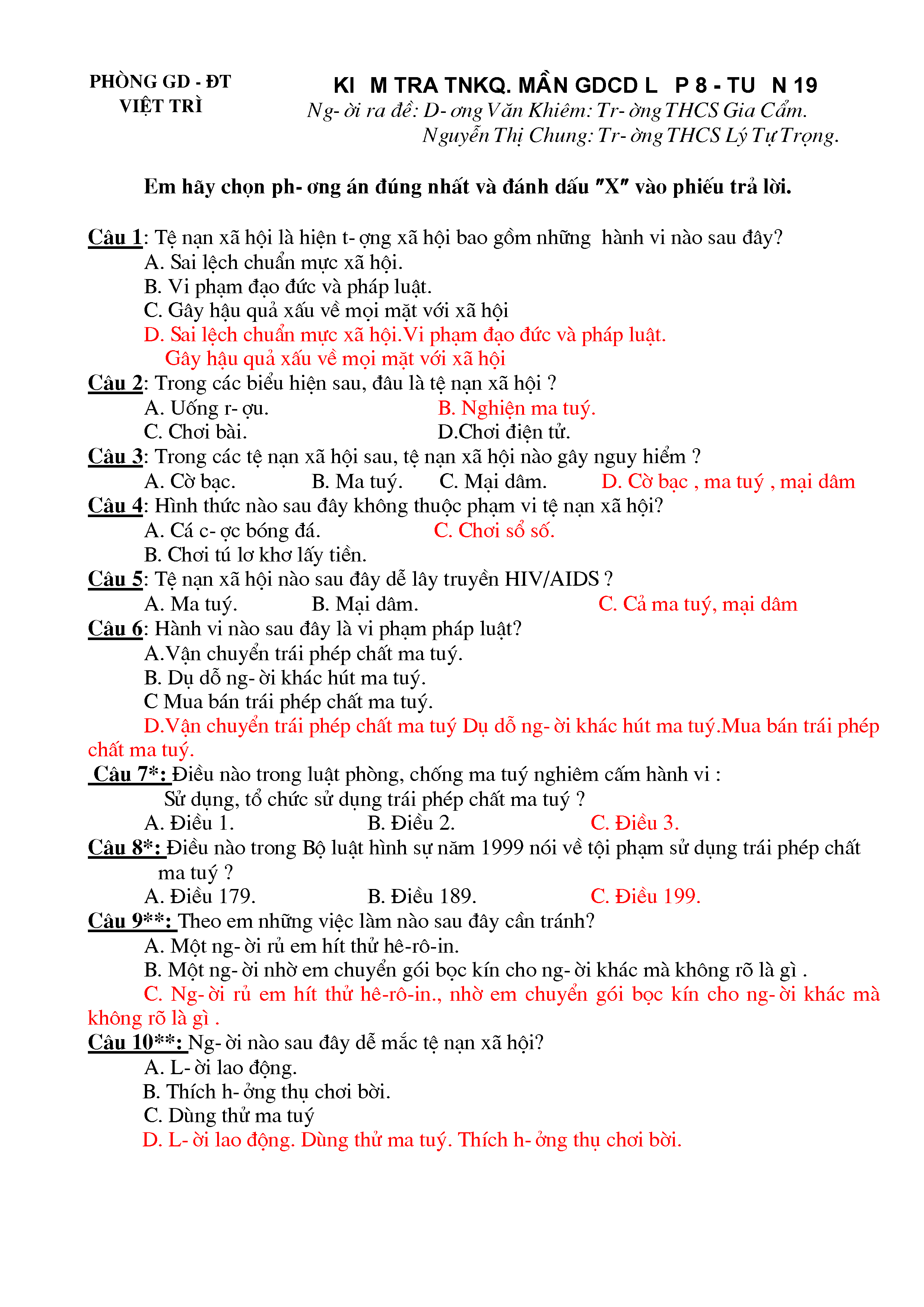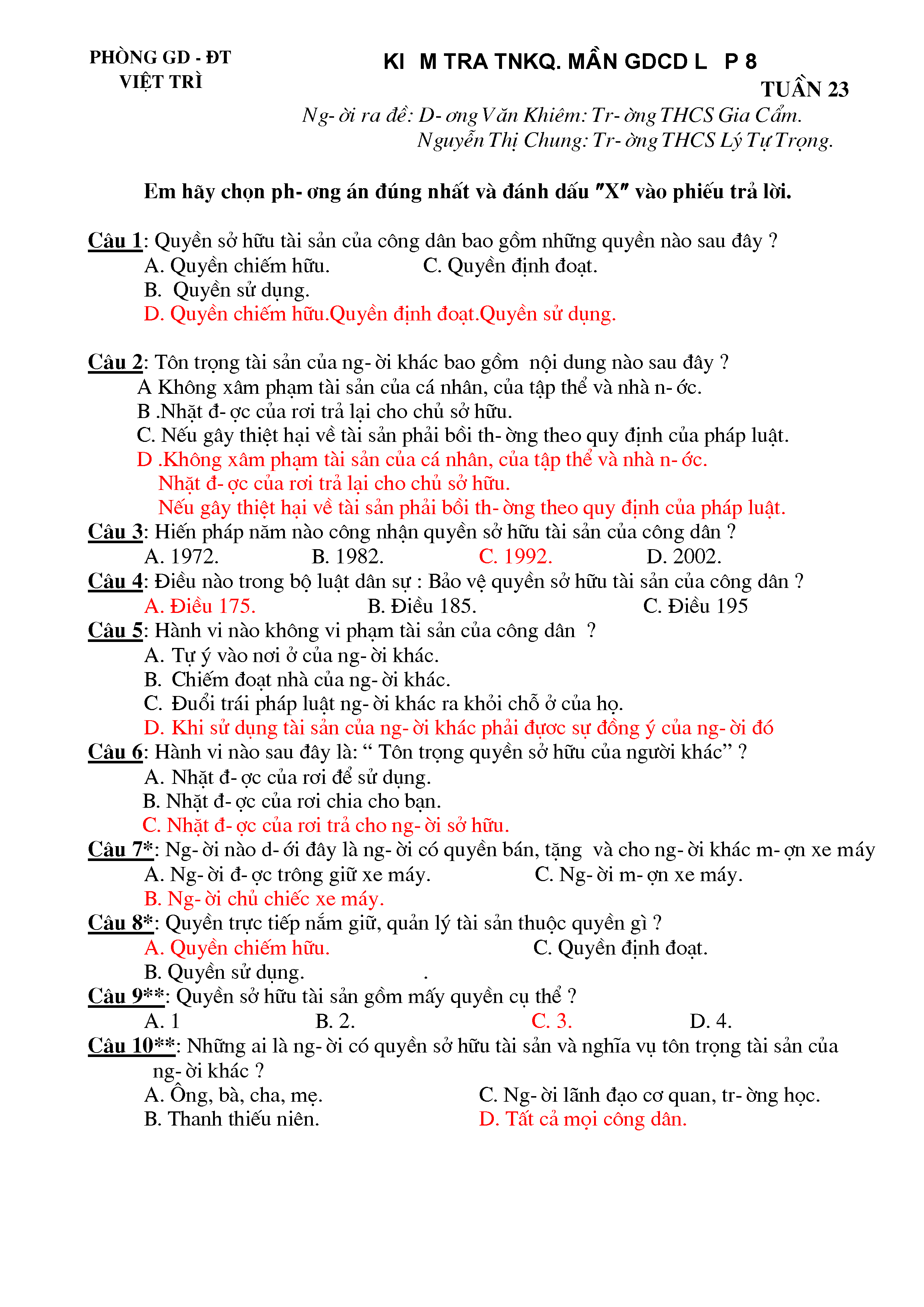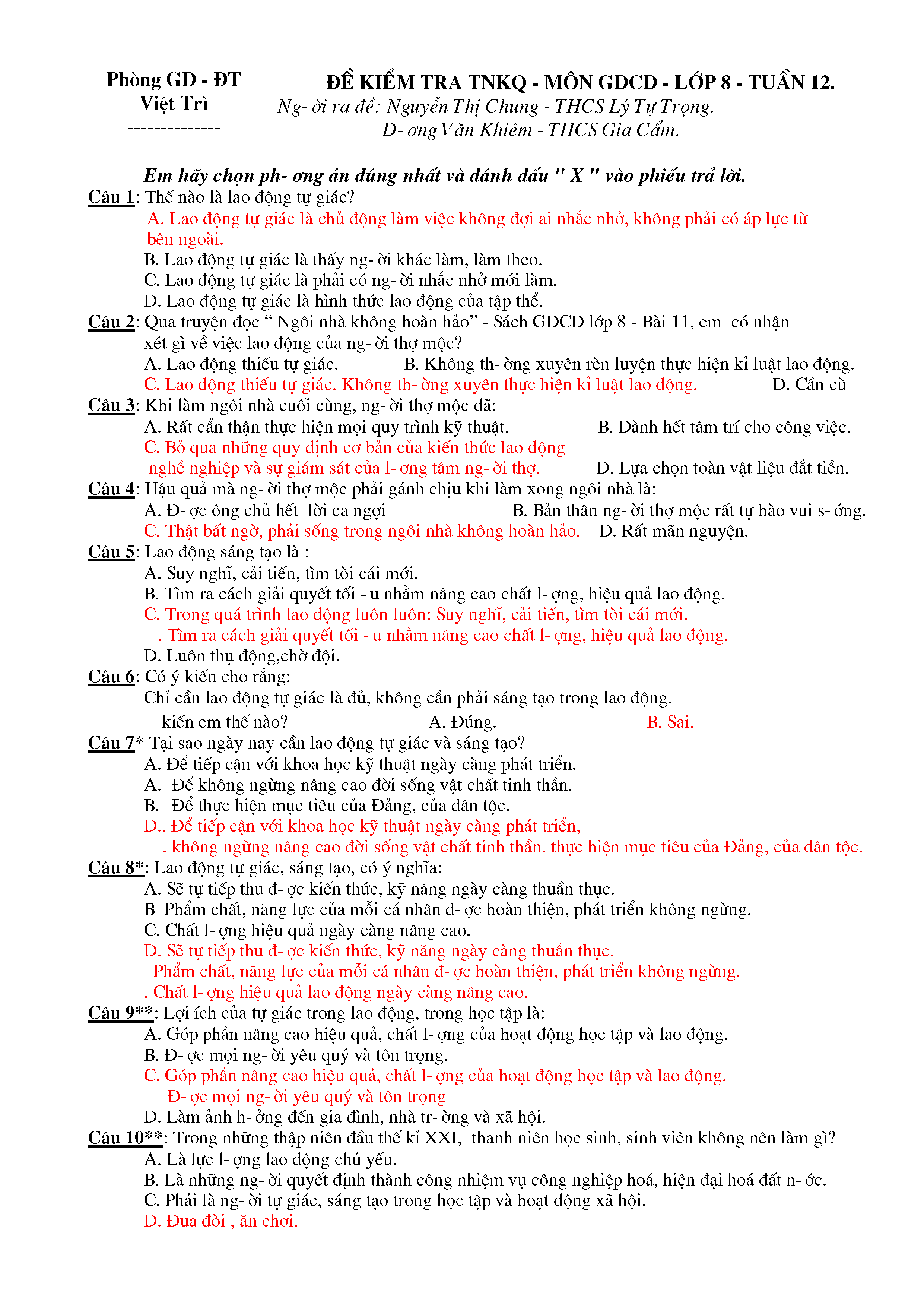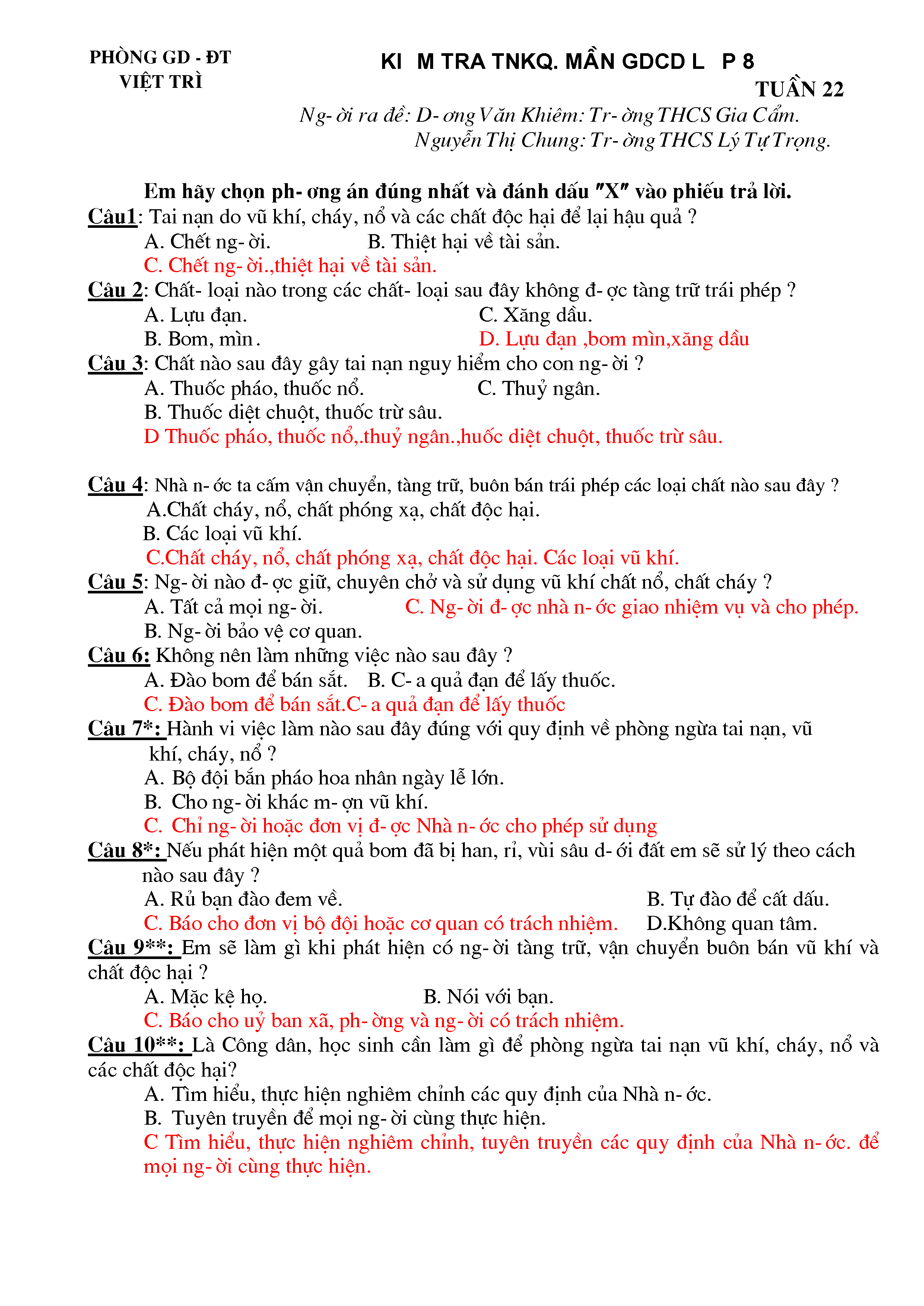ĐỀ TRẮC NGHIỆM THEO TUẦN - PHẦN 1 - GDCD - LỚP 8