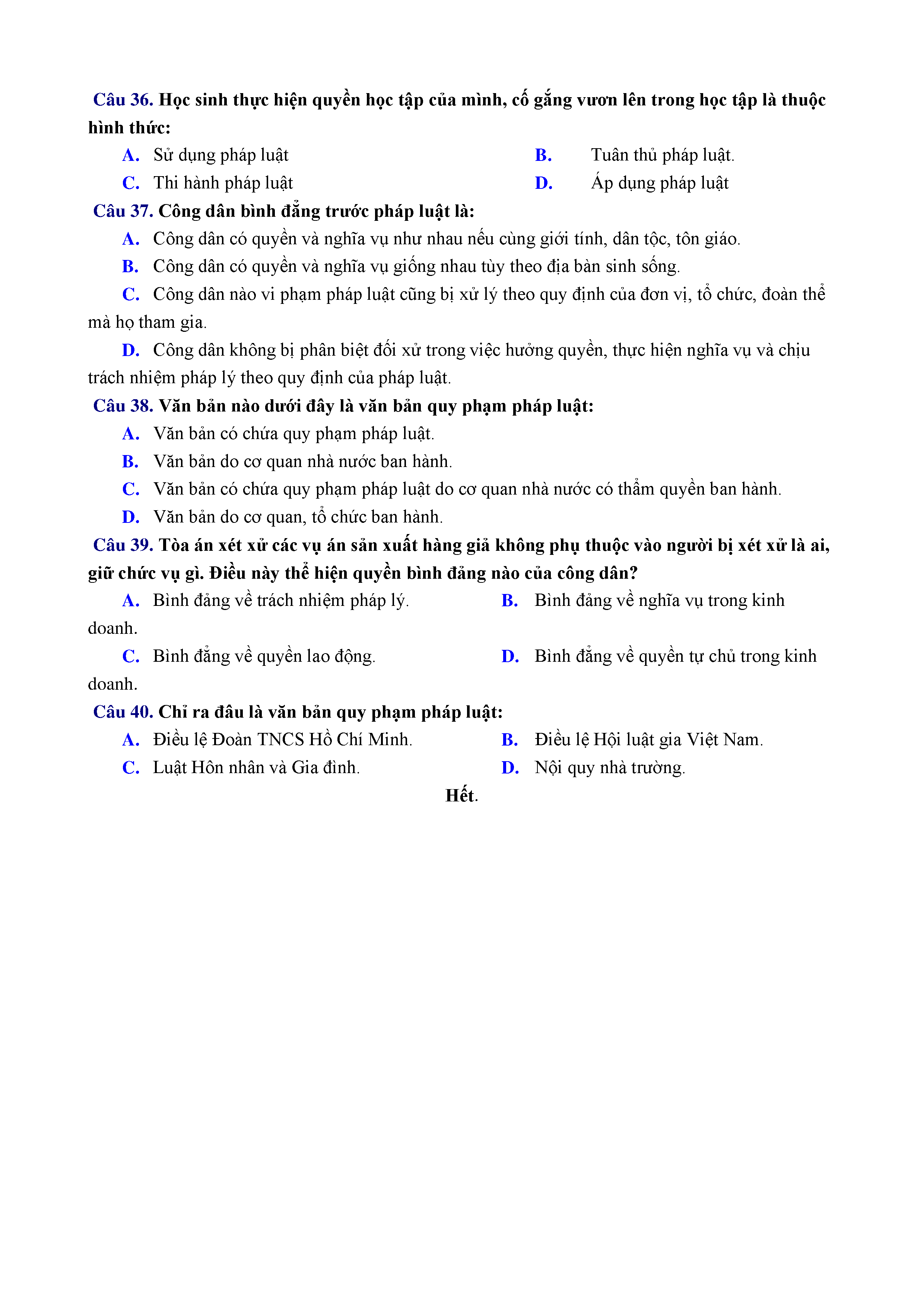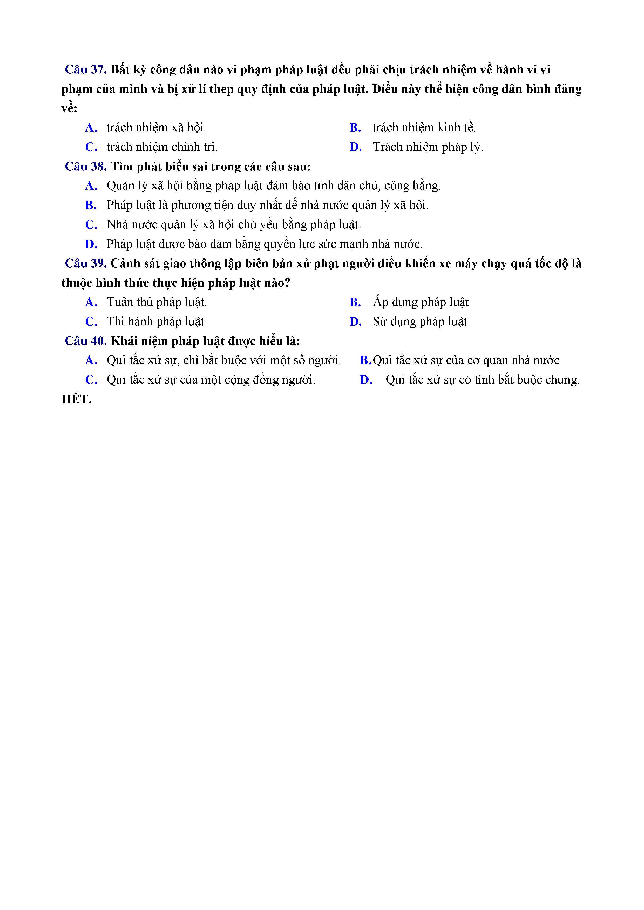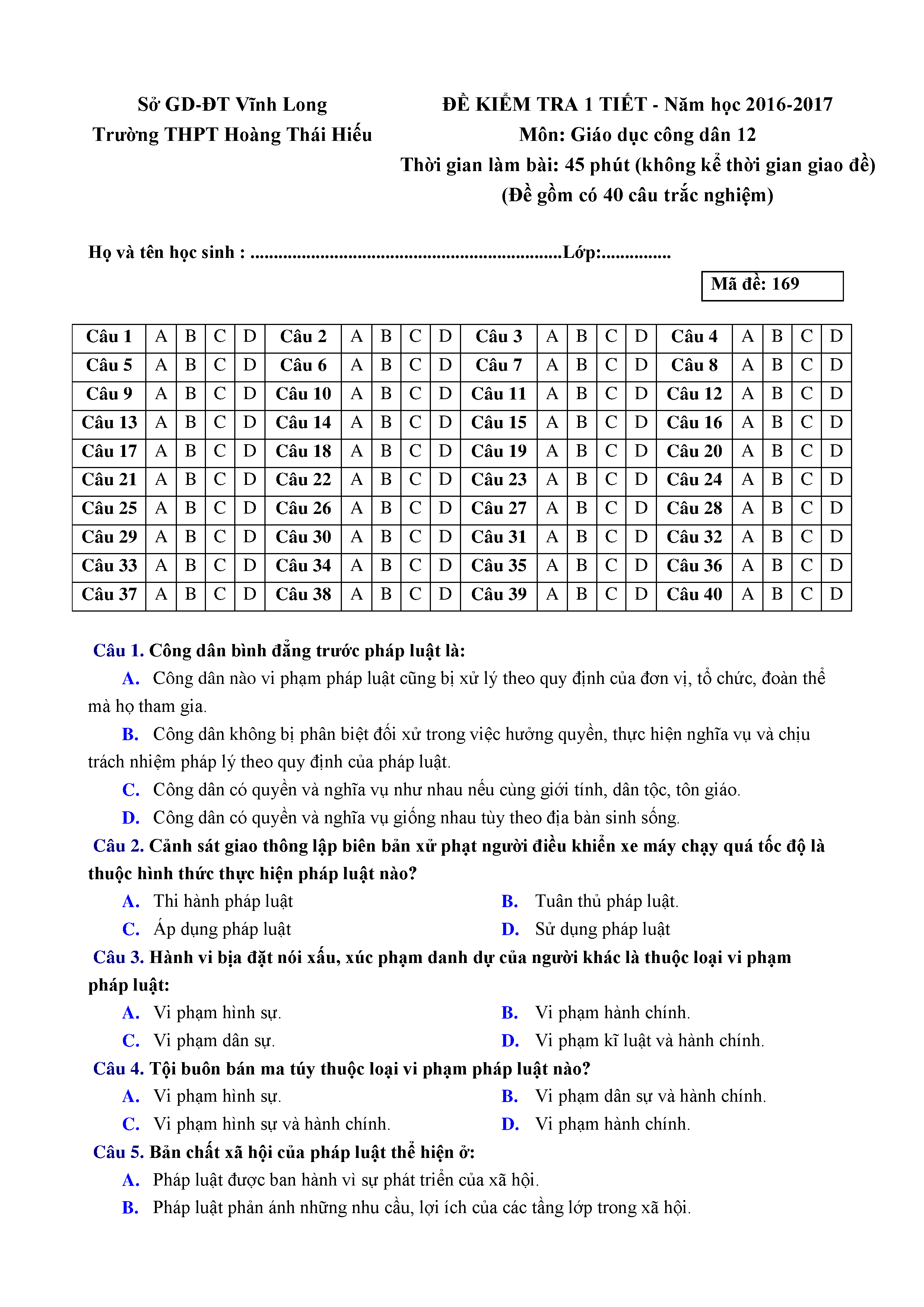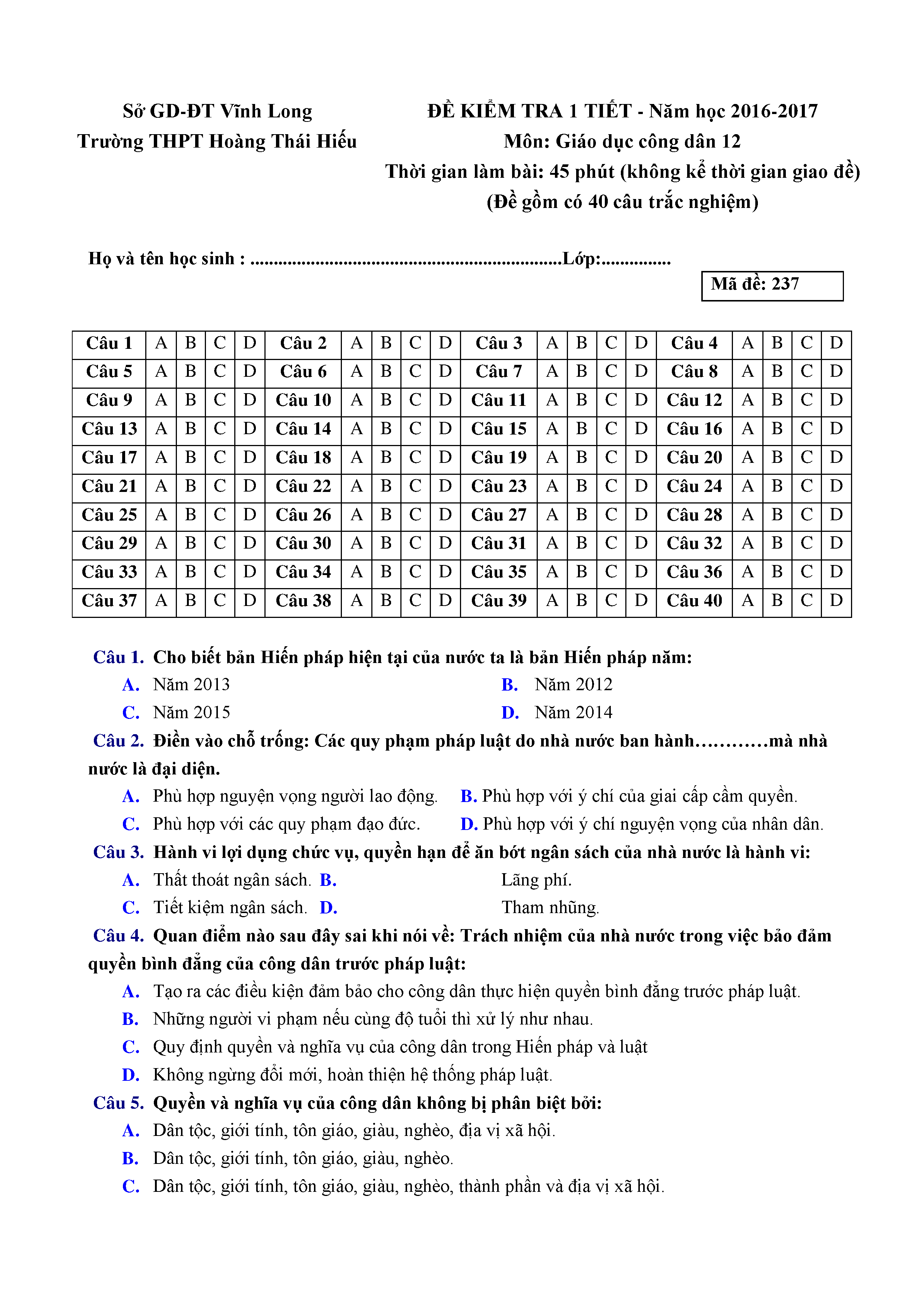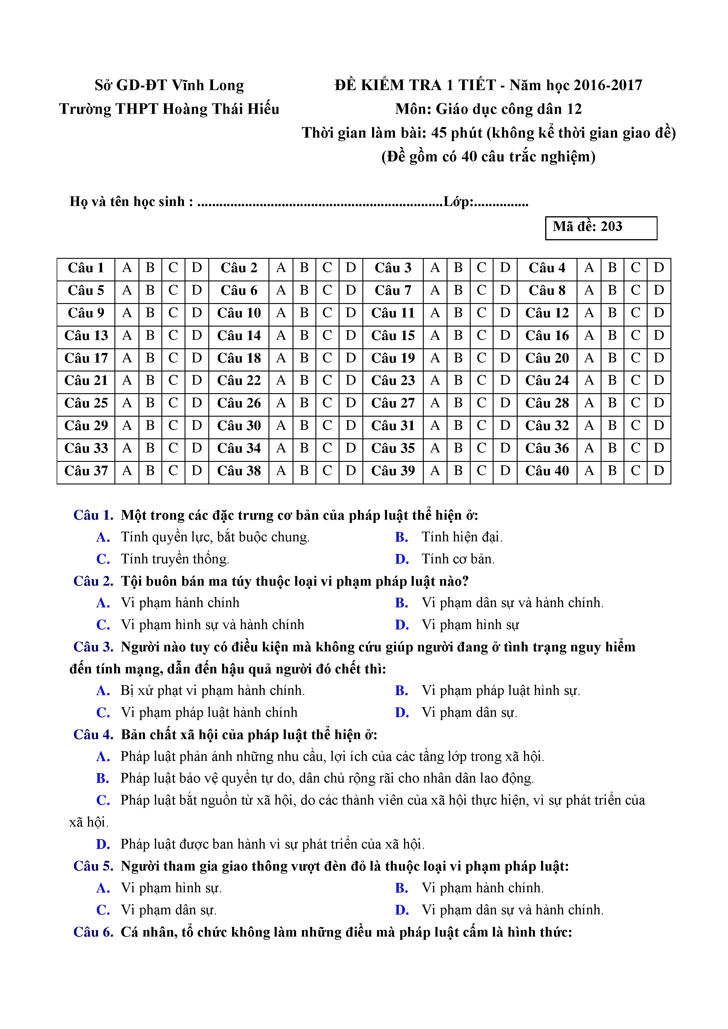 ĐỀ KT 1 TIẾT - GDCD - LỚP 12