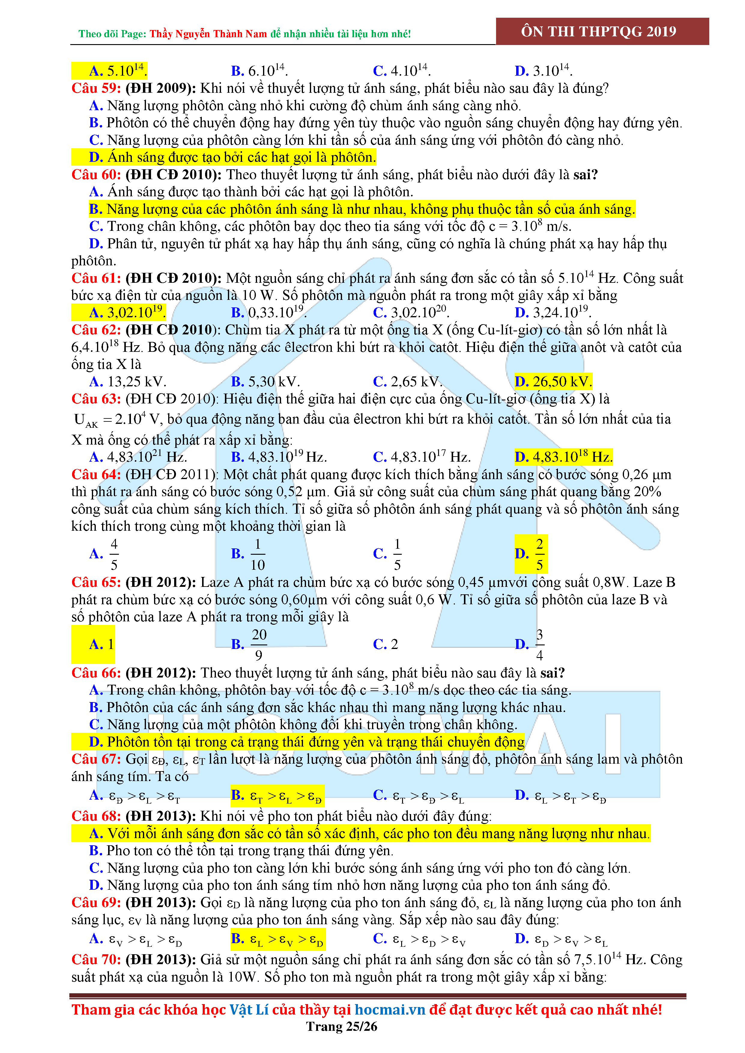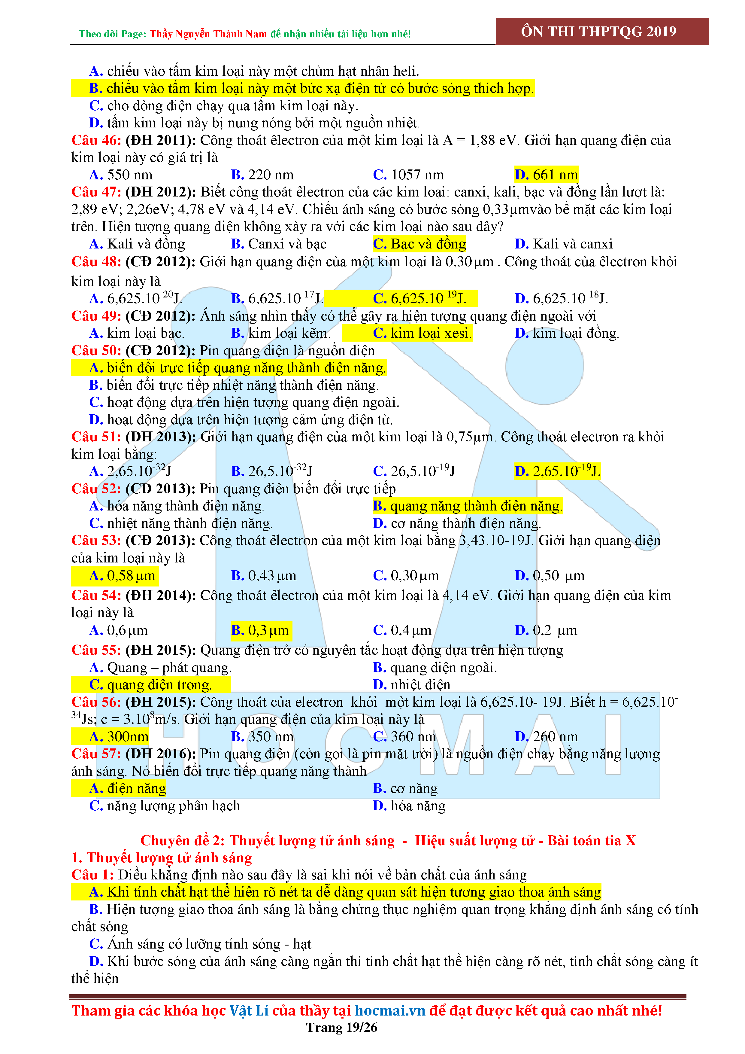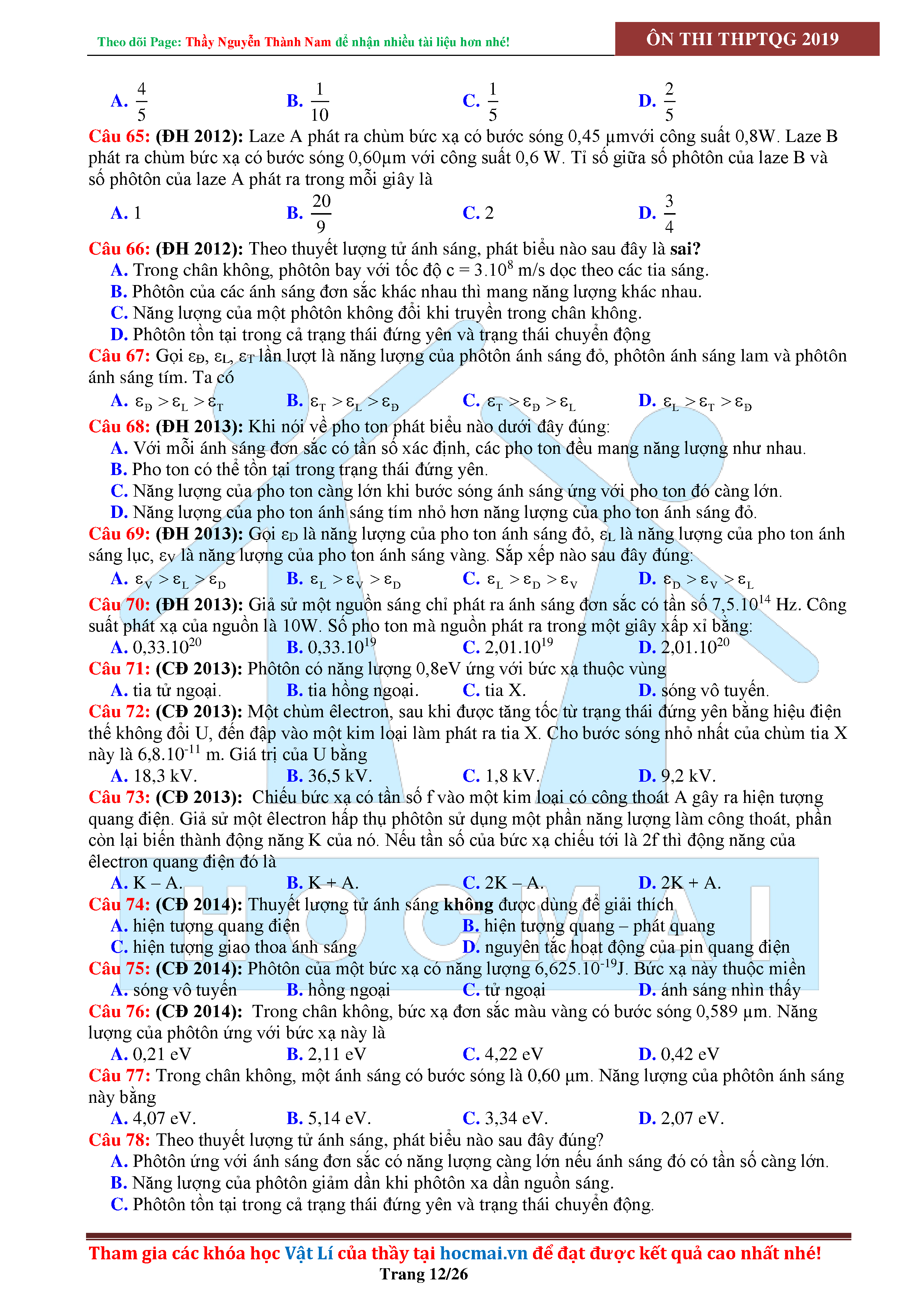 + Tổng hợp các bài tập chương lương tử ánh sáng trong các bài thi tốt nghiệp THPT, Cao đẳng và Đại học các năm.