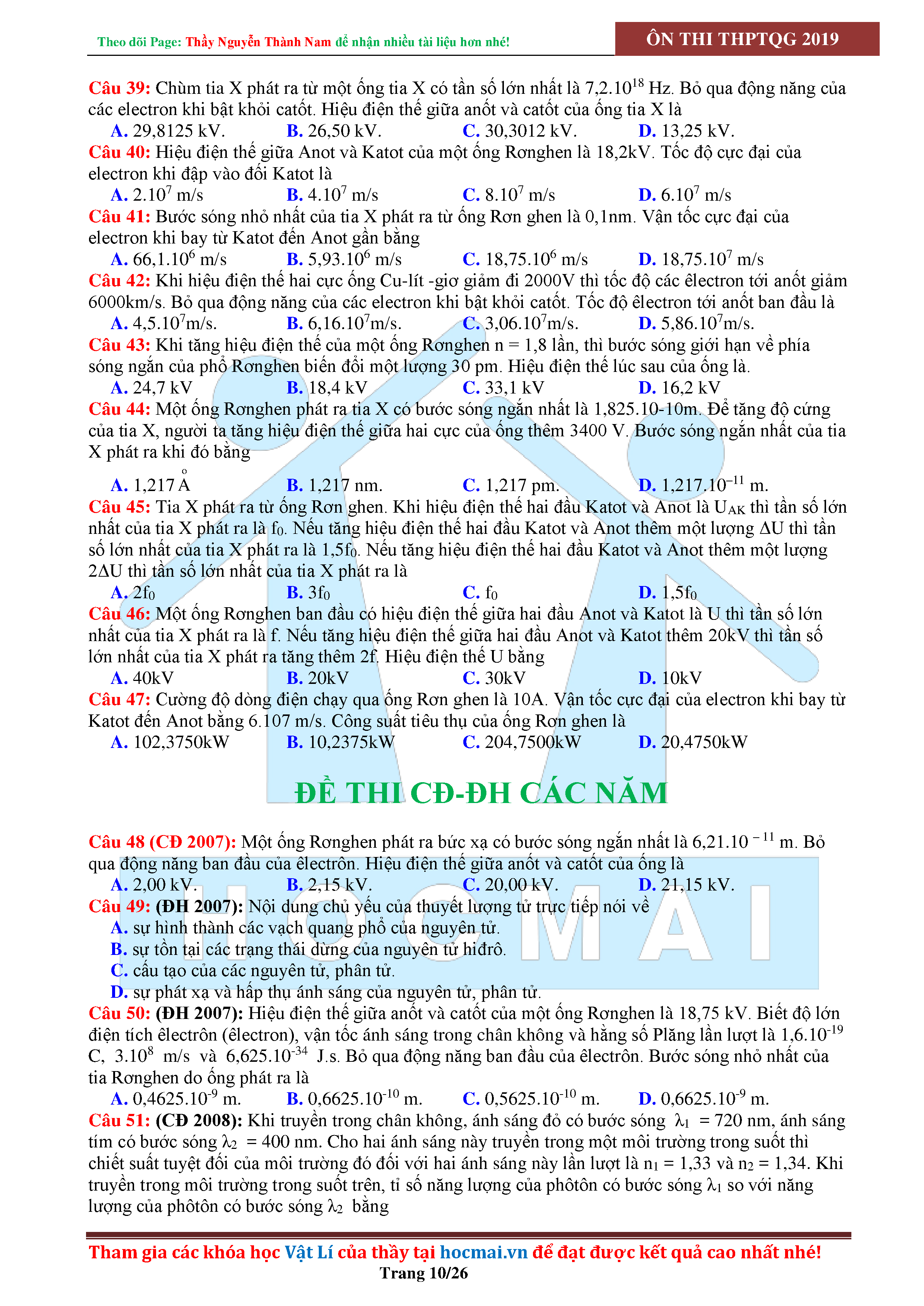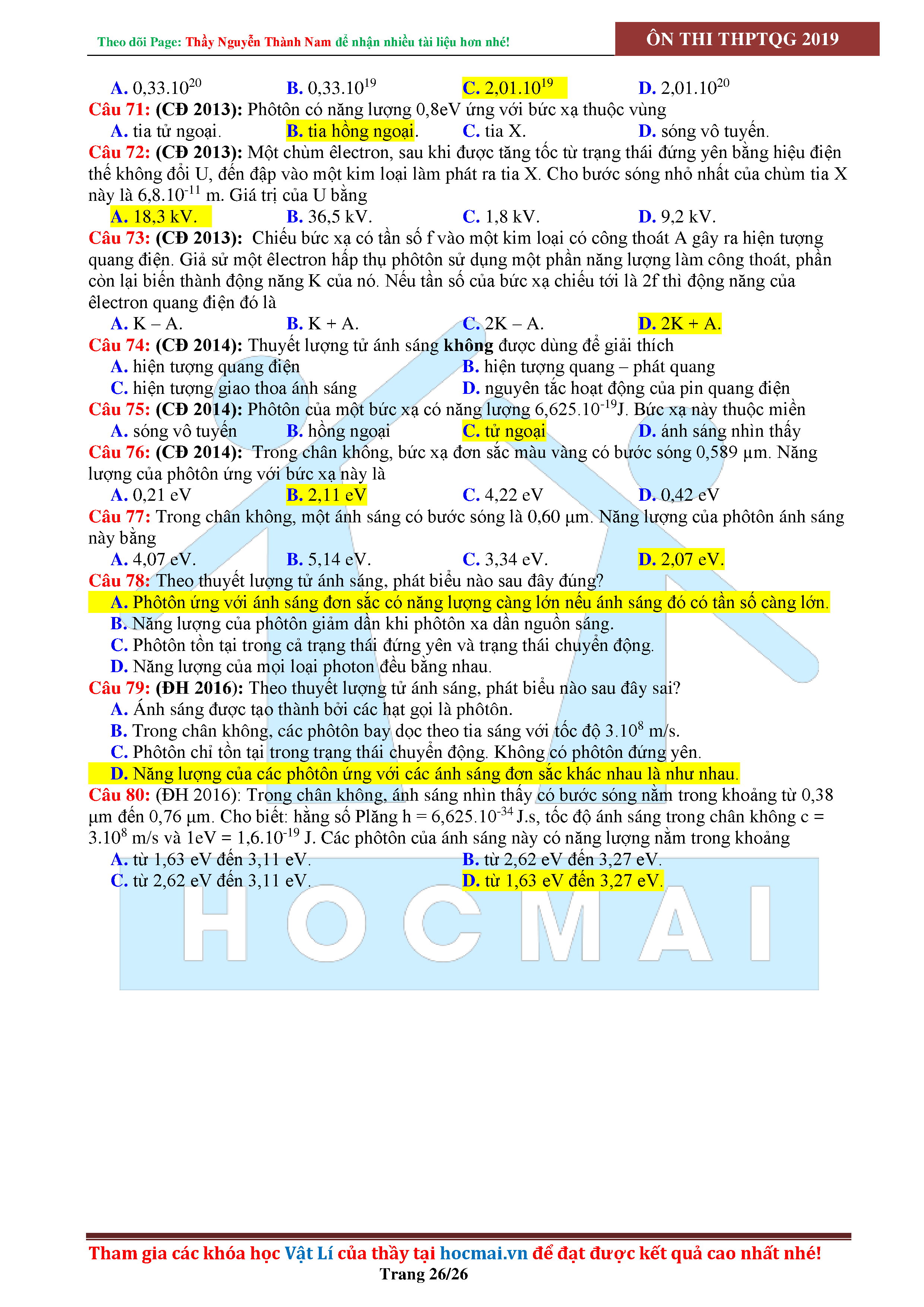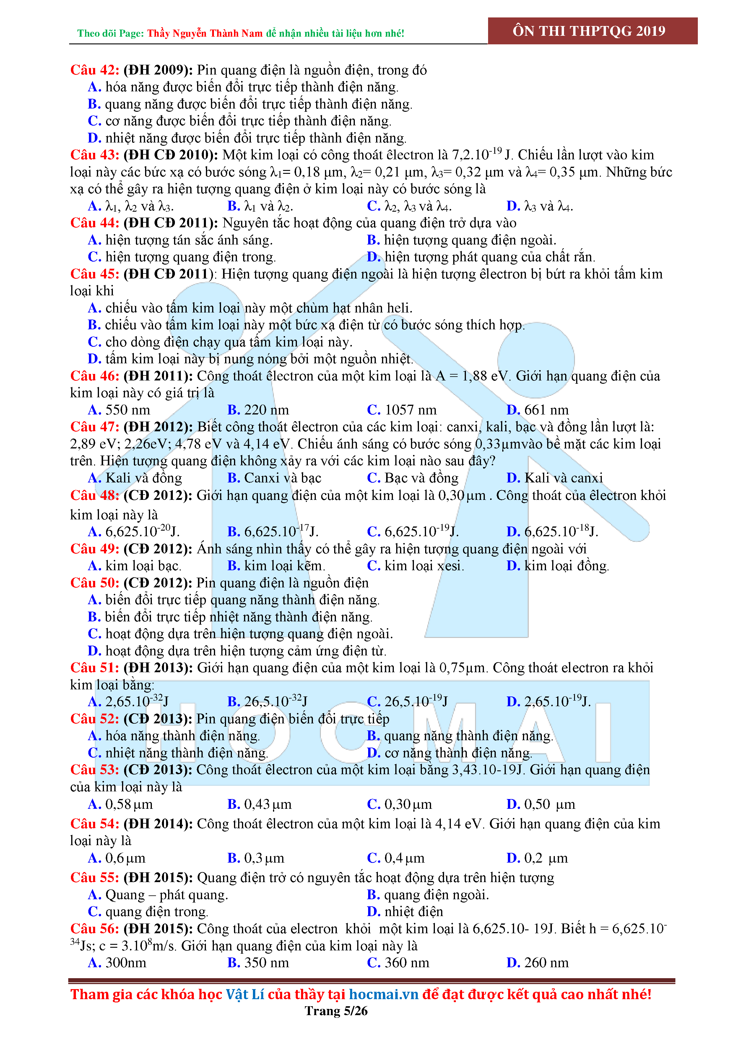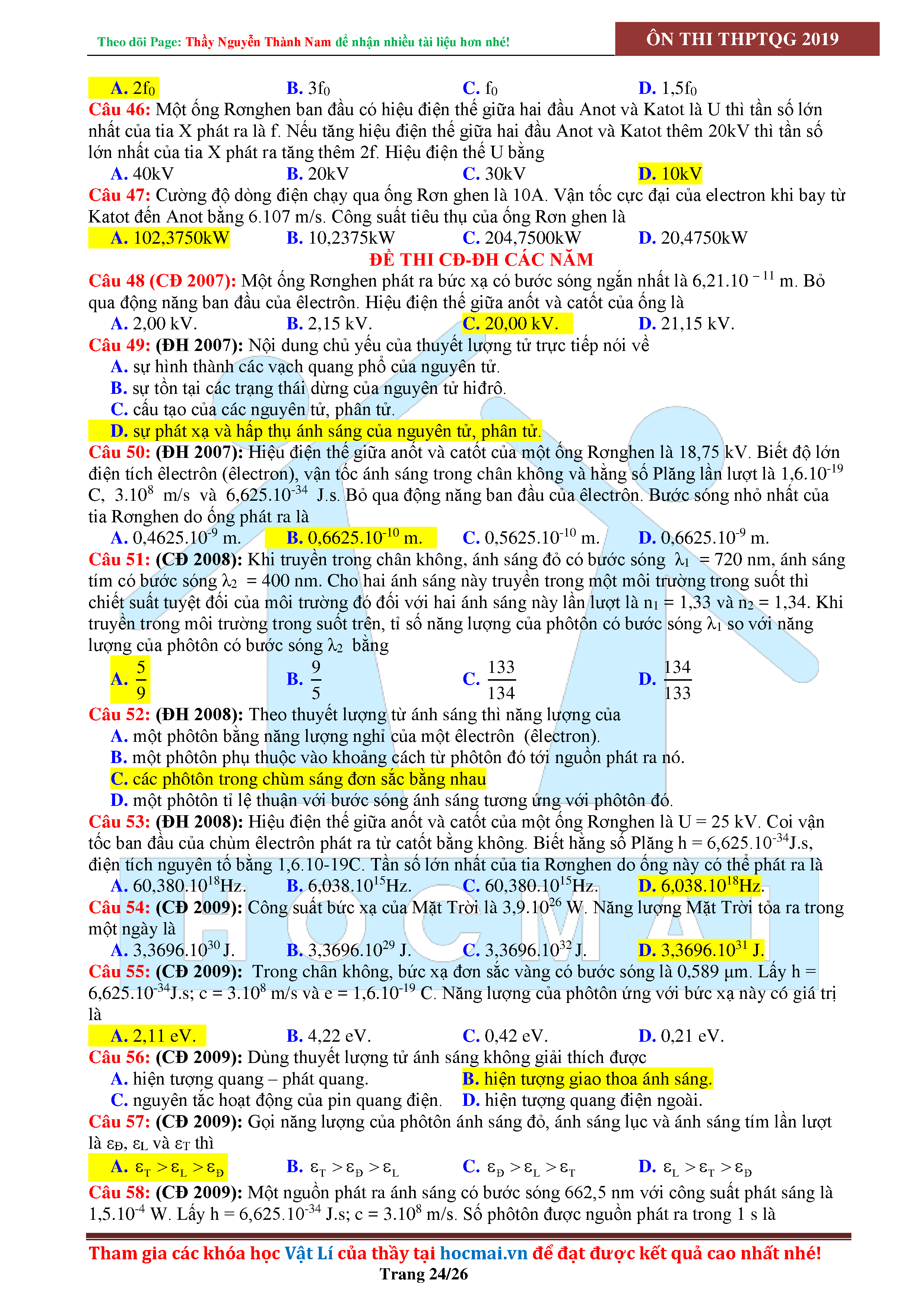 + Tổng hợp các bài tập chương lương tử ánh sáng trong các bài thi tốt nghiệp THPT, Cao đẳng và Đại học các năm.