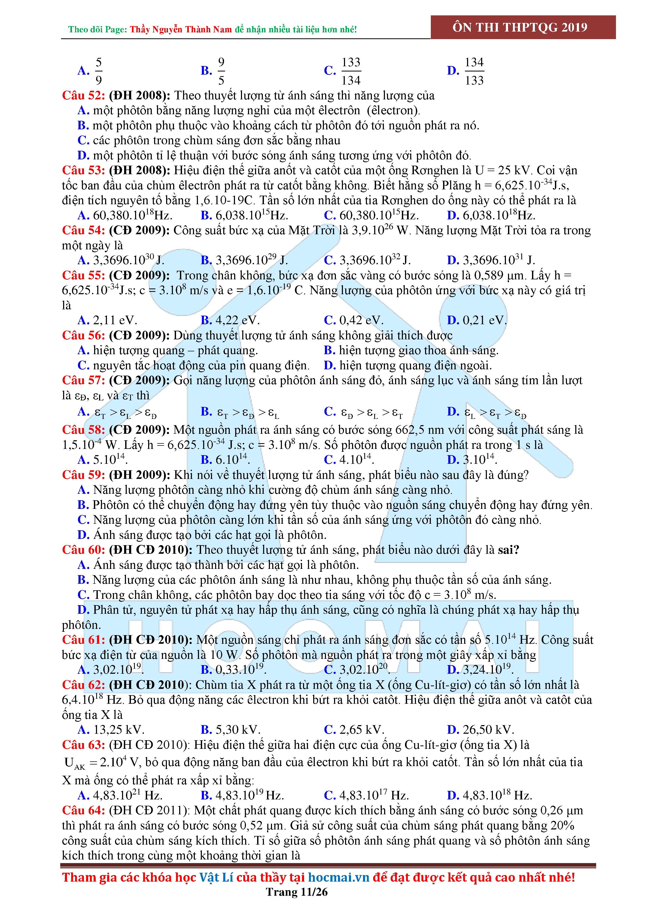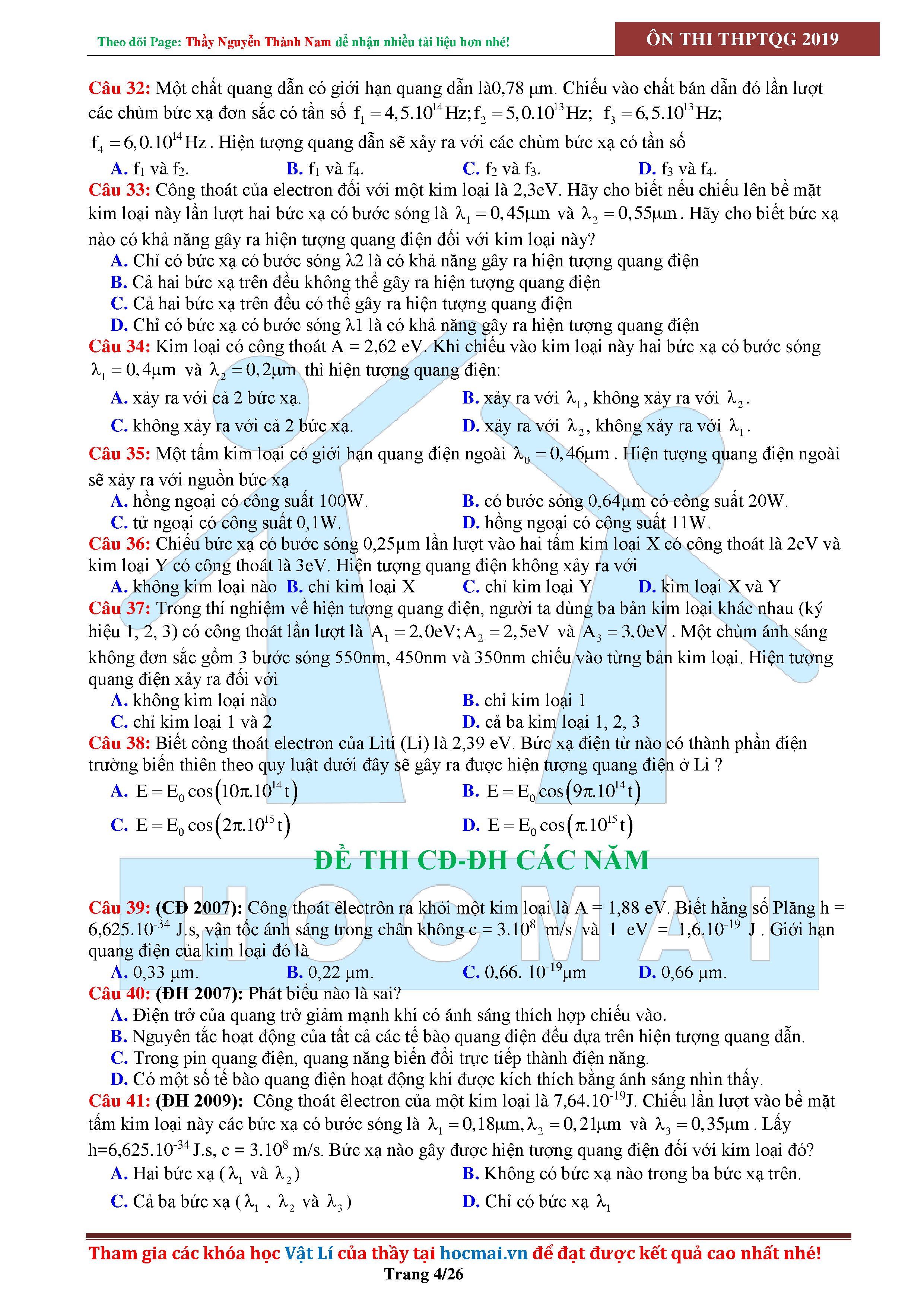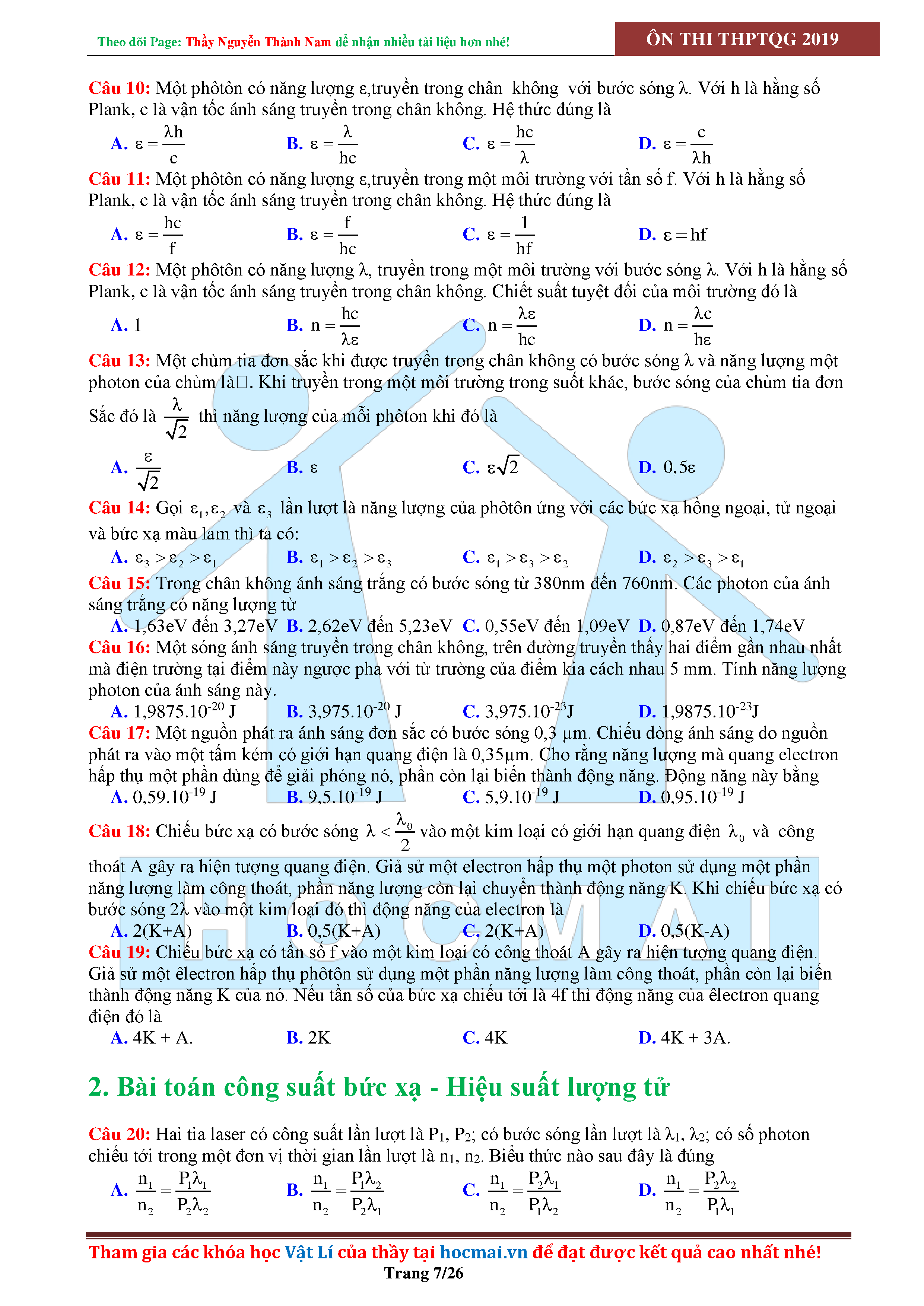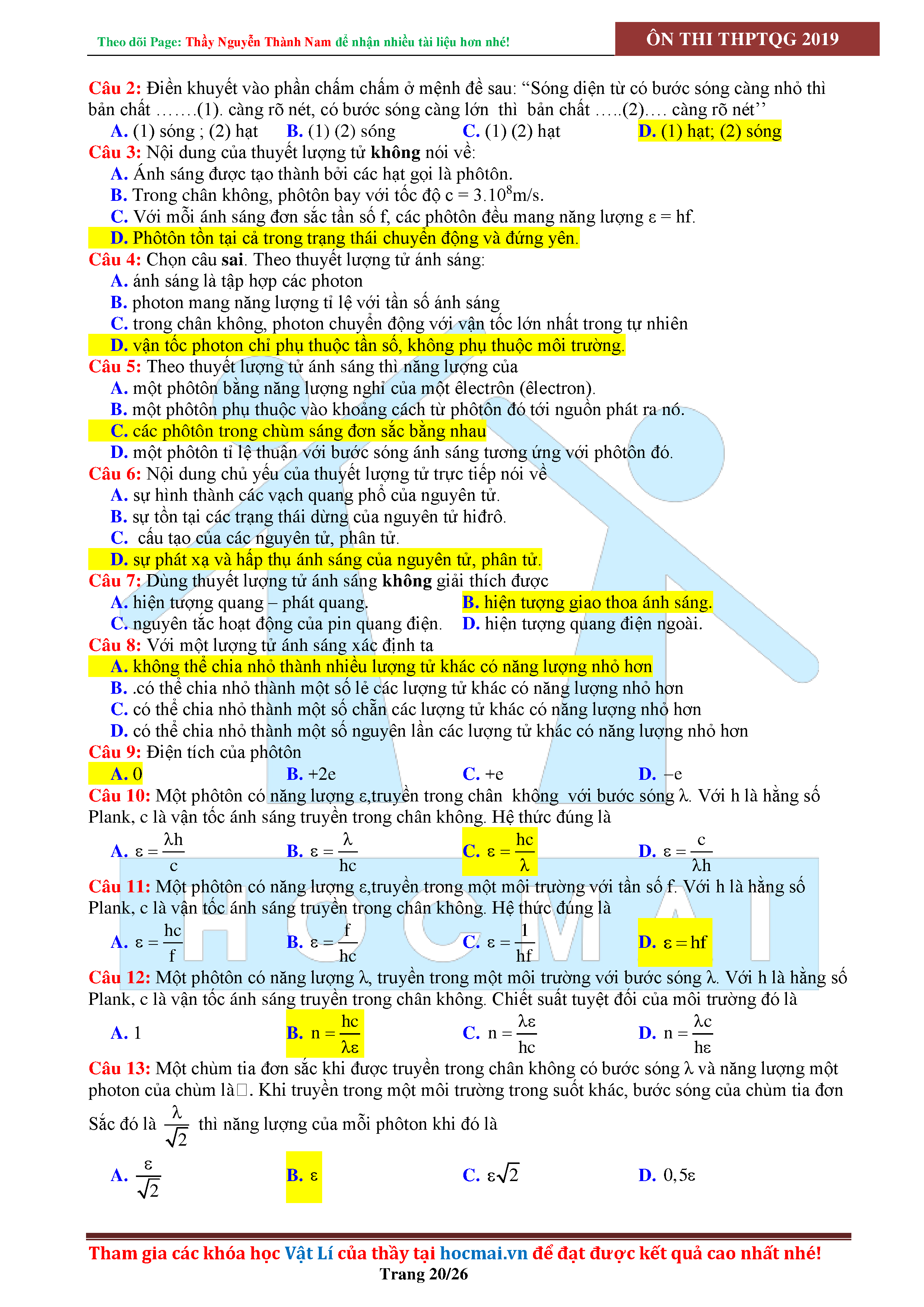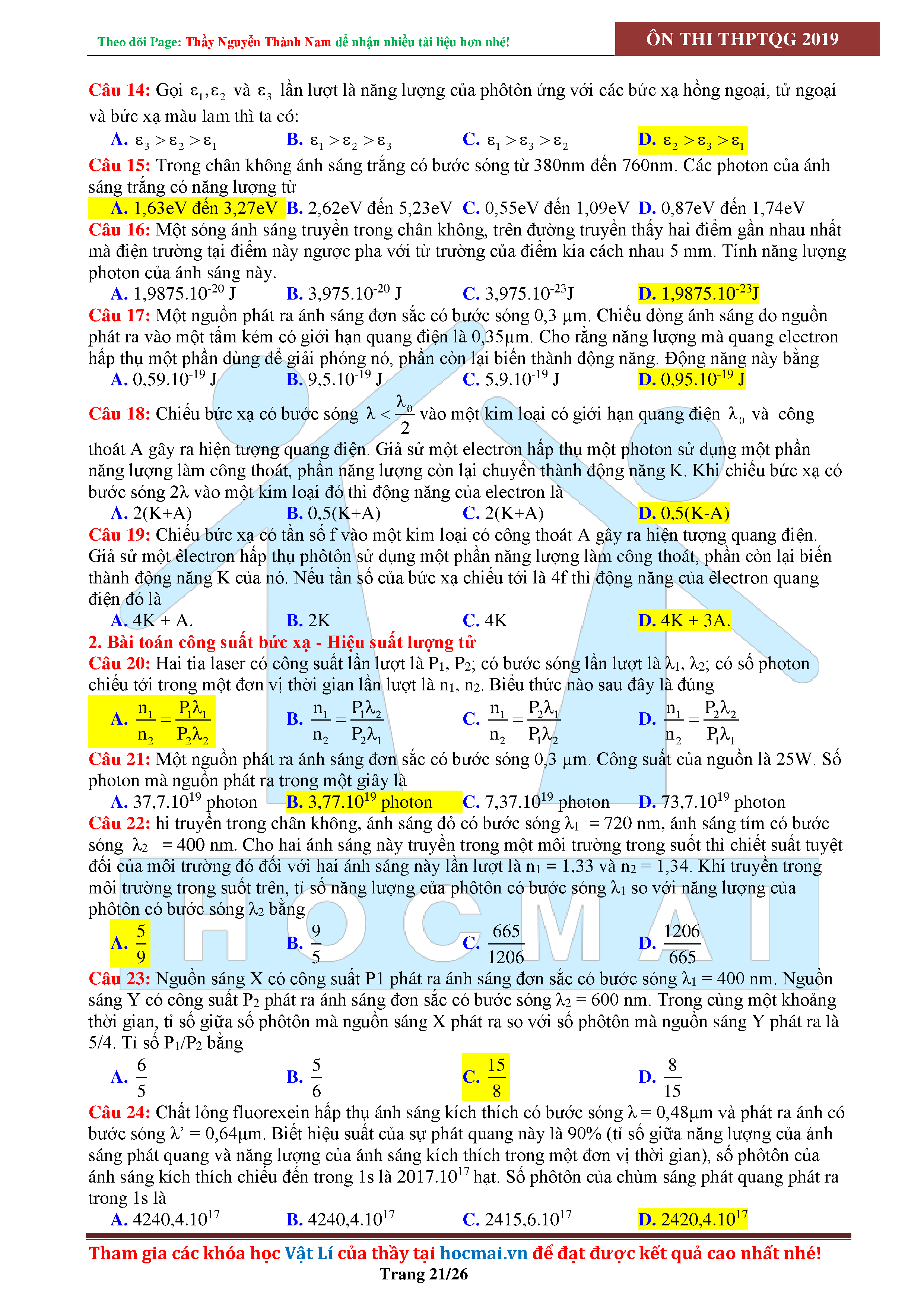 + Hệ thống các câu hỏi về lý thuyết lượng tử ánh sáng (bao gồm cả lý thuyết cơ bản và vận dụng)