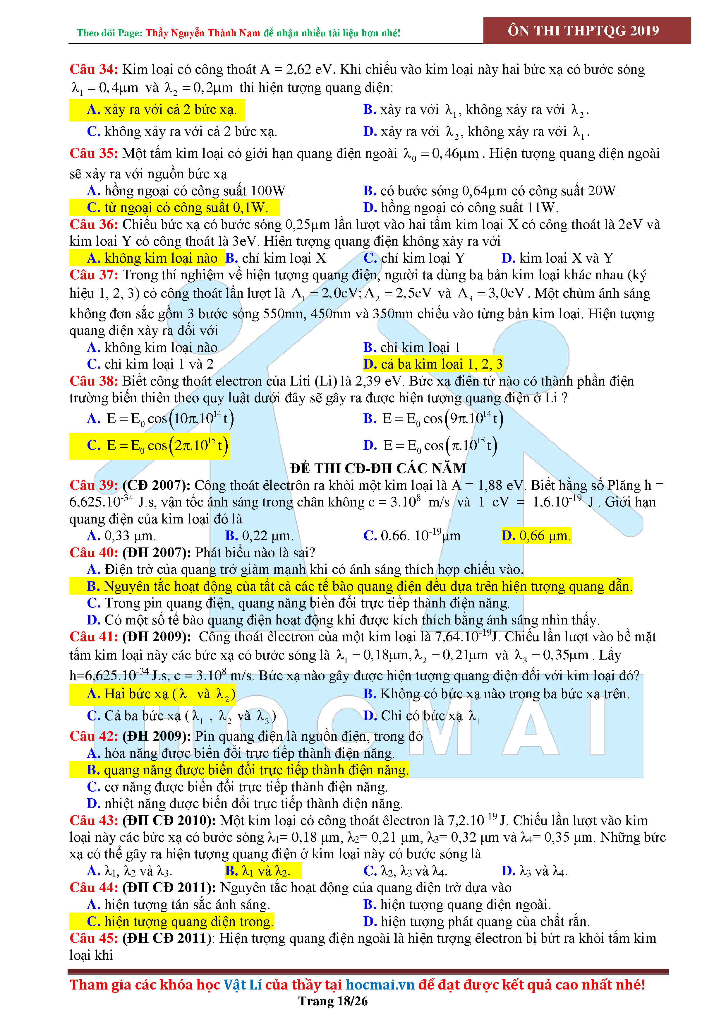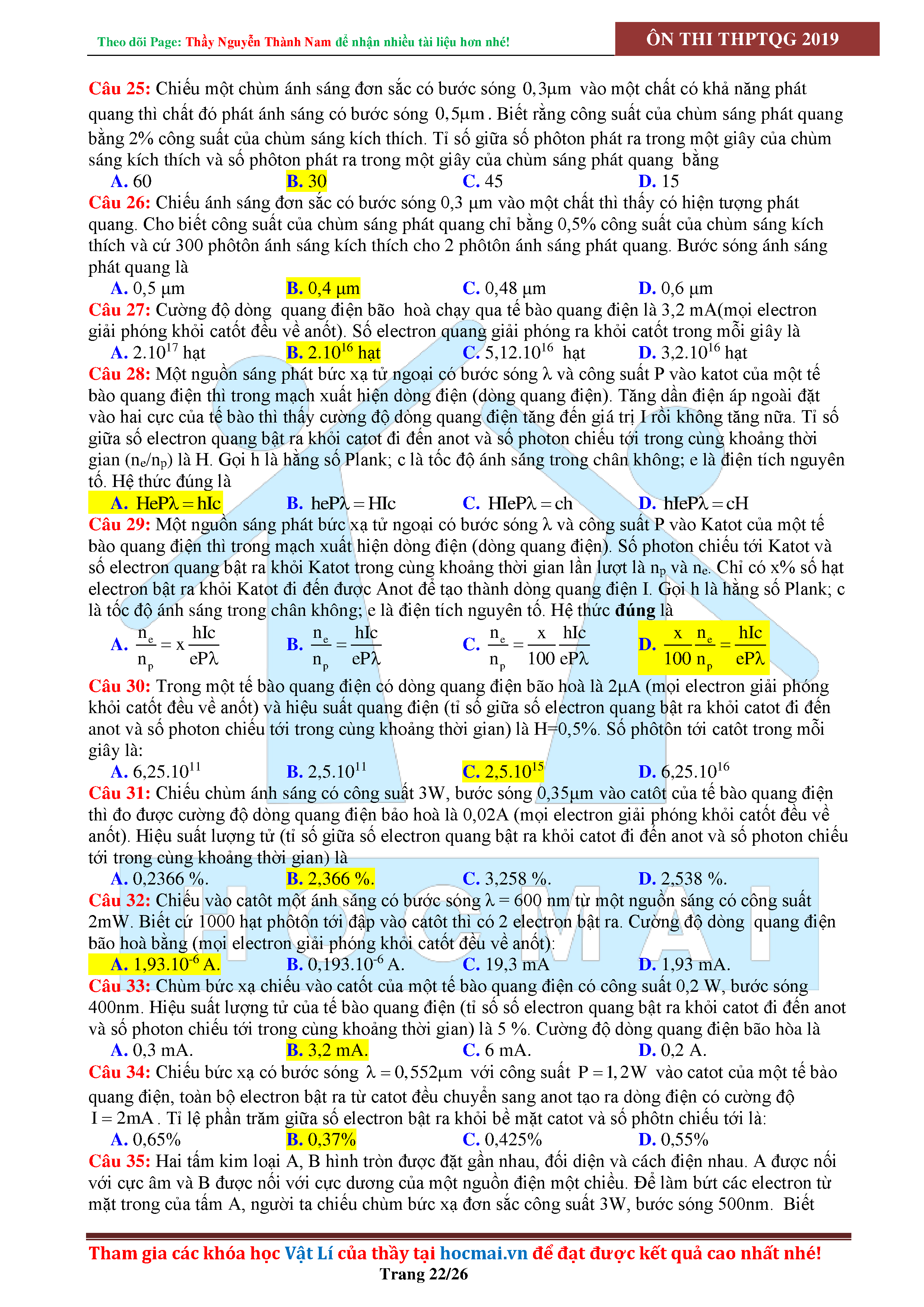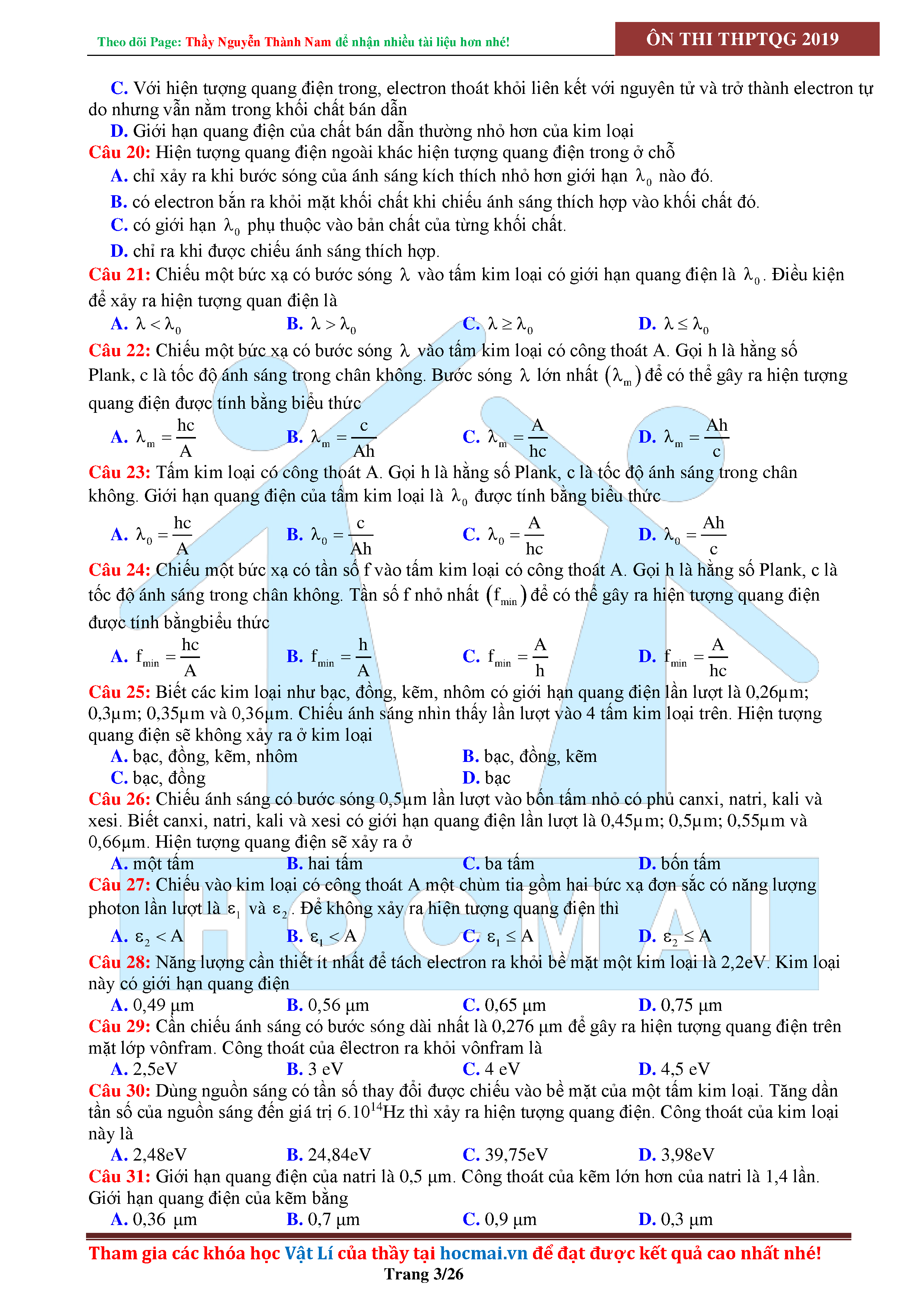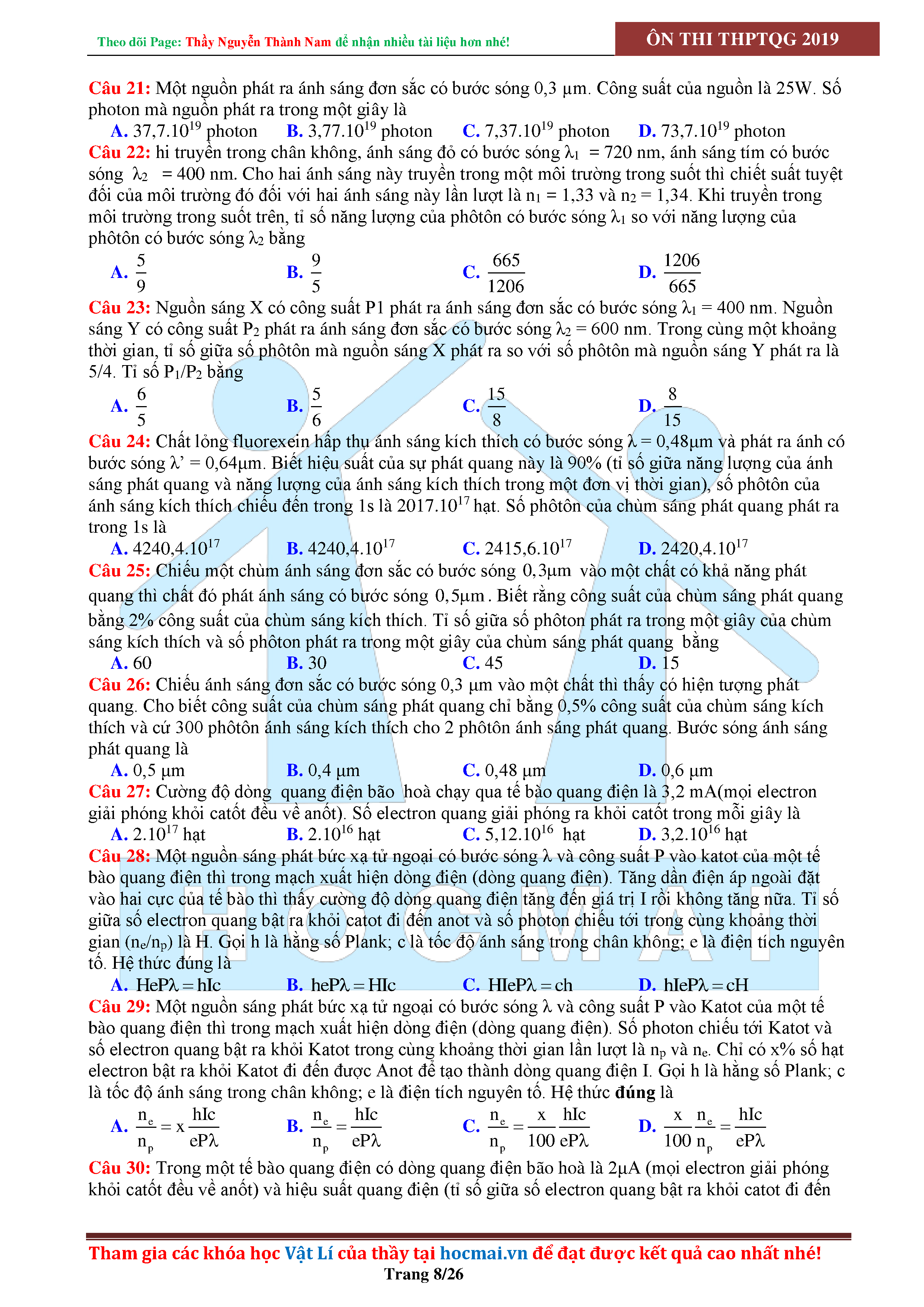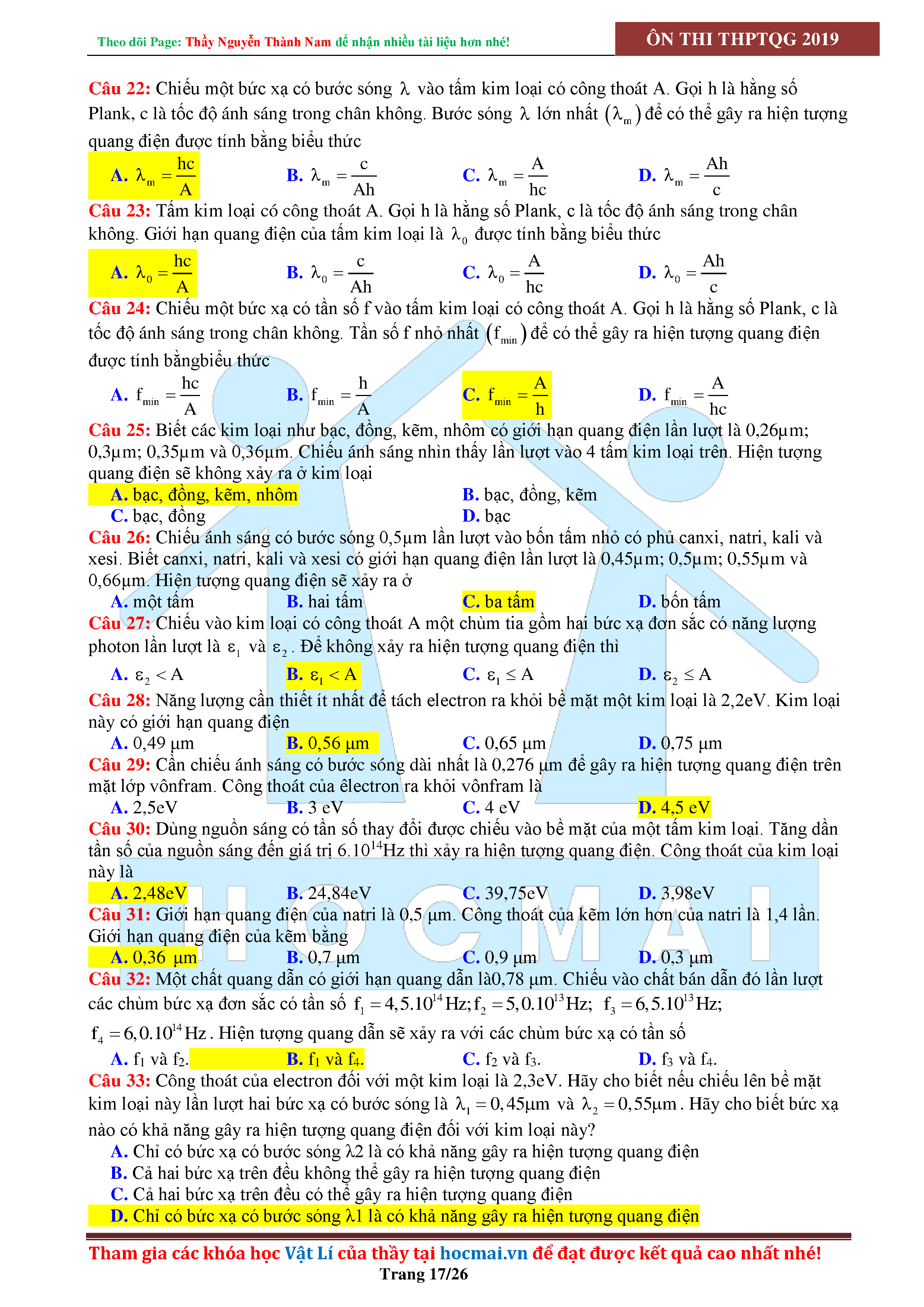 + Hệ thống các câu hỏi về lý thuyết lượng tử ánh sáng (bao gồm cả lý thuyết cơ bản và vận dụng)