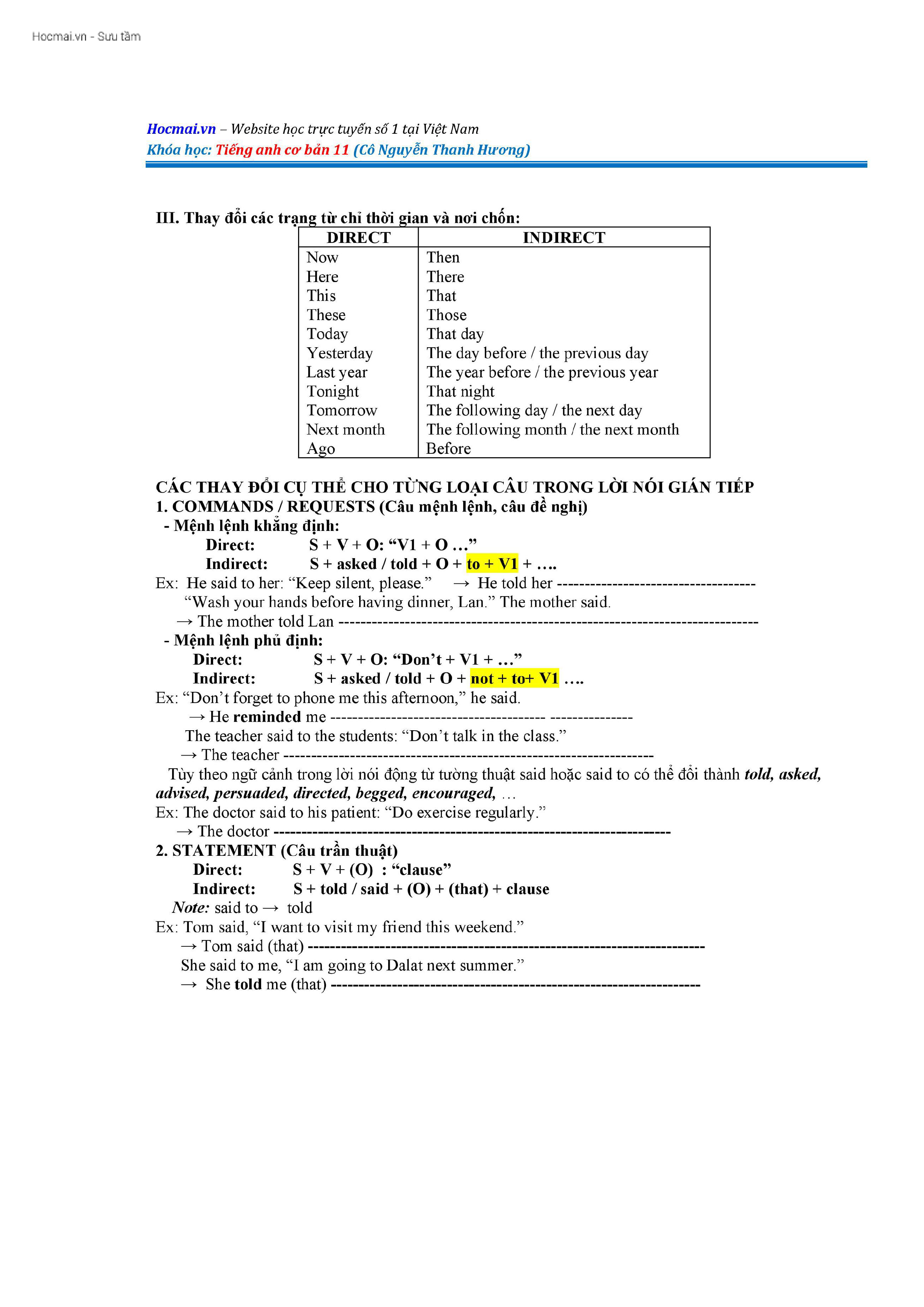 - Các thay đổi cụ thể trong câu tường thuật khác