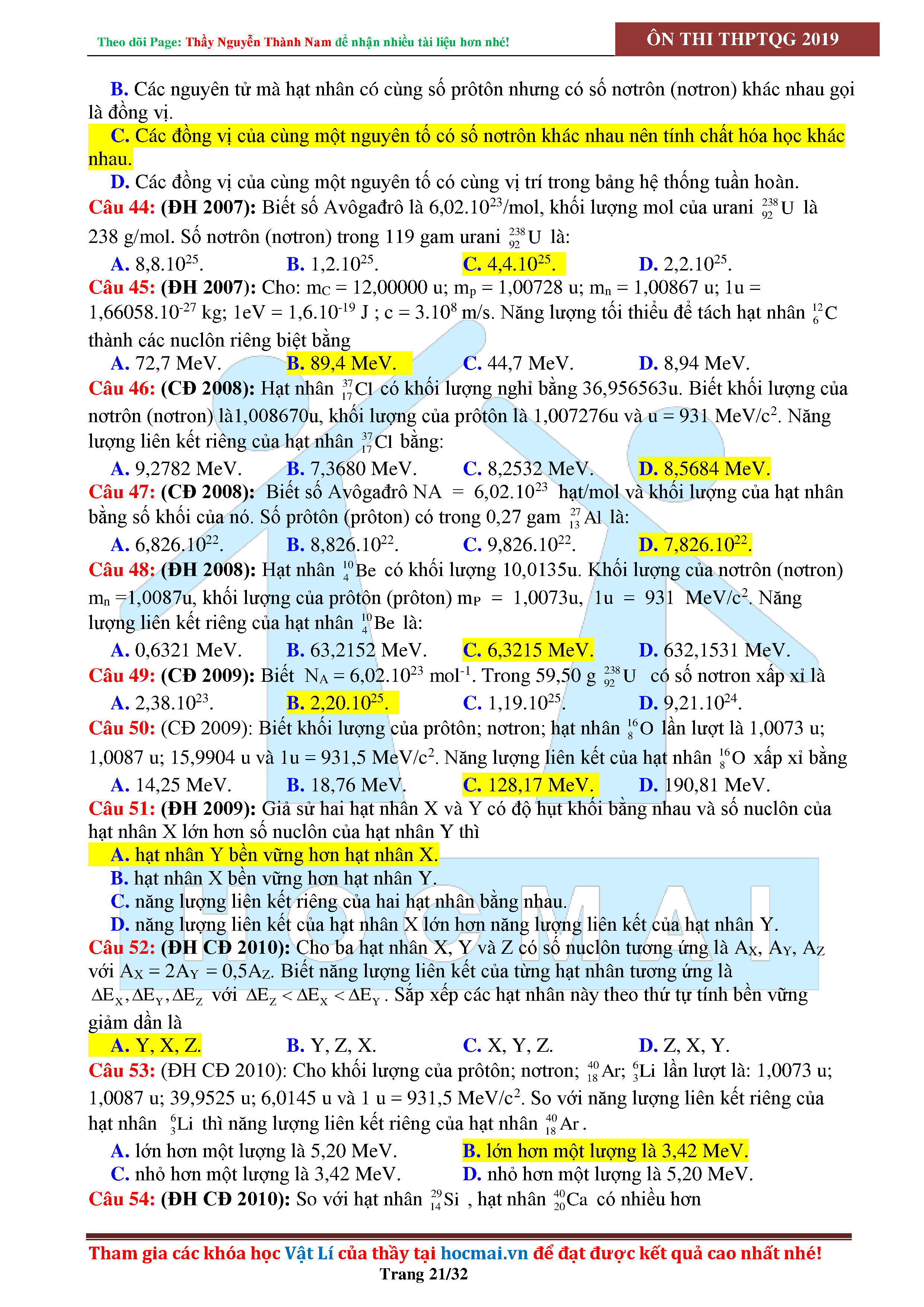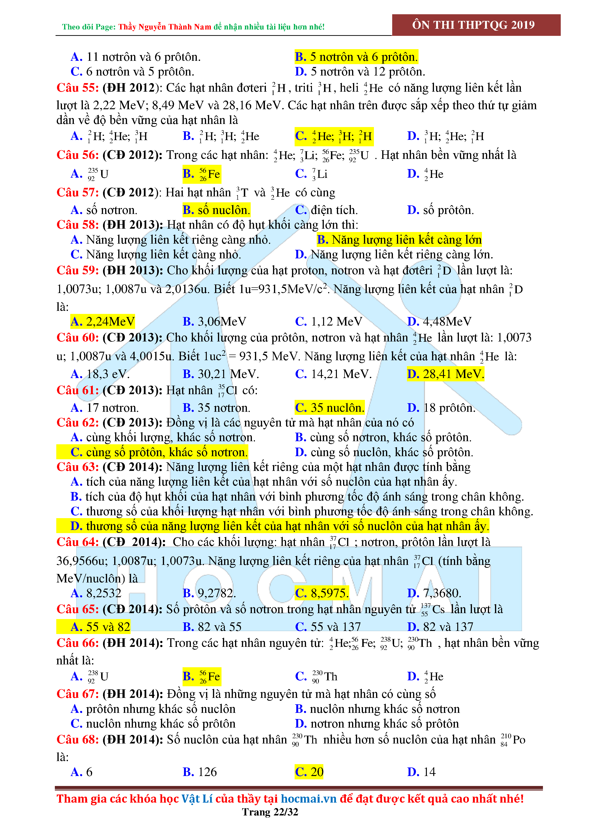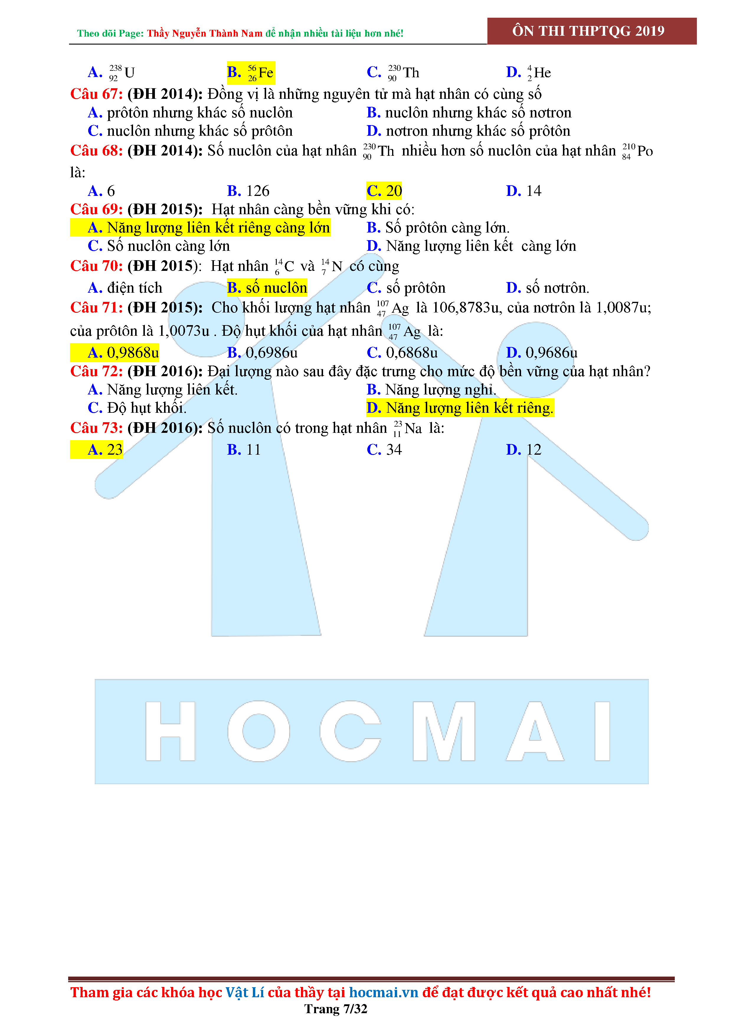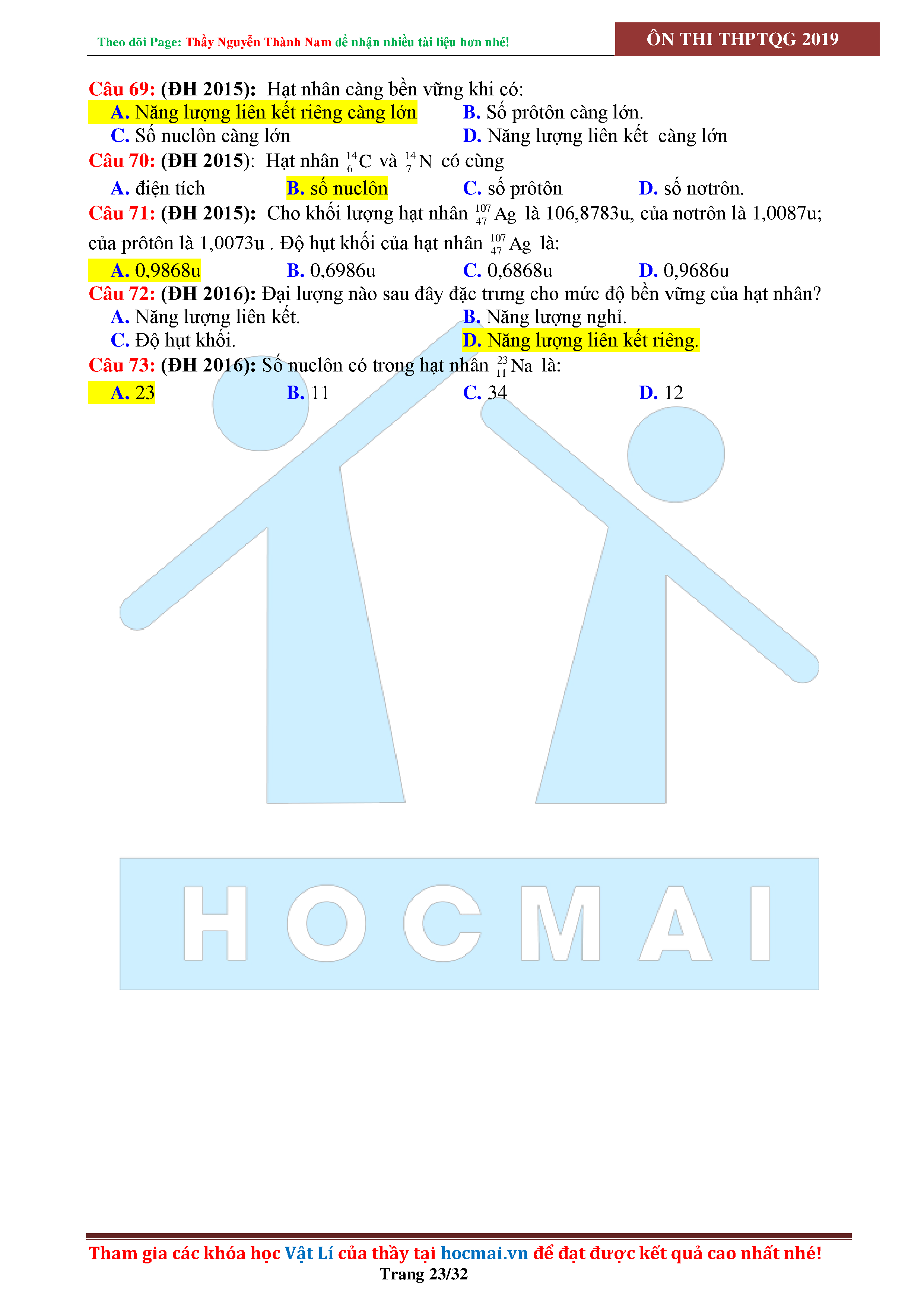 Tài liệu được Học Mãi tổng hợp được trải dài ở nhiều cấp độ từ cơ bản cho tới vận dụng cao và cần phải kết hợp nhiều kiến thức khác nhau, điều này giúp các em học sinh khi làm bài tập có thể ôn tập được toàn bộ kiến thức và công thức chương hạt nhân nguyên tử 12. Bên cạnh đó, bộ tài liệu Bài tập hạt nhân nguyên từ 12 còn có rất nhiều câu hỏi trong các đề thi Đại học, Cao đẳng, tốt nghiệp THPT các năm để các em học sinh có thể sớm cọ xát với cách ra đề, từ đó luyện tập được phản xạ, tư duy là bài và có phương án ôn thi một cách nhanh chóng và hiệu quả nhất.