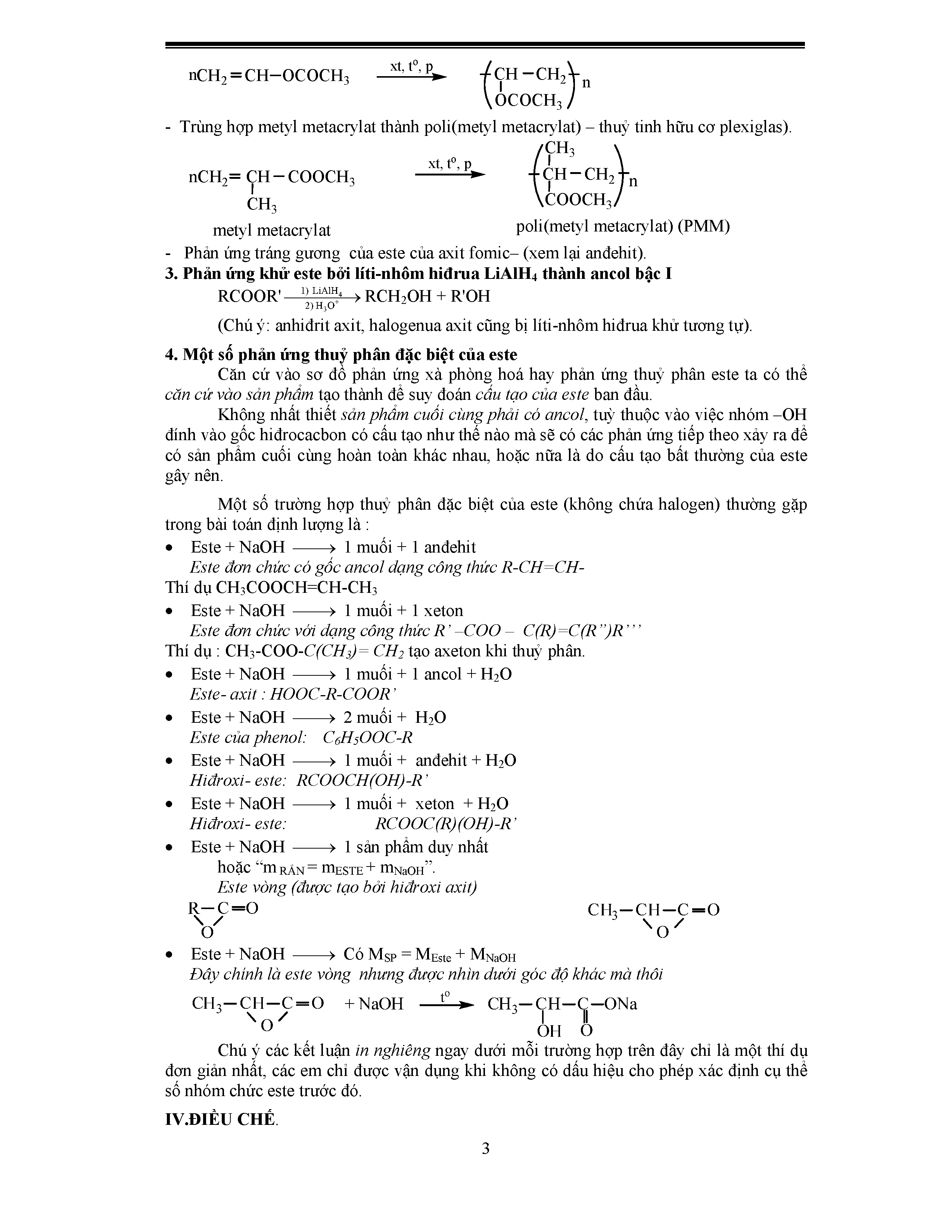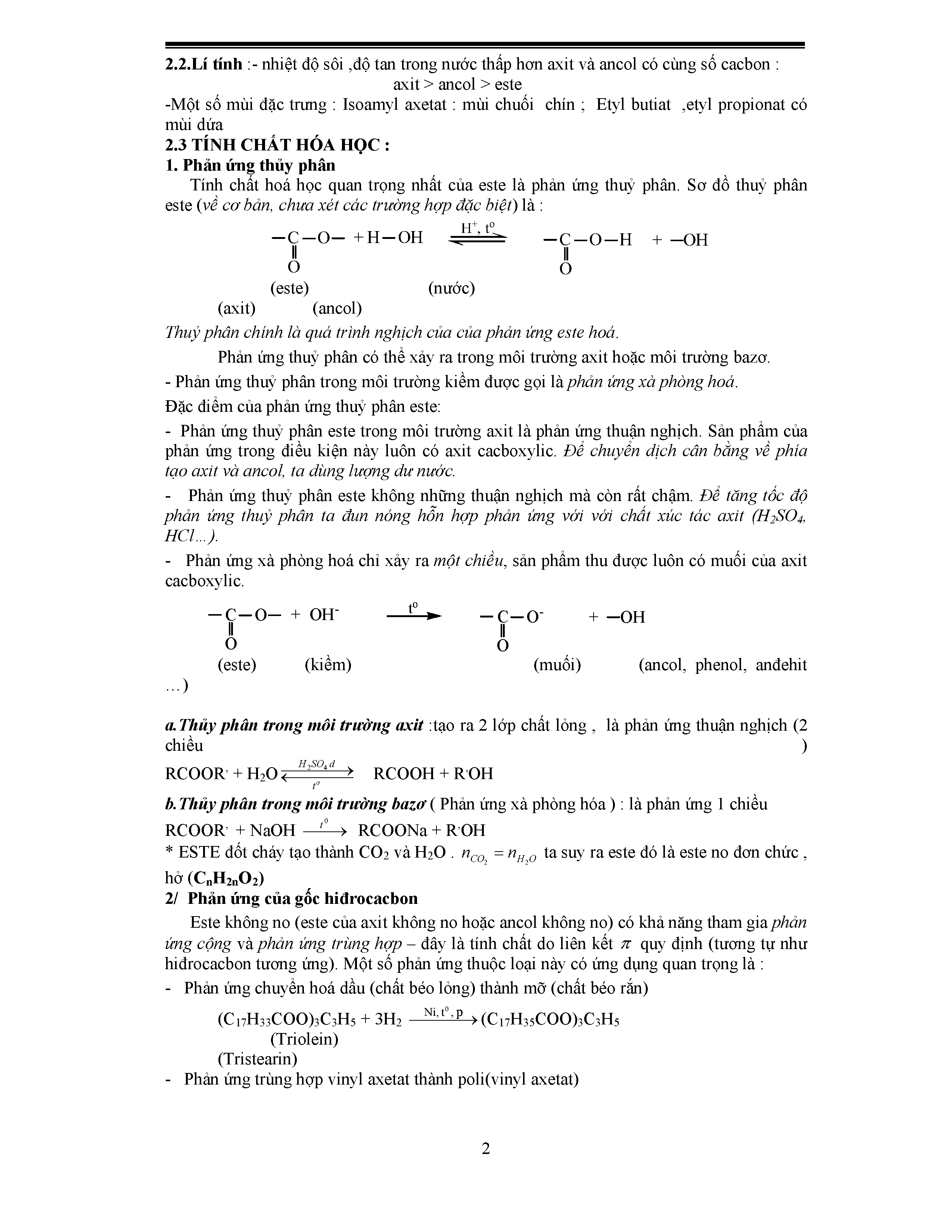 - Tính chất hóa học của este: phản ứng thủy phân, thủy phân trong môi trường axit, thủy phân trong môi trường bazo, phản ứng của gốc hidrocacbon, các phản ứng thủy phân đặc biệt của este