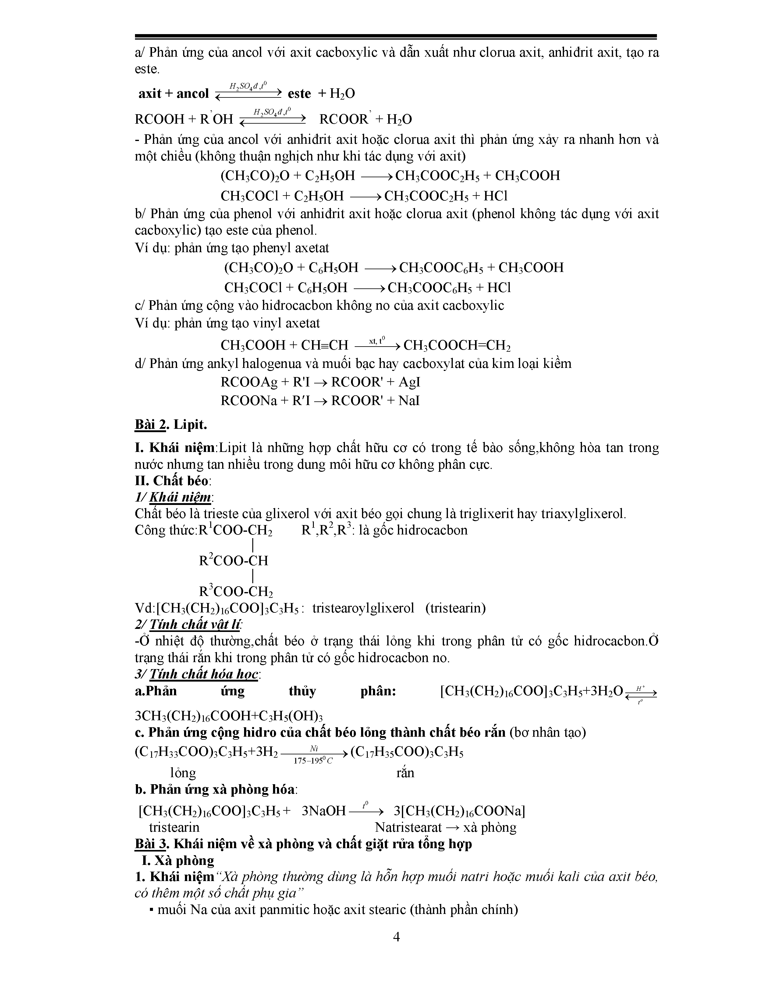 - Tính chất hóa học của chất béo: phản ứng thủy phân, phản ứng cộng hidro của chất béo lỏng thành chất béo rắn, phản ứng xà phòng hóa