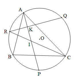 $$ \Rightarrow $$ $$ \widehat{AKR}=\frac{1}{2} $$ (sđ $$ \overset\frown{AR}\,+ $$ sđ $$ \overset\frown{PQ} $$ ) $$ =\frac{1}{2} $$ (sđ $$ \overset\frown{AR}\,+ $$ sđ $$ \overset\frown{QC}+ $$ sđ $$ \overset\frown{PC} $$ )