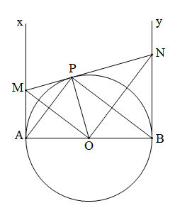 Bài 37 (trang 126 SGK Toán 9 tập 2): Cho nửa đường tròn tâm O, đường kính AB = 2R, Ax và By là hai tiếp tuyến với nửa đường tròn tại A và B. Lấy trên tia Ax điểm M rồi vẽ tiếp tuyến MP cắt By tại N.