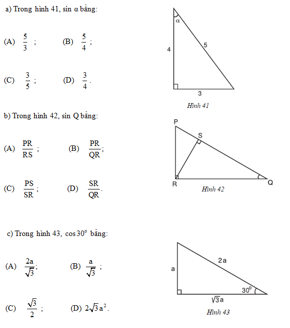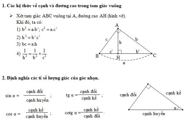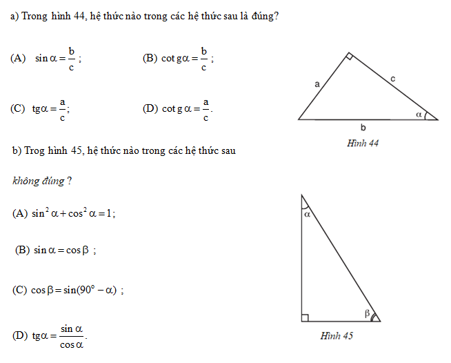 Vì $$ \sin \alpha =\frac{a}{b}\,\,; $$ $$ tg\alpha =\frac{a}{c}\,\,; $$ $$ \cot g\,\alpha =\frac{c}{a} $$ .