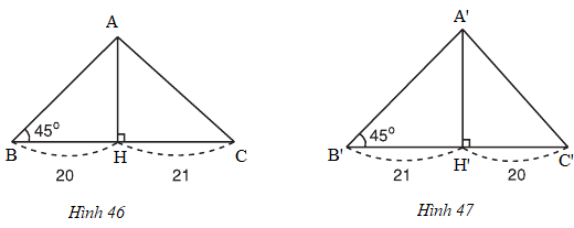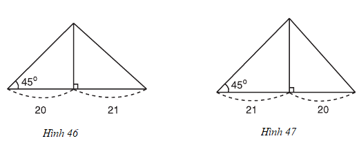 Bài 36 (trang 94 SGK Toán 9 tập 1): Cho tam giác có một góc bằng \[{{45}^{o}}.\] Đường cao chia một cạnh kề với góc đó thành các phần 20cm và 21 cm. Tính cạnh lớn trong hai cạnh còn lại (lưu ý có hai trường hợp hình 46 và hình 47).