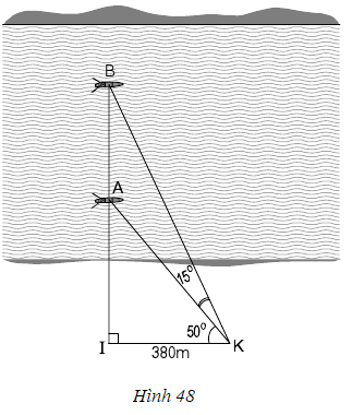 Bài 38 (trang 95 SGK Toán 9 tập 1): Hai chiếc thuyền A và B ở vị trí được minh họa như trong hình 48. Tính khoảng cách giữa chúng (làm tròn đến mét).