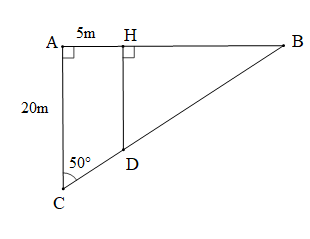 \[AB=AC\tan {{50}^{o}}=20.\tan {{50}^{o}}\approx 24m\].