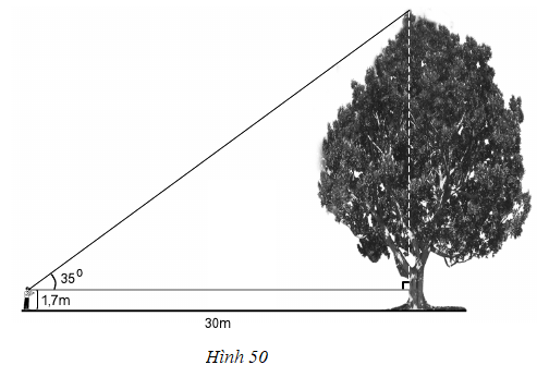 Bài 40 (trang 95 SGK Toán 9 tập 1): Tính chiều cao của cây trong hình 50 (làm tròn đến đề-xi-mét).