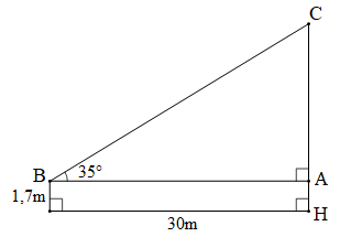 \[AC=AB.\tan {{35}^{o}}=30.\tan {{35}^{o}}\approx 21\left( m \right)\].